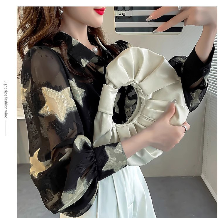 올해 인기있는 아름다운 탑 작은 별 인쇄 자수 셔츠 여성용 가을 쉬폰 슬림 랜턴 소매 셔츠