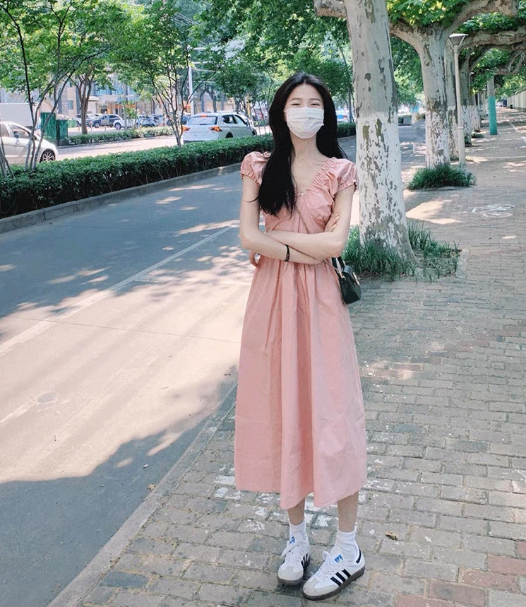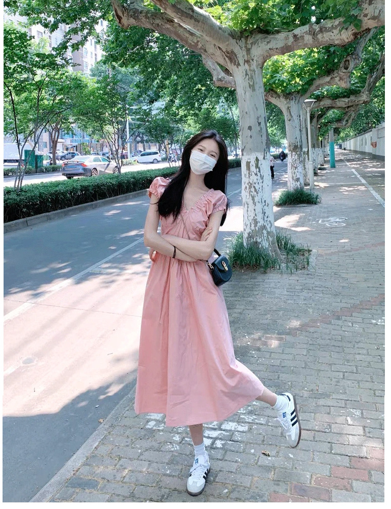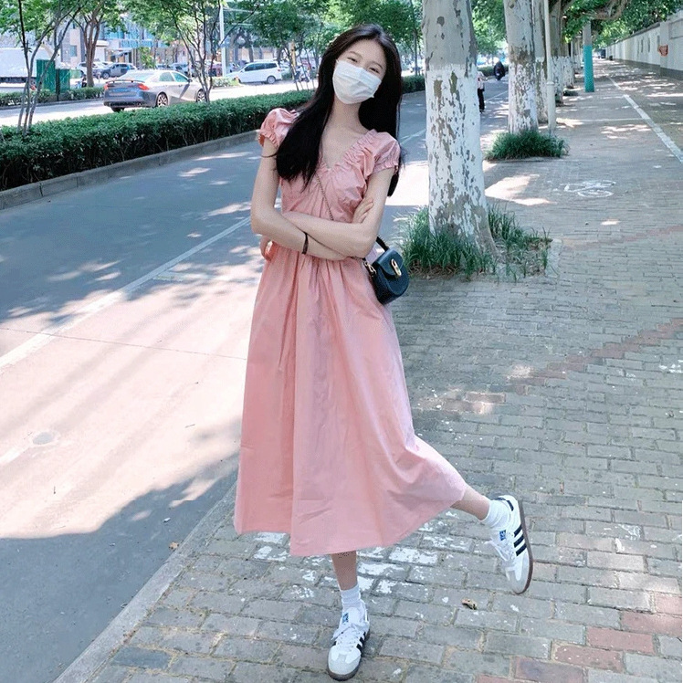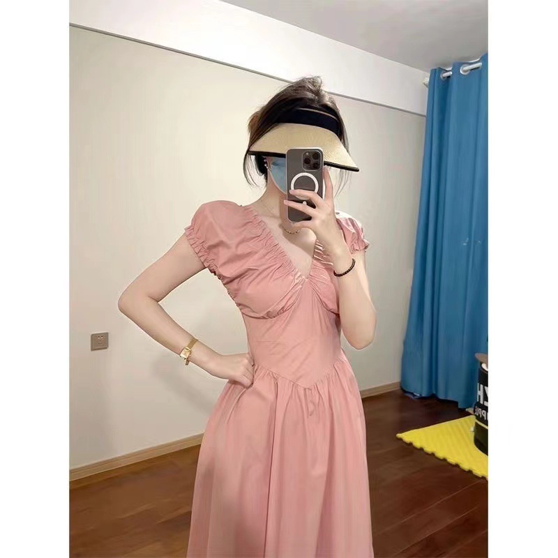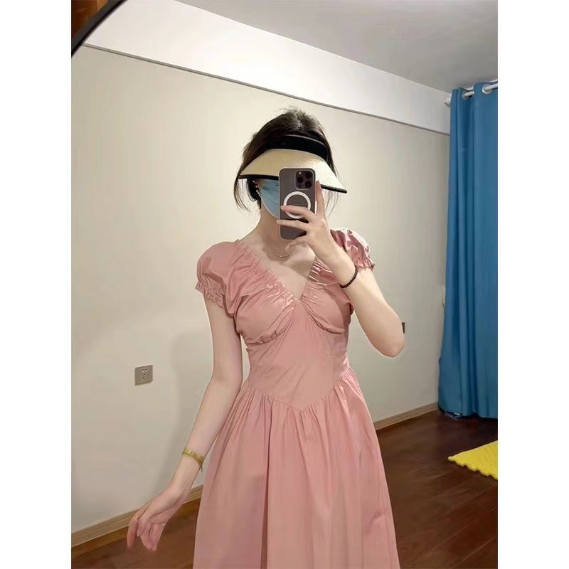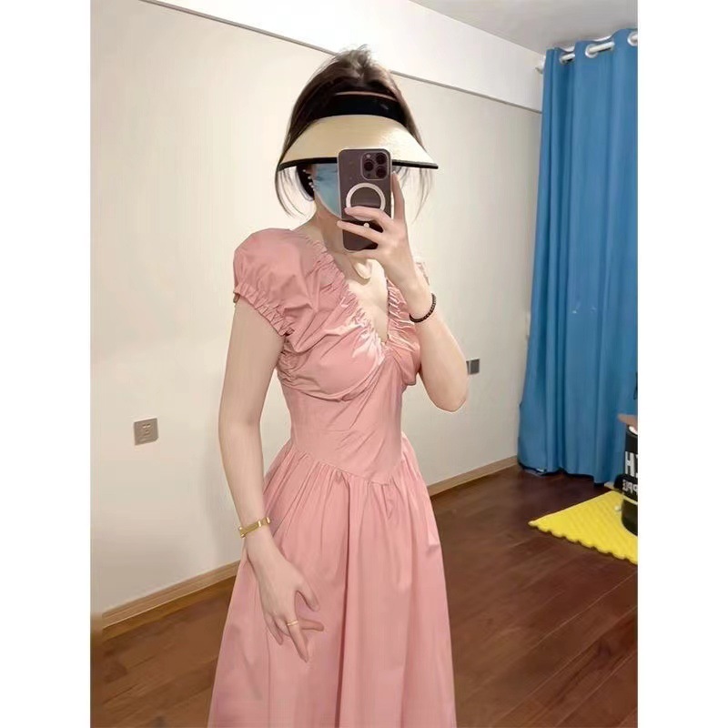 도파민 핑크 V 넥 원피스 여성 2024 년 여름 새로운 타이트 허리 슬리밍 부드러운 반팔 긴 원피스스토어 가기