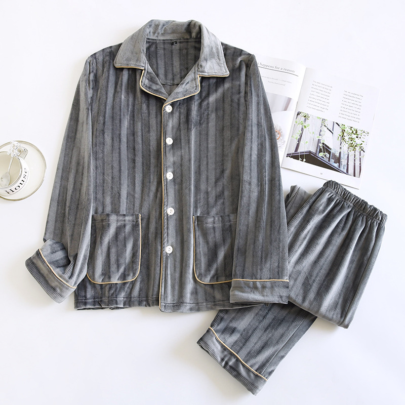 가을과 겨울 수직 스트립 섬 벨벳 커플 잠옷 여성의 따뜻한 간단한 플란넬 느슨한 플러스 사이즈 남성 홈 의류 세트