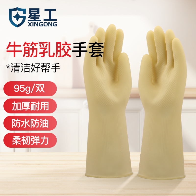 Xinggong 쇠고기 Tendon 라텍스 산업 두꺼운 가정용 청소 방수 산 및 알칼리 저항하는 고무 장갑스토어 가기