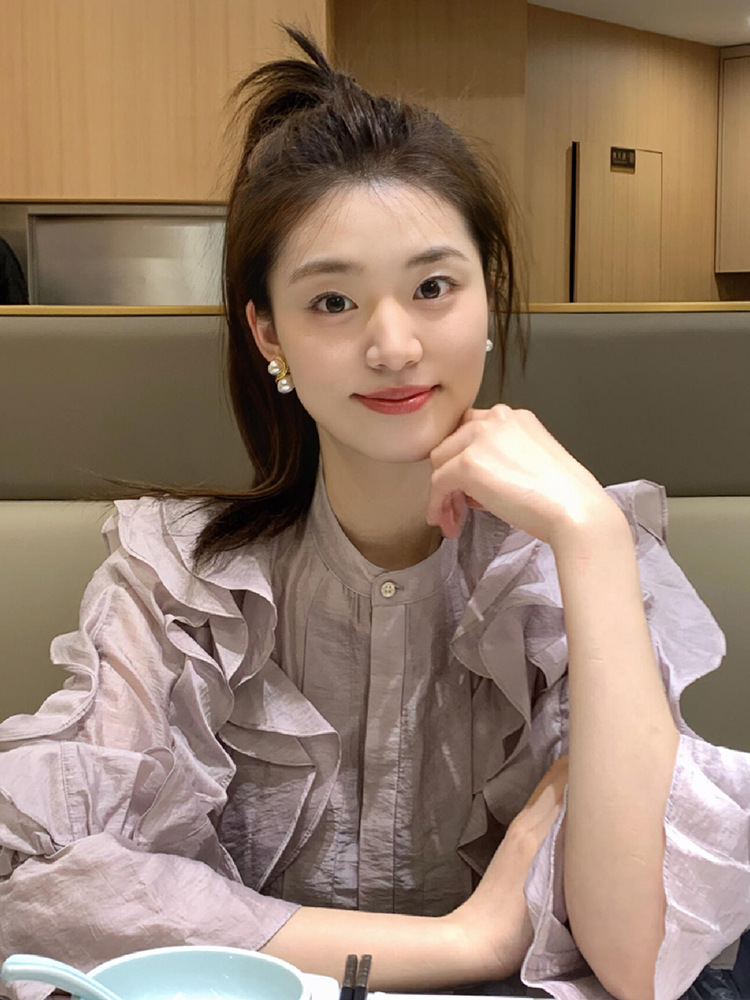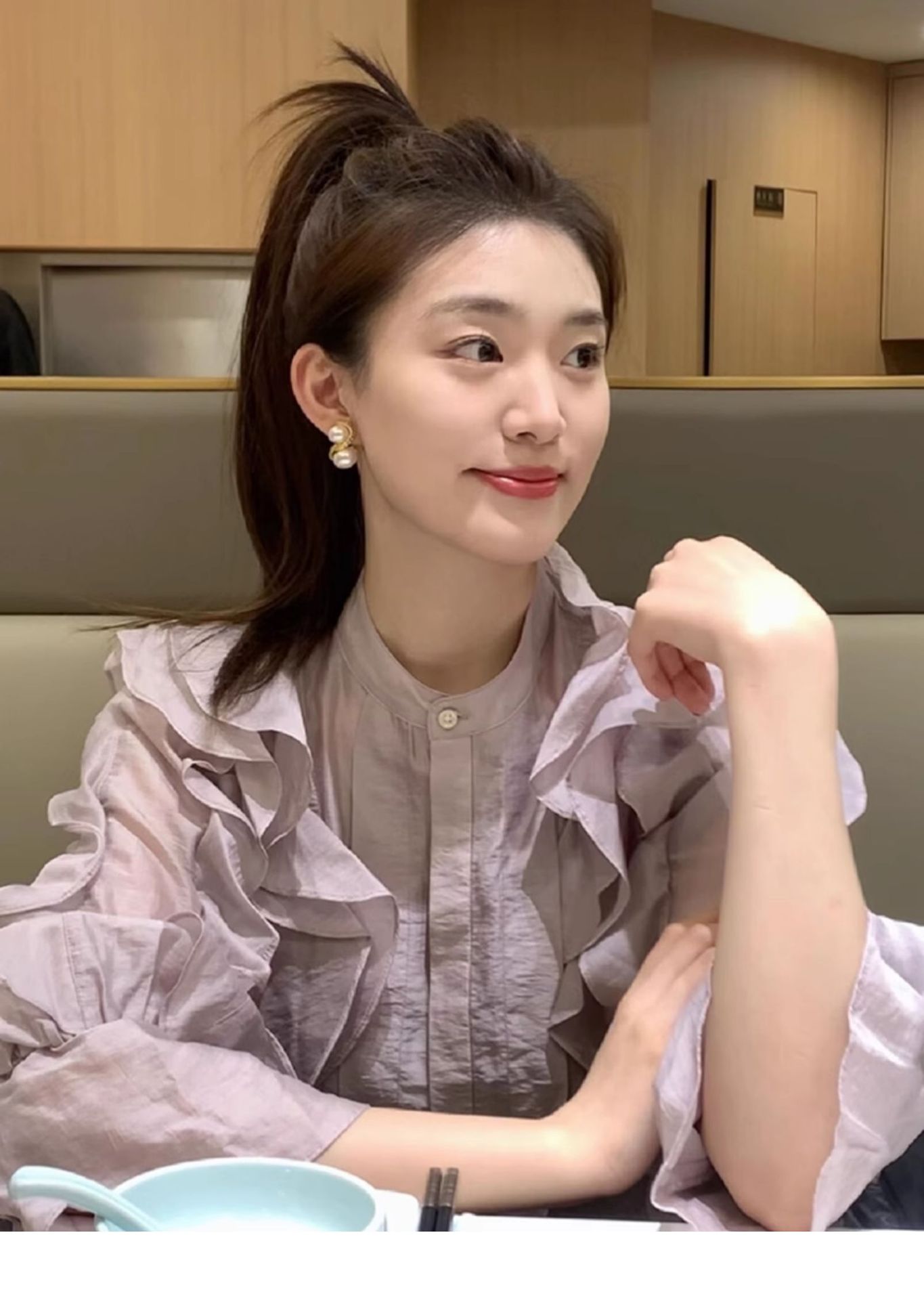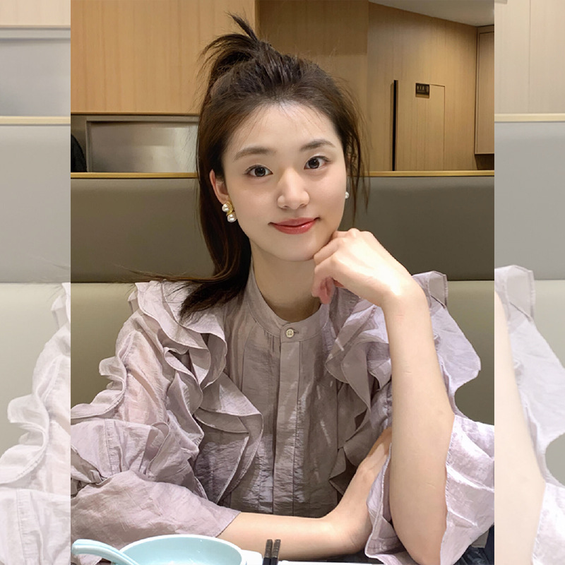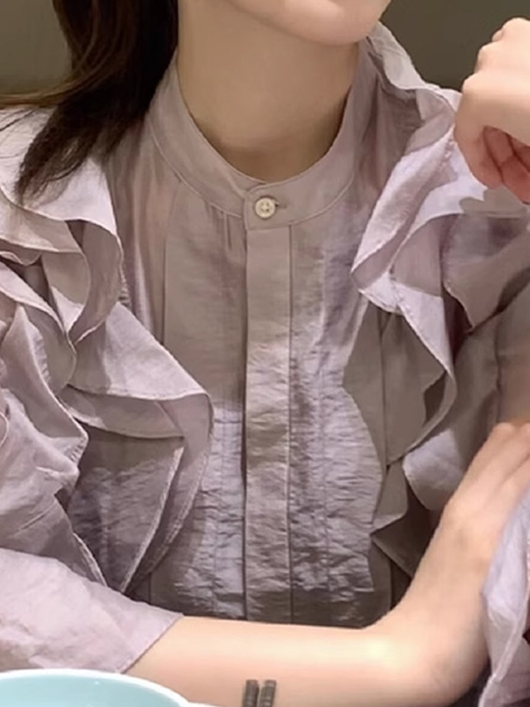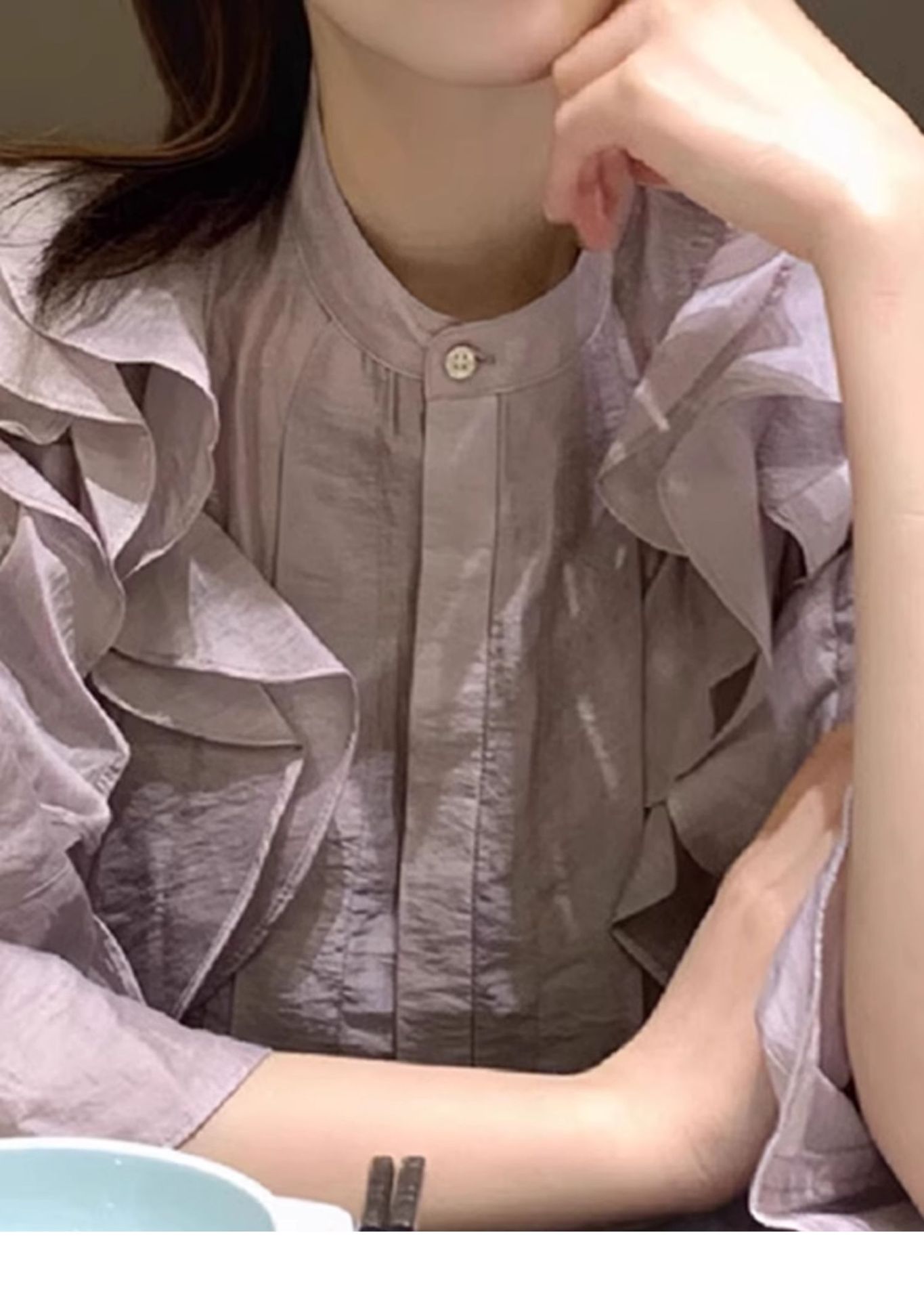 여성을위한 프렌치 퍼플 프릴 반팔 쉬폰 셔츠 2024 뉴 여름 하이 엔드 퍼프 슬리브 탑