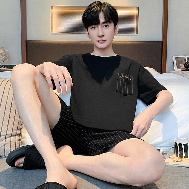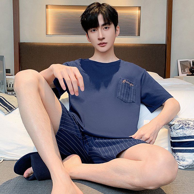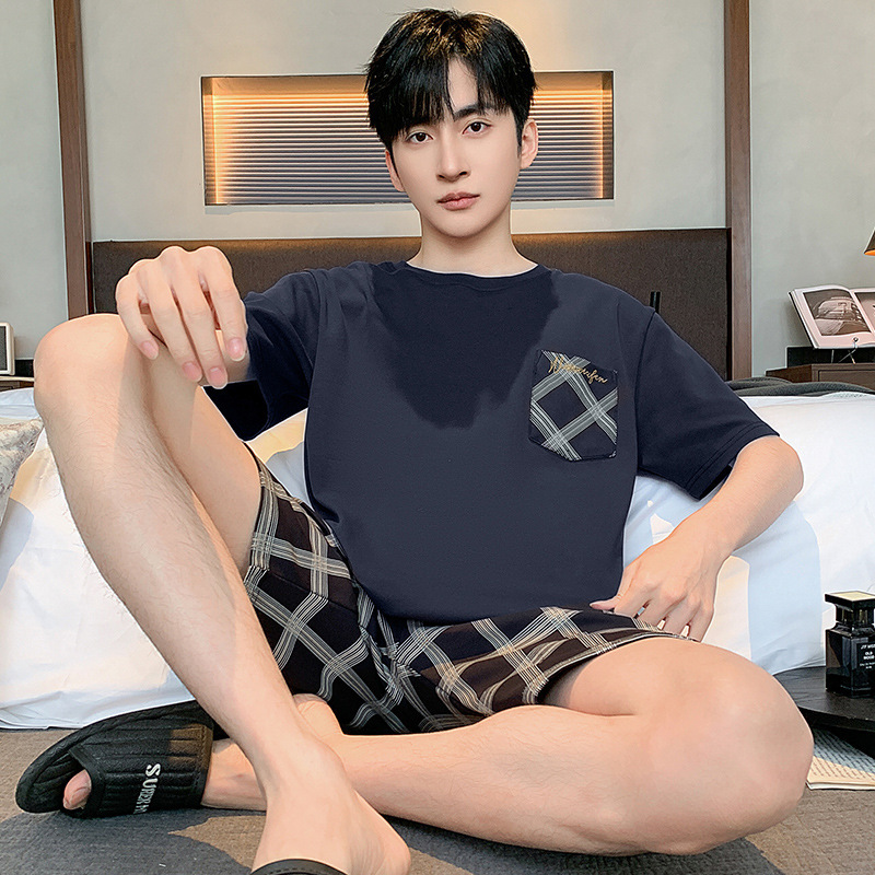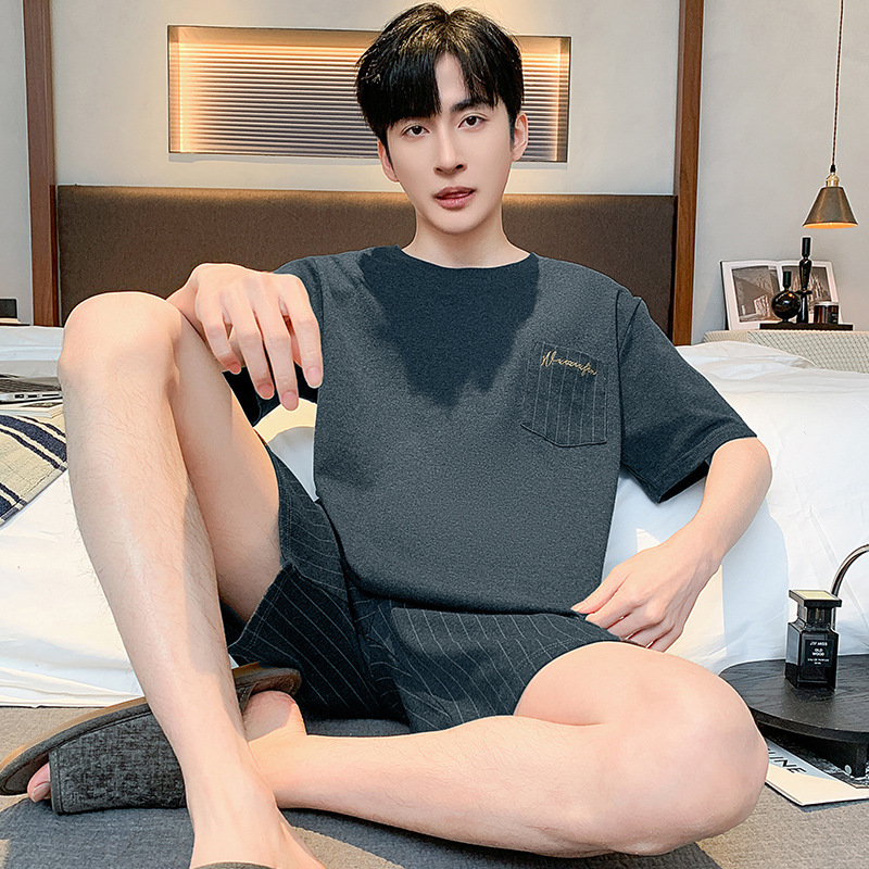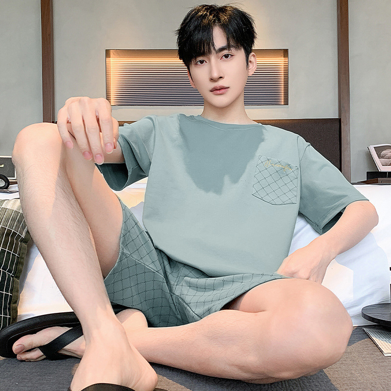 남성용 겉옷 파자마 2024 새로운 여름 솔리드 컬러 코튼 남성용 짧은 소매 반바지 홈 착용 얇은 세트스토어 가기