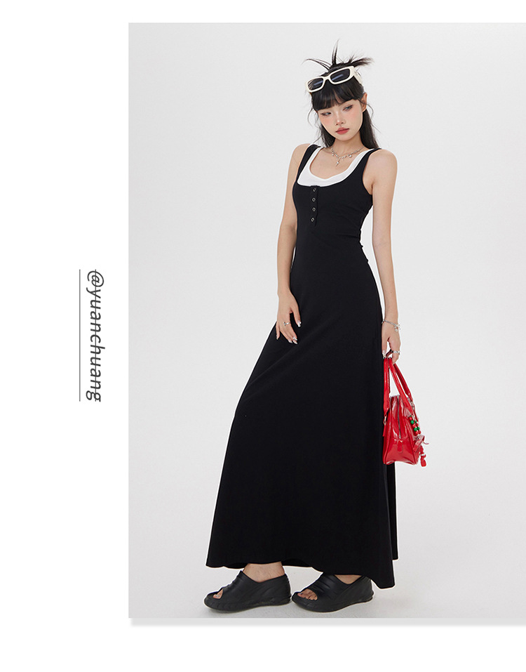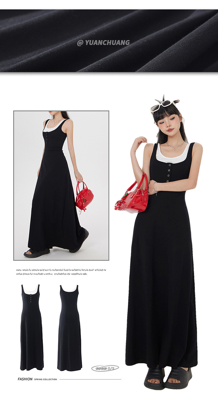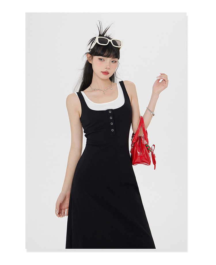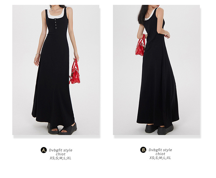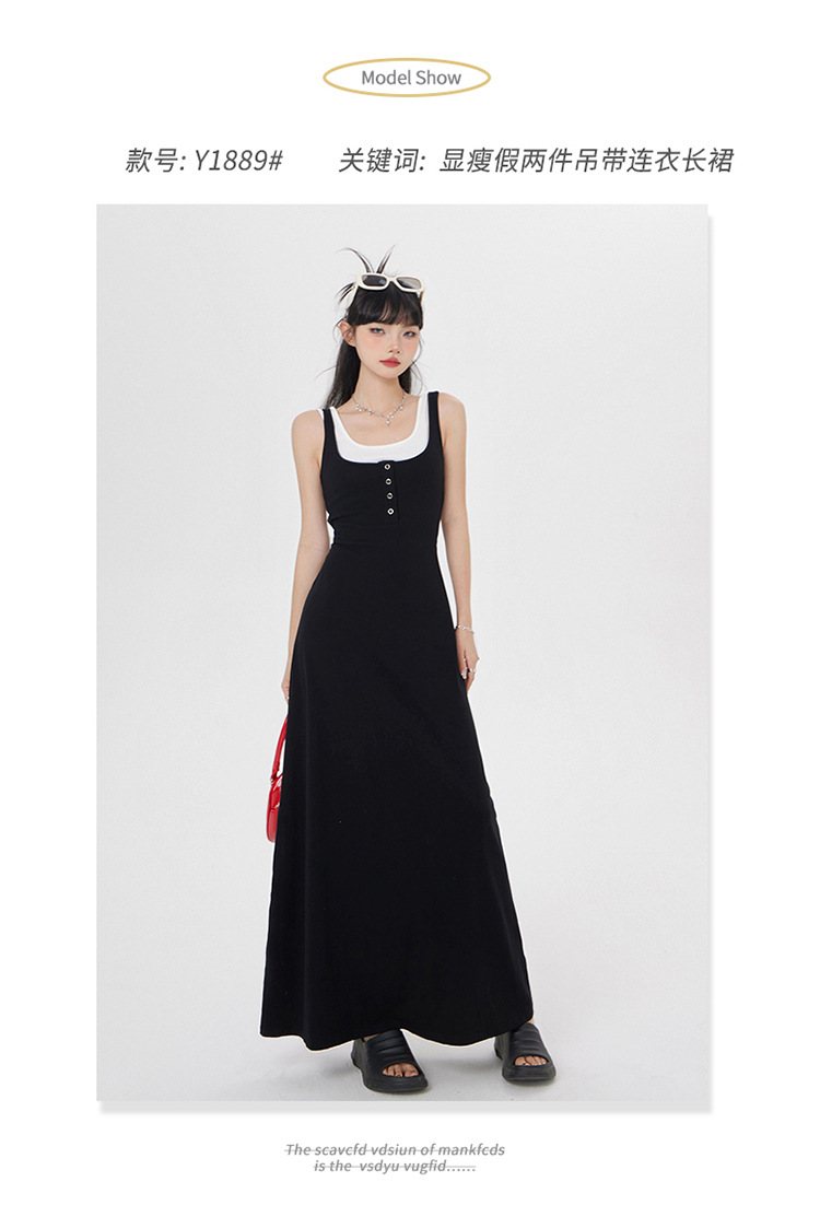 가짜 투피스 블랙 슬링 원피스 어린이 여름 2024 새로운 배 모양의 그림 프랑스 스타일 우아한 조끼 긴 원피스스토어 가기
