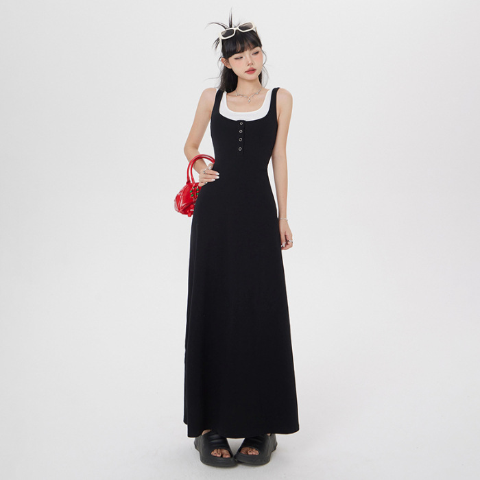 가짜 투피스 블랙 슬링 원피스 어린이 여름 2024 새로운 배 모양의 그림 프랑스 스타일 우아한 조끼 긴 원피스