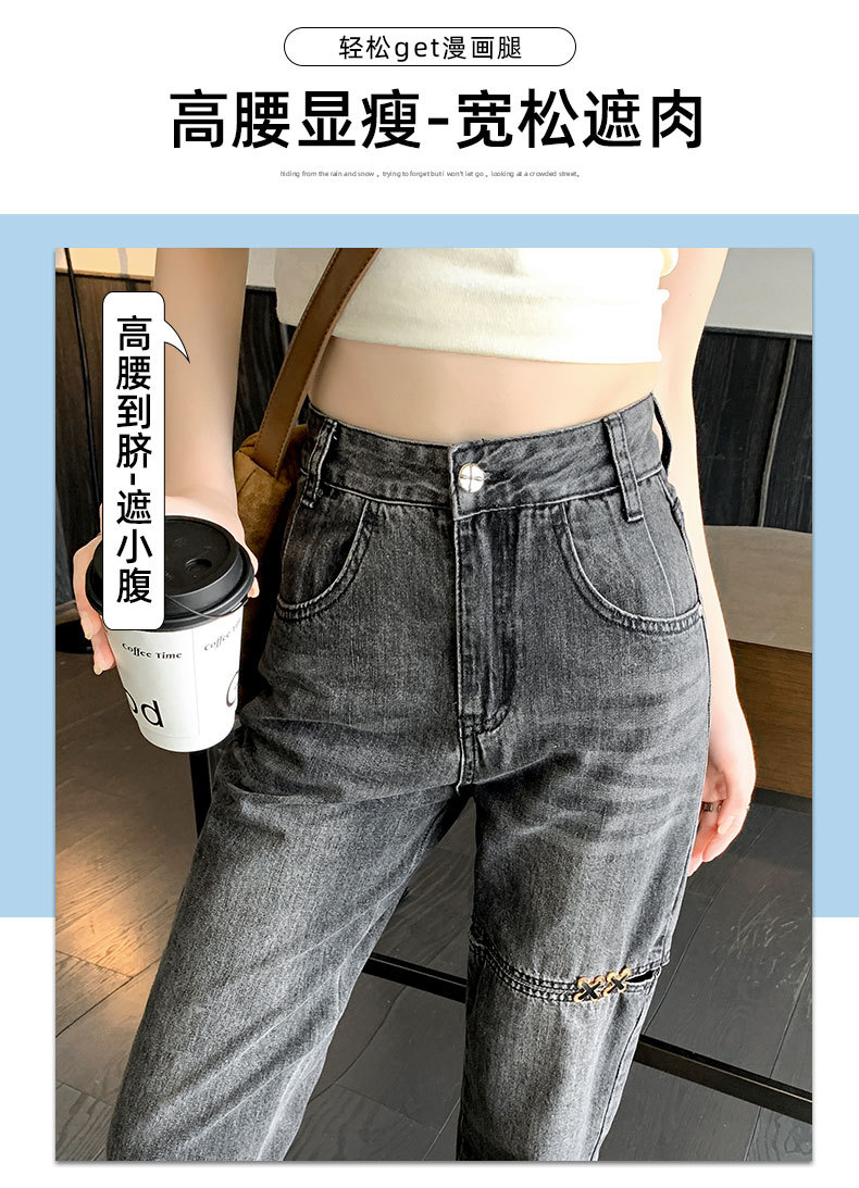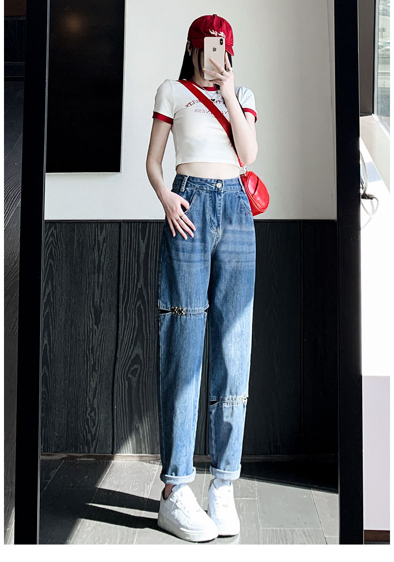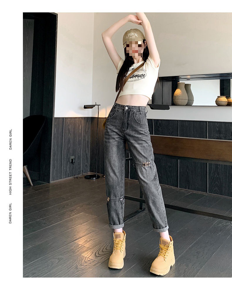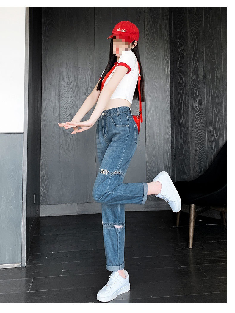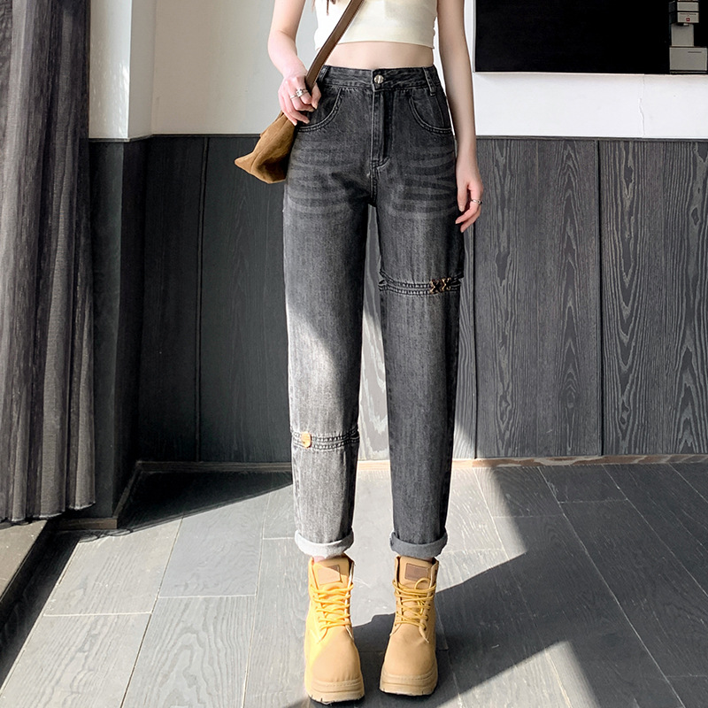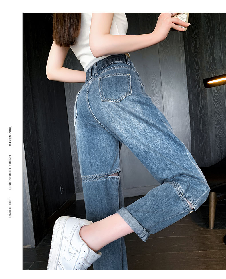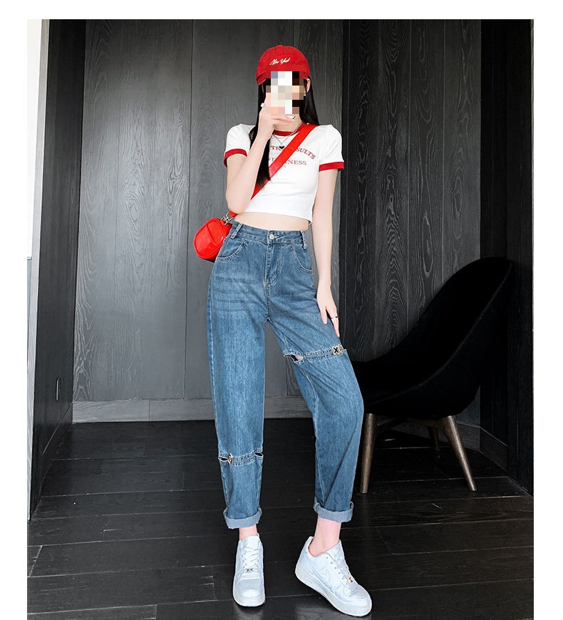 불규칙한 찢어진 청바지 여자 여름 얇은 높은 허리 거지 레트로 넓은 다리 느슨한 슬리밍 할란 아빠 바지스토어 가기