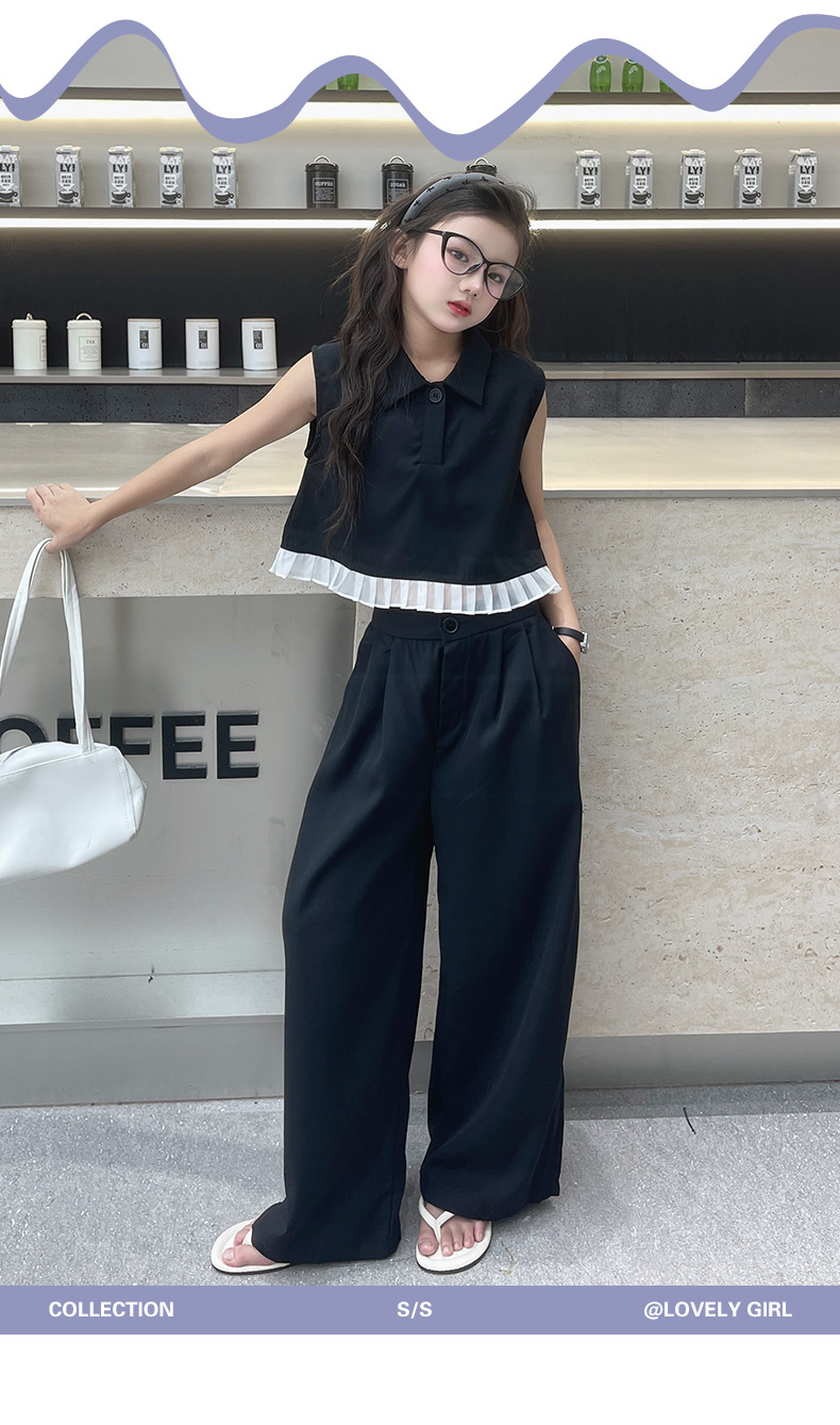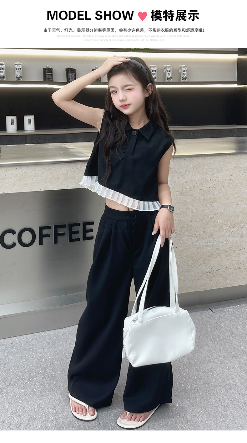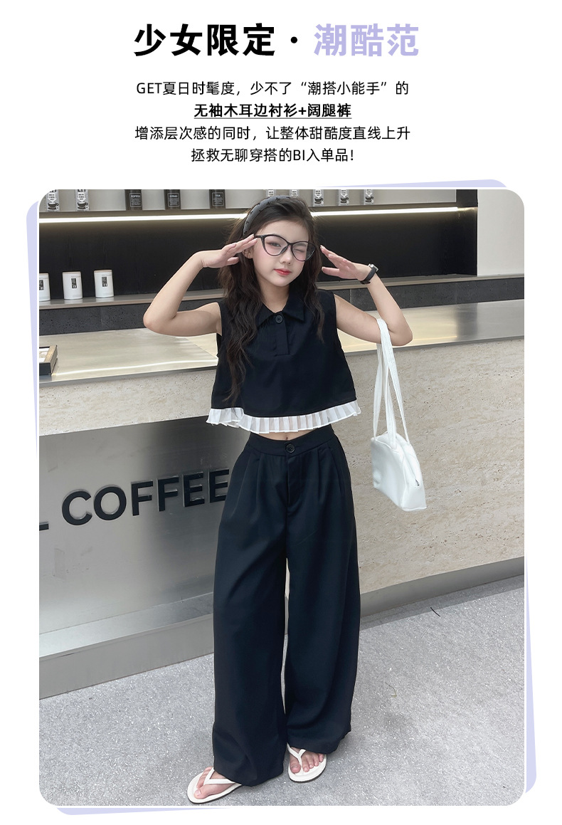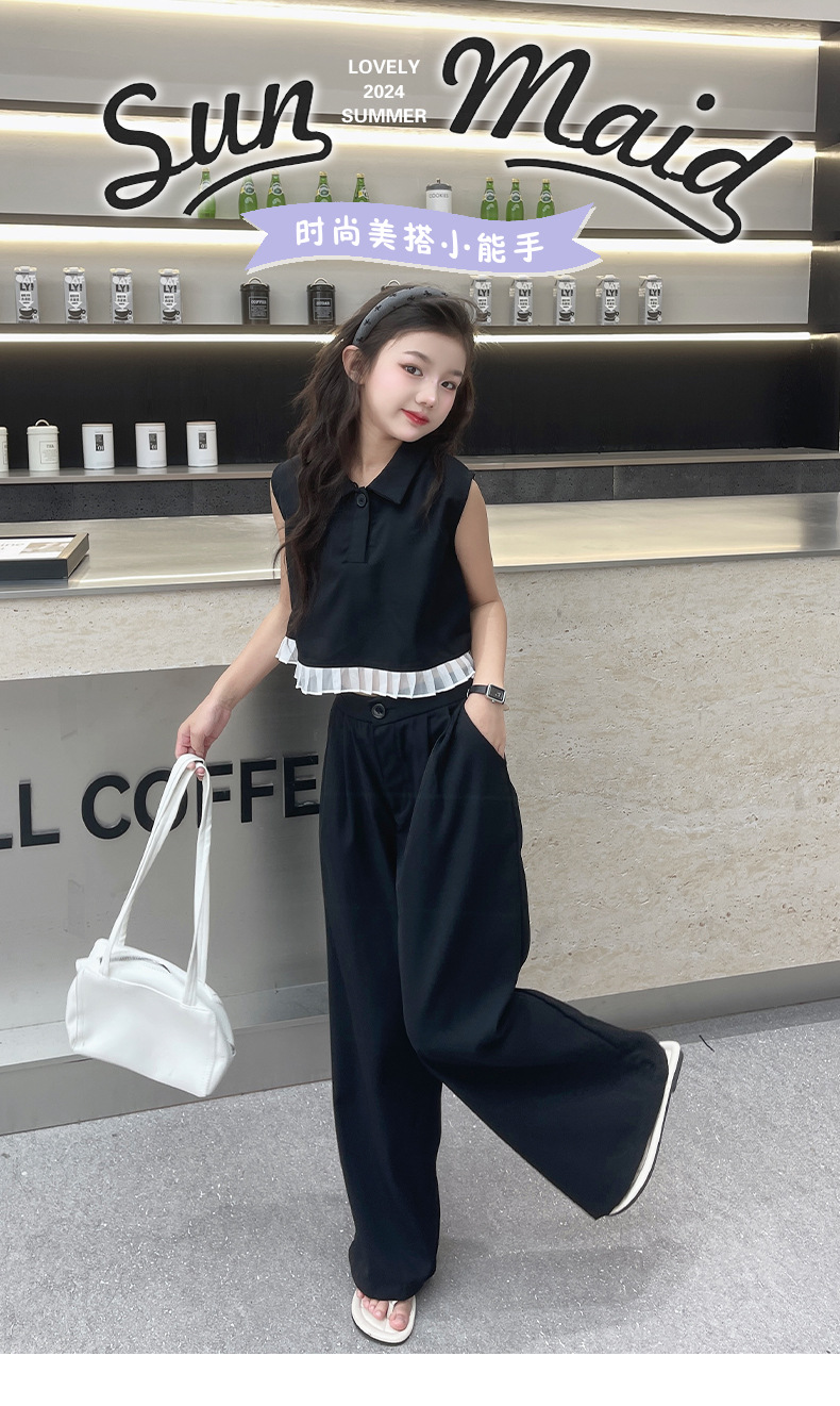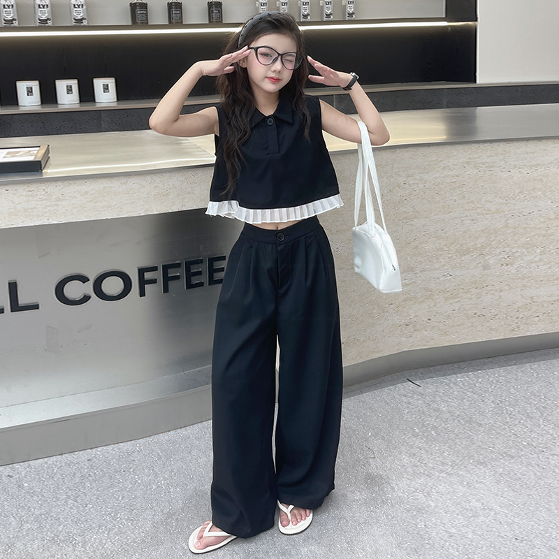 소녀 여름 세트 2024 새로운 어린이 캐주얼 스포츠 민소매 여름 원피스 큰 어린이 넓은 다리 바지 투피스 세트 트렌디스토어 가기