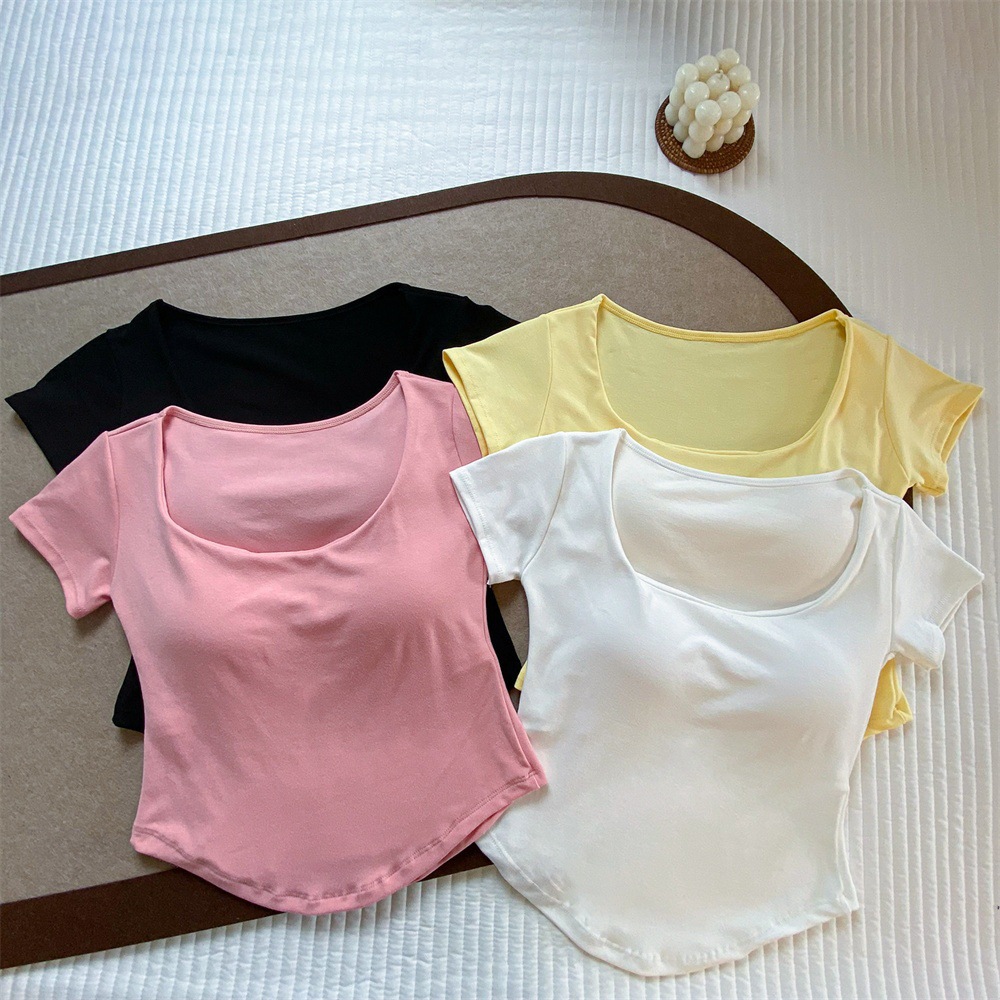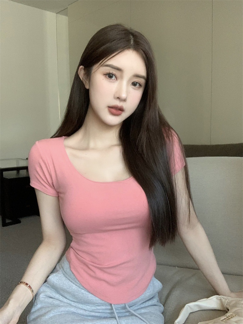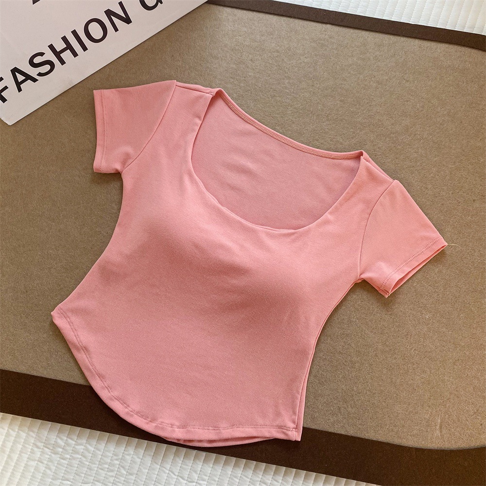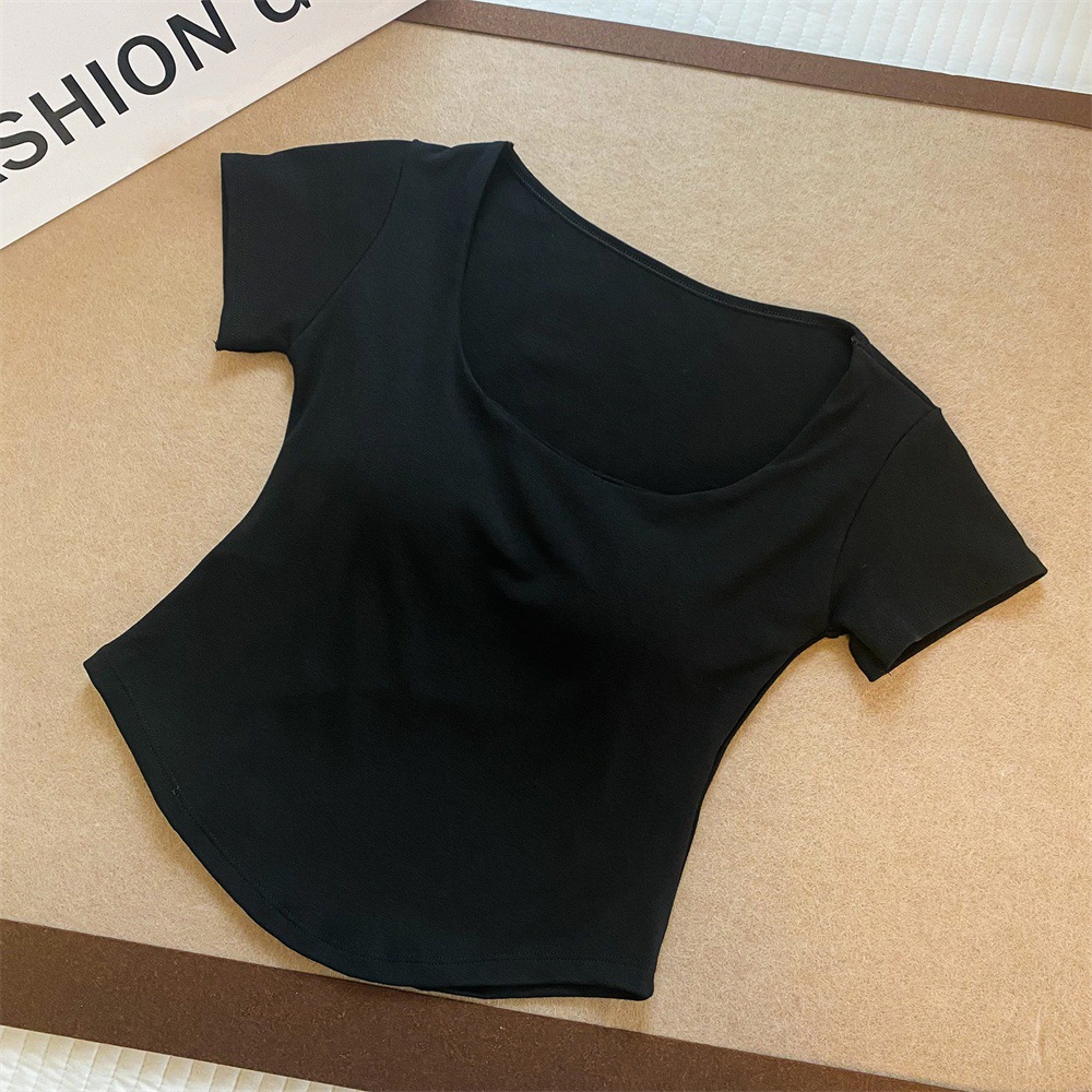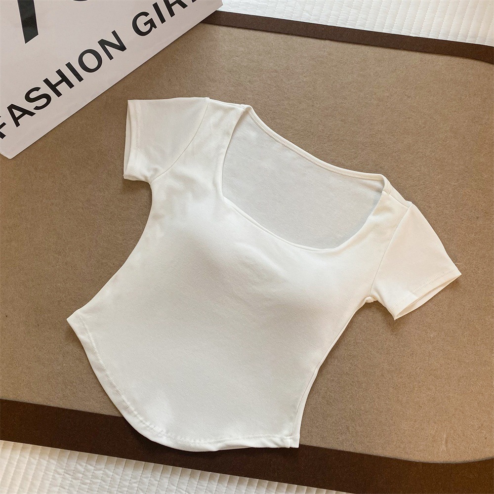 여름 새로운 솔리드 컬러 로우 넥 반팔 티셔츠 여성 가슴 패드 디자인 센스 살 커버 슬림 올 매치 아우터 탑