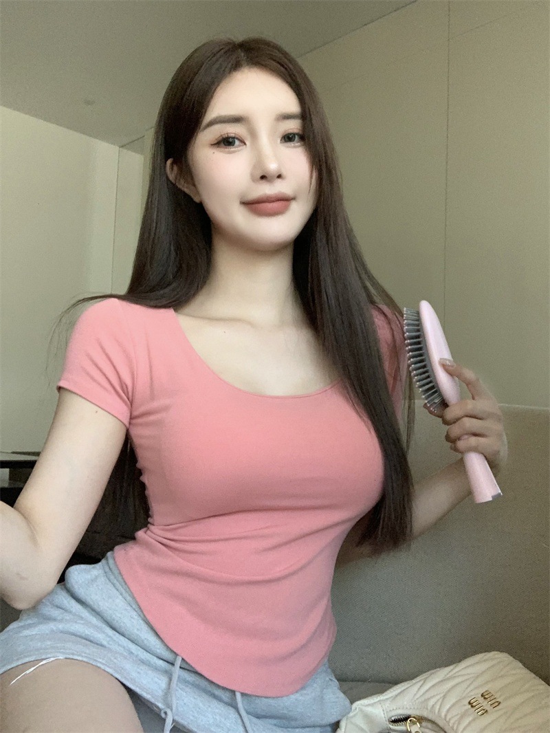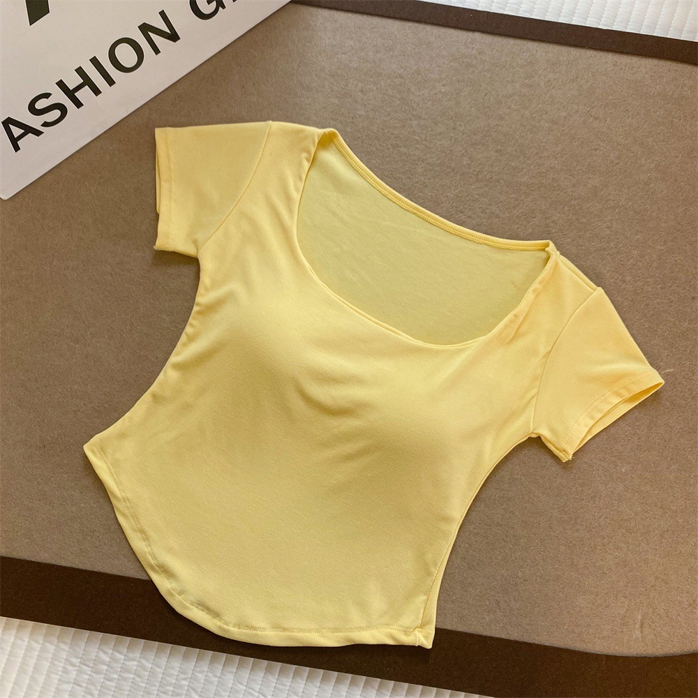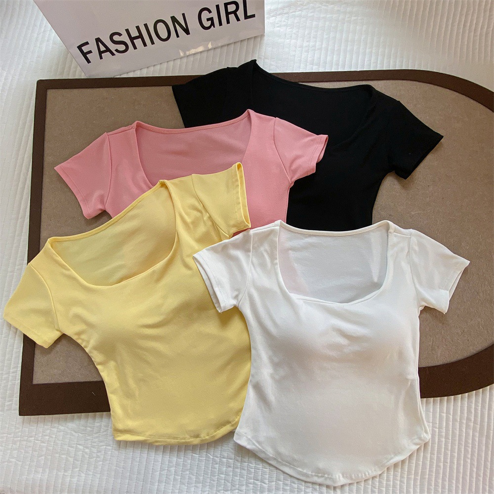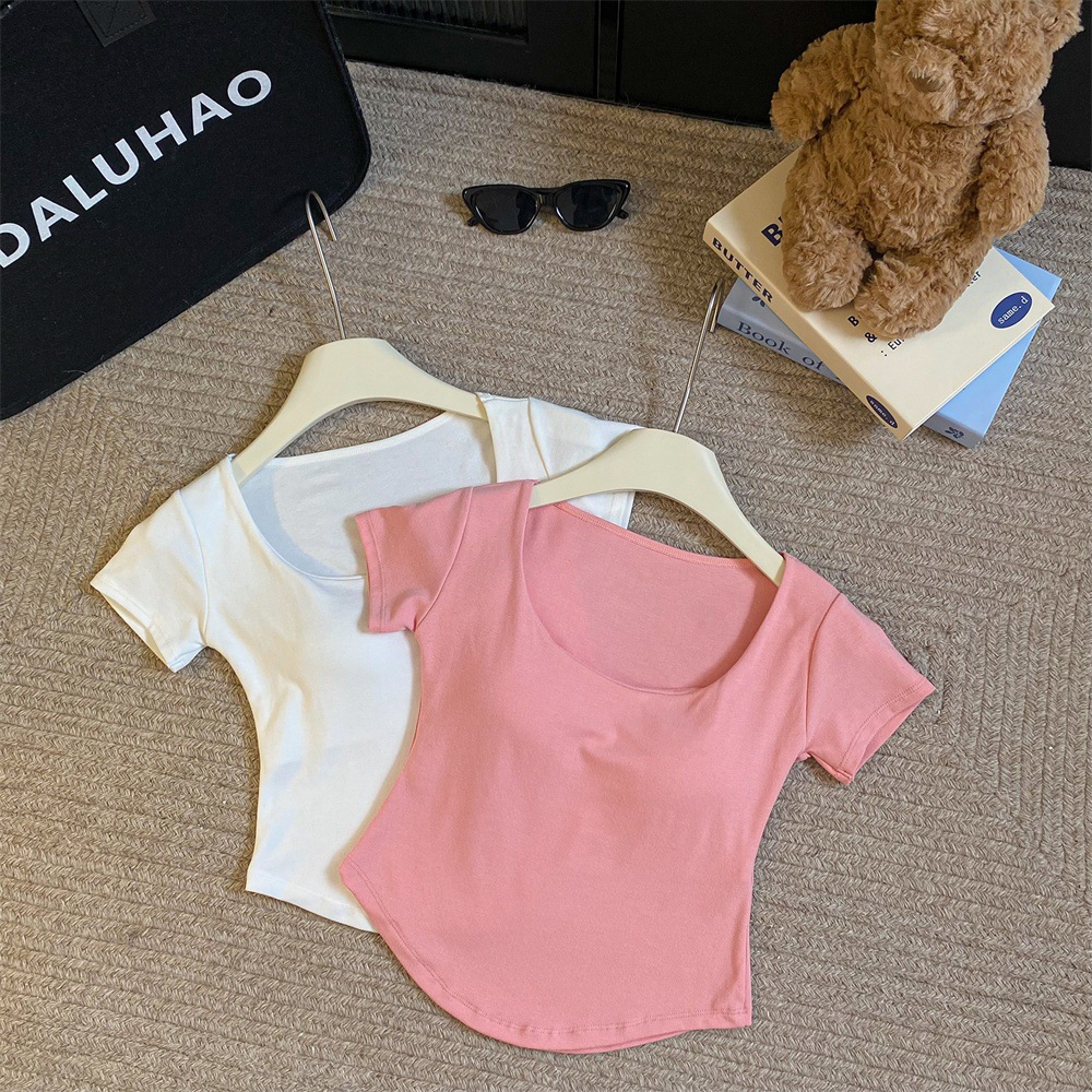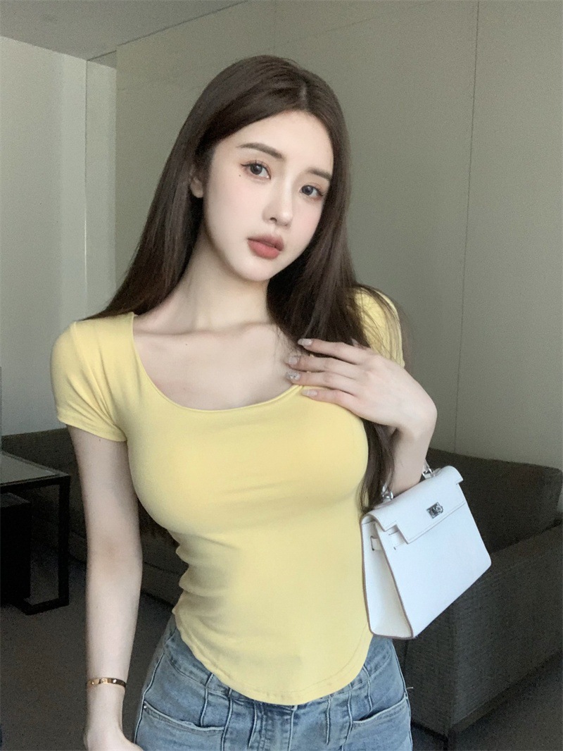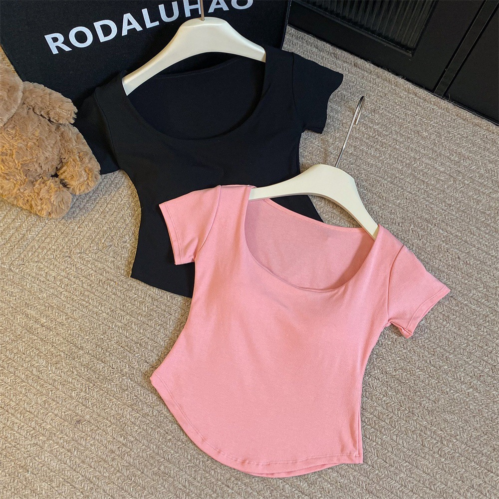 여름 새로운 솔리드 컬러 로우 넥 반팔 티셔츠 여성 가슴 패드 디자인 센스 살 커버 슬림 올 매치 아우터 탑