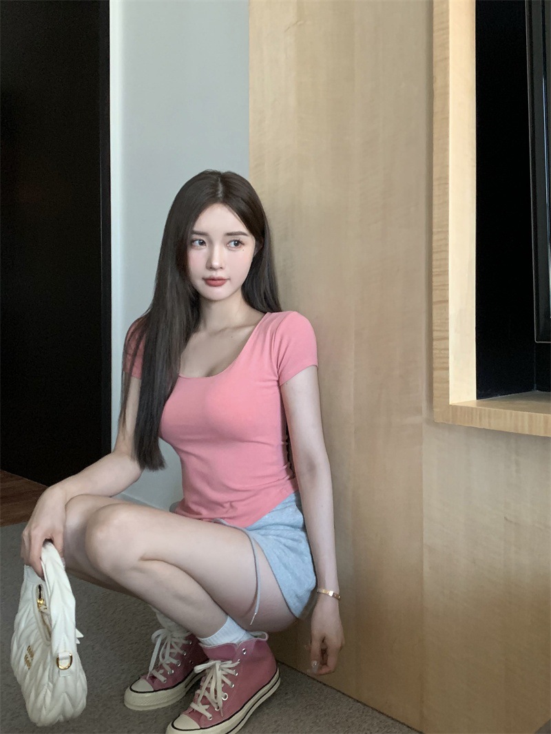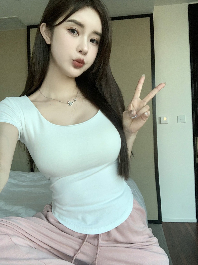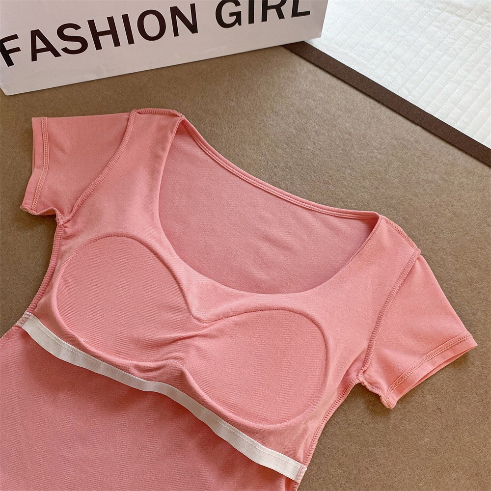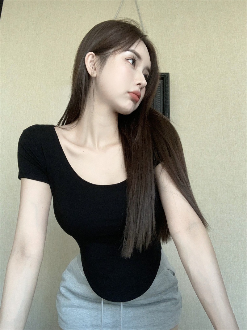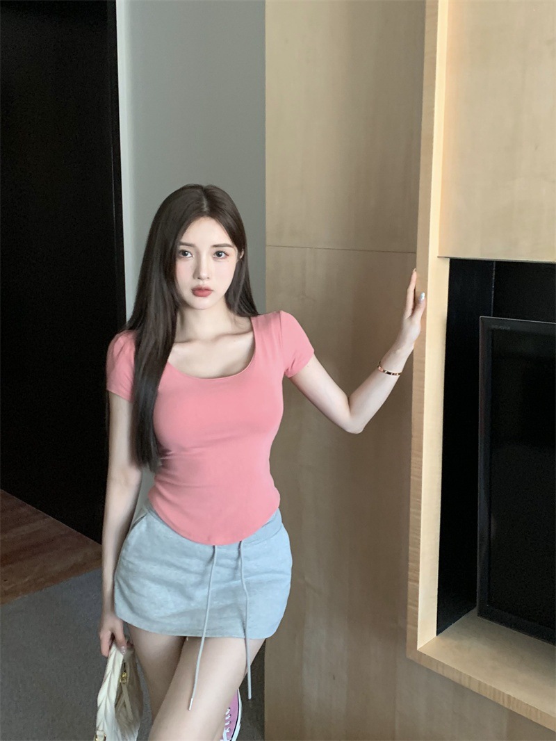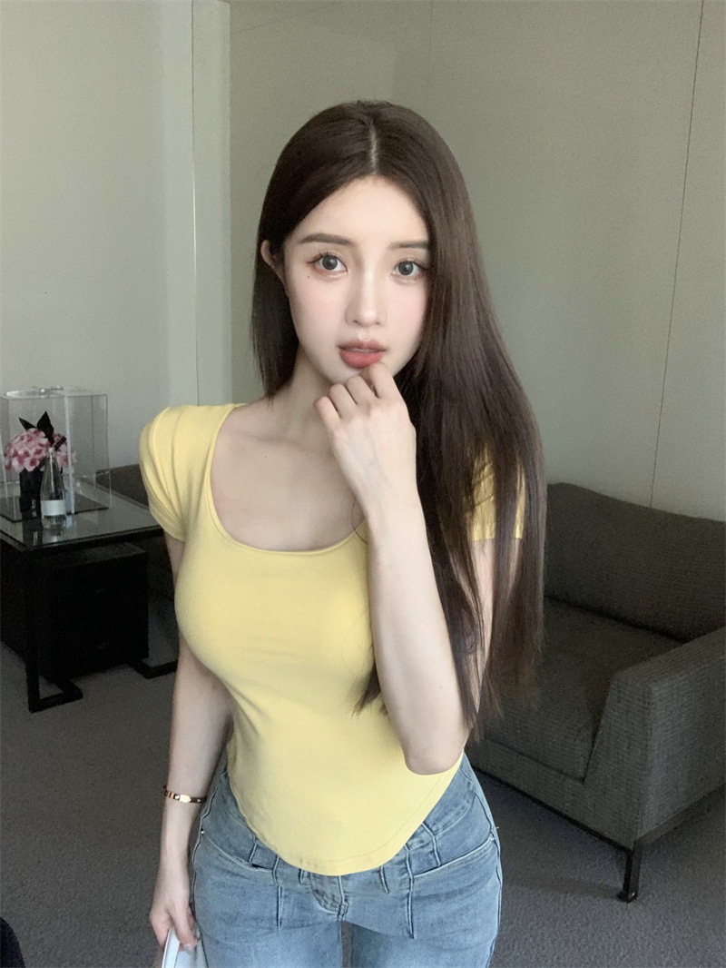 여름 새로운 솔리드 컬러 로우 넥 반팔 티셔츠 여성 가슴 패드 디자인 센스 살 커버 슬림 올 매치 아우터 탑