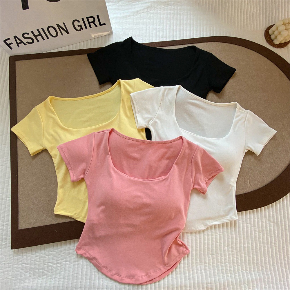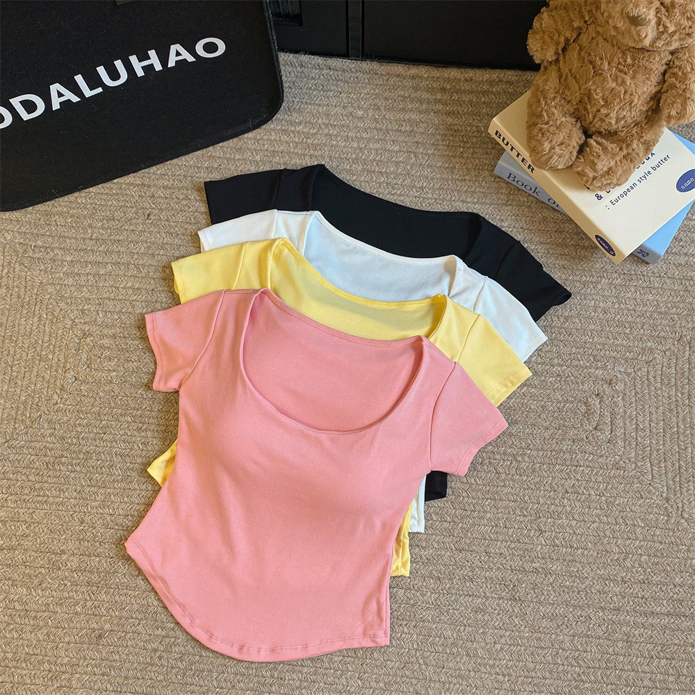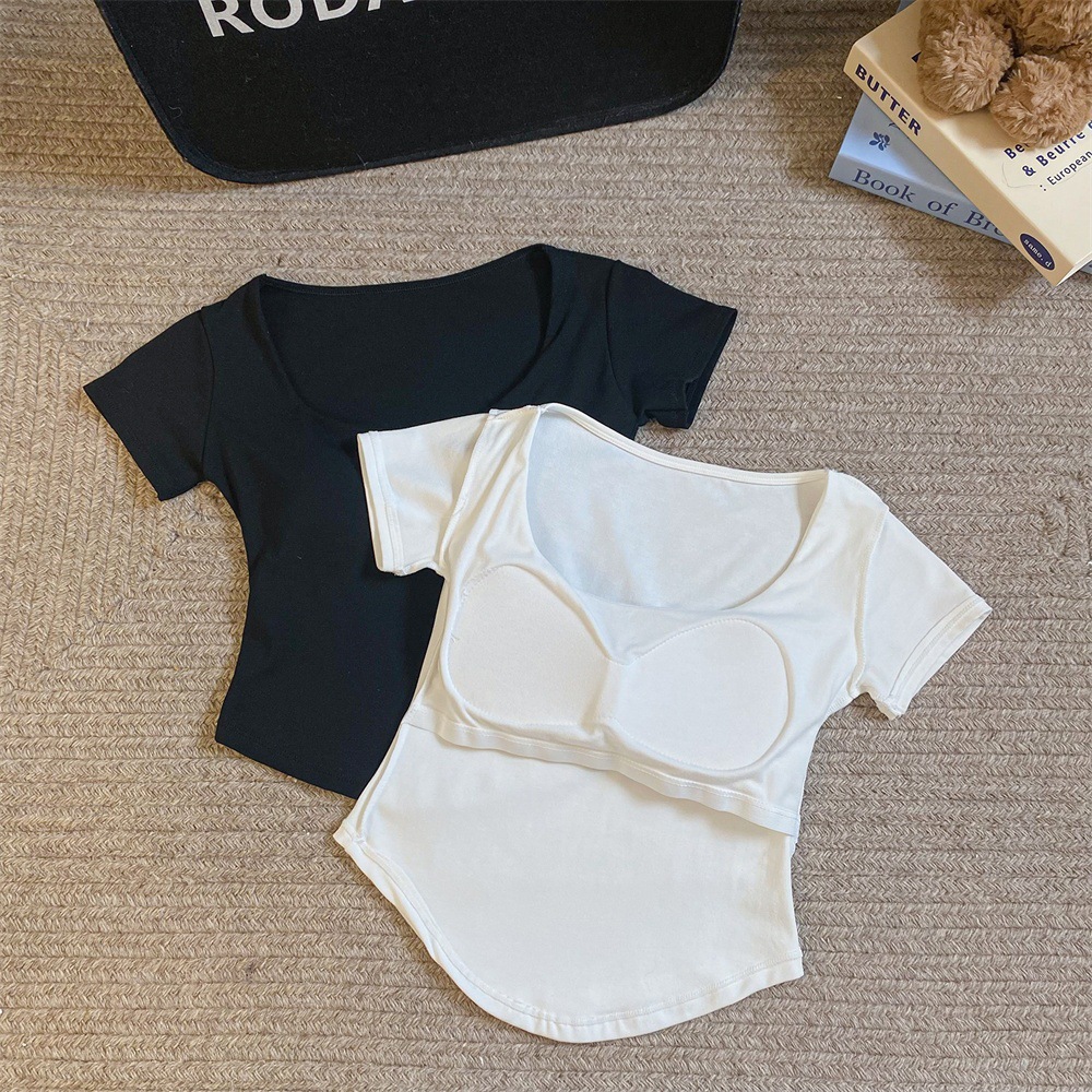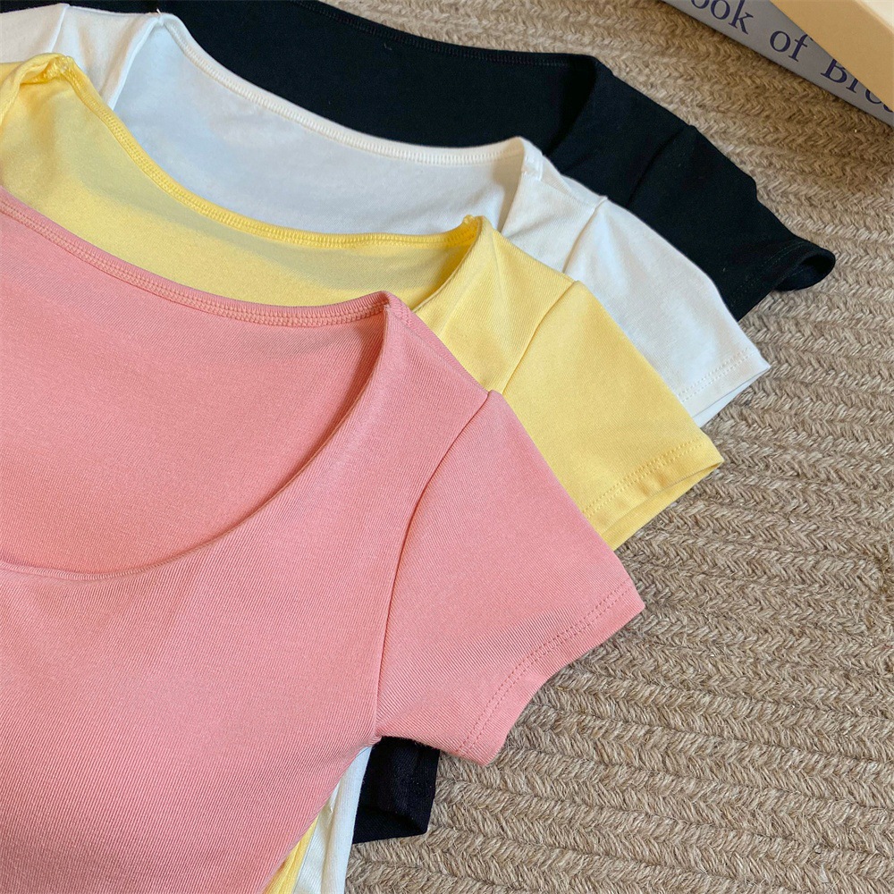 여름 새로운 솔리드 컬러 로우 넥 반팔 티셔츠 여성 가슴 패드 디자인 센스 살 커버 슬림 올 매치 아우터 탑스토어 가기