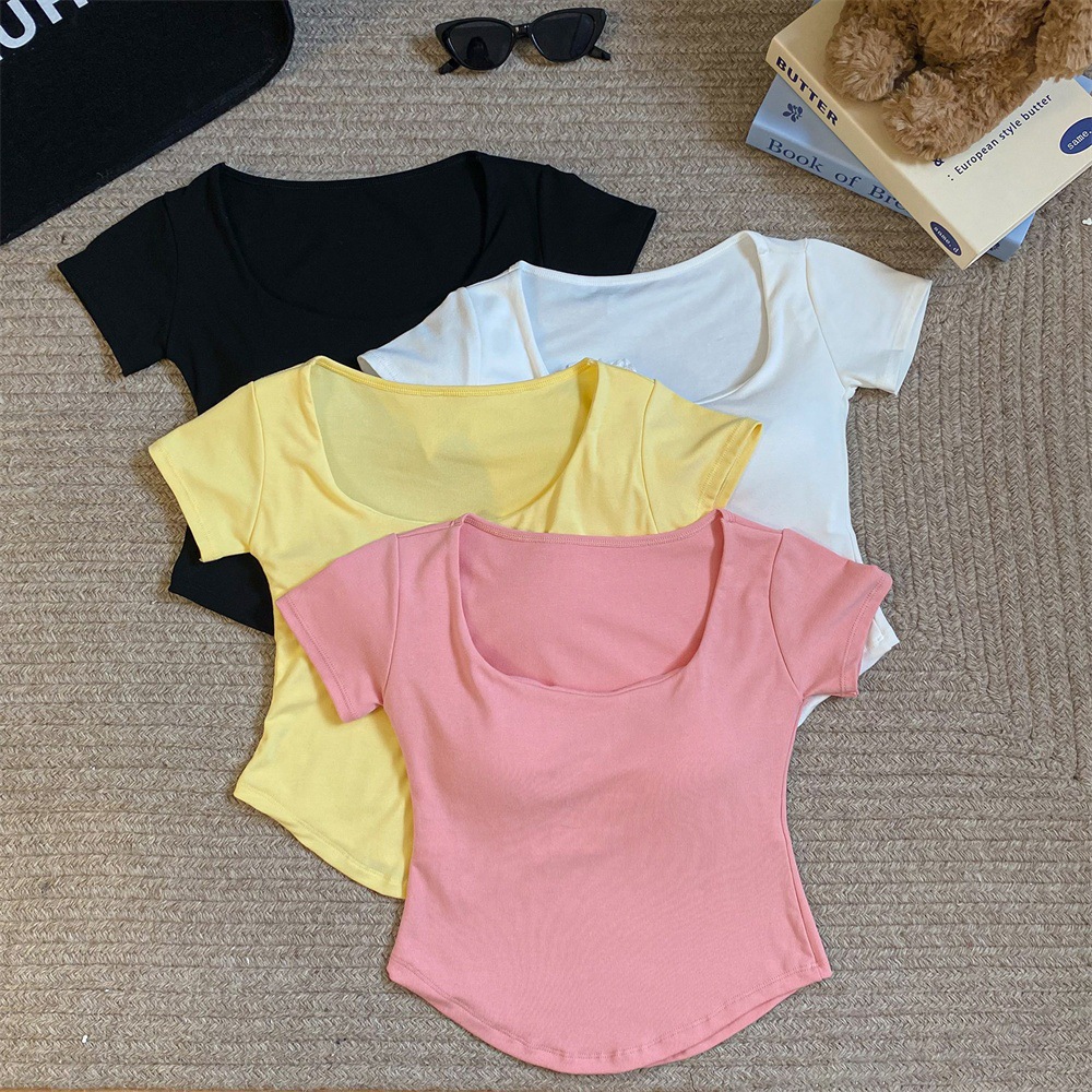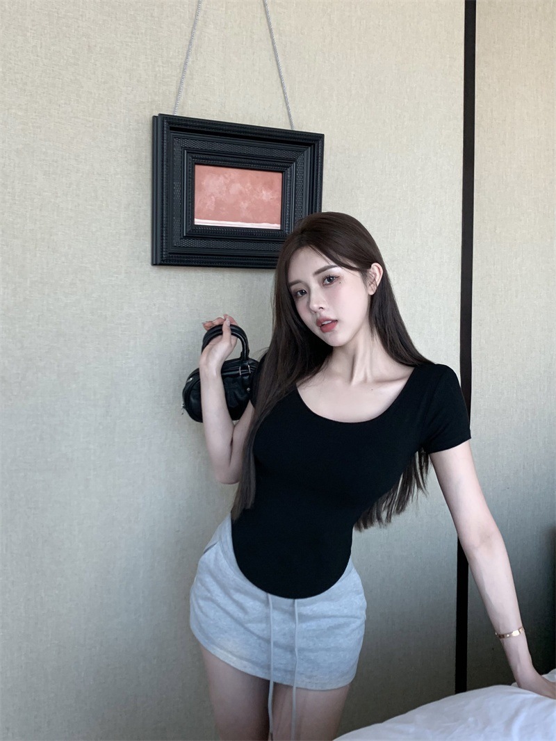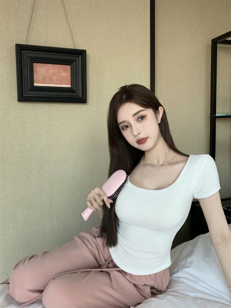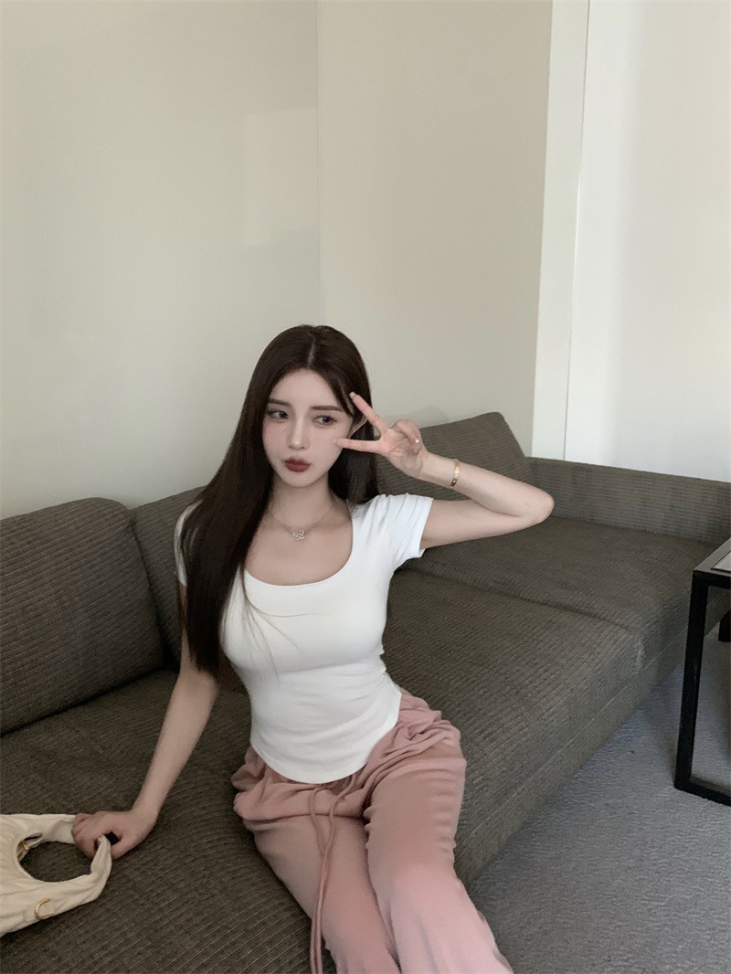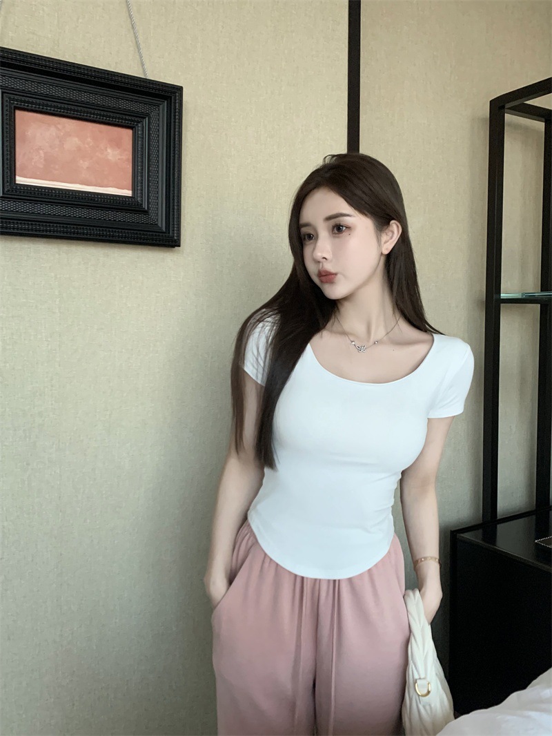 여름 새로운 솔리드 컬러 로우 넥 반팔 티셔츠 여성 가슴 패드 디자인 센스 살 커버 슬림 올 매치 아우터 탑스토어 가기