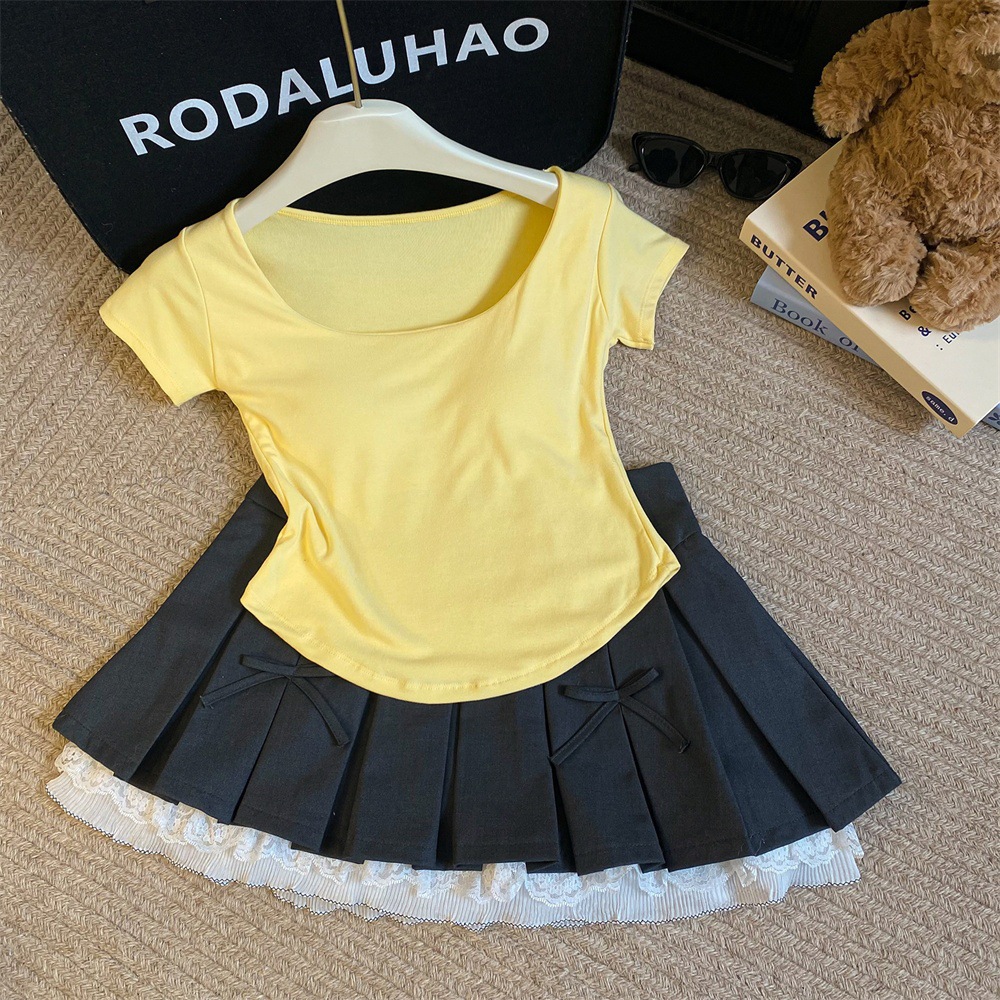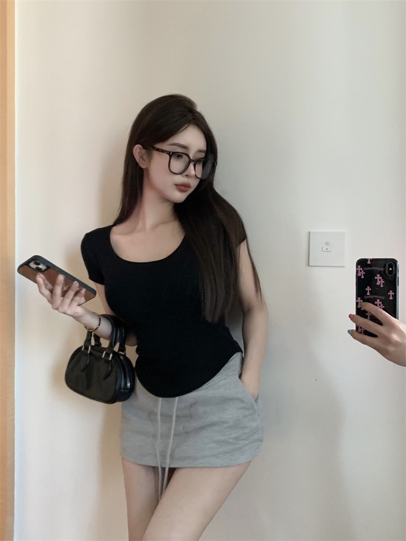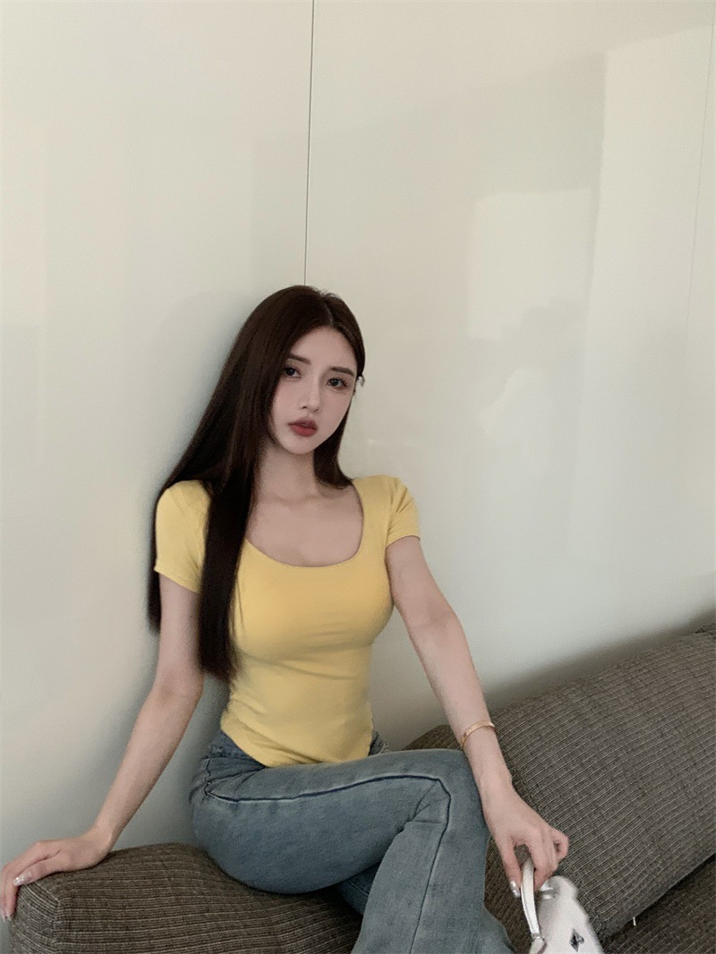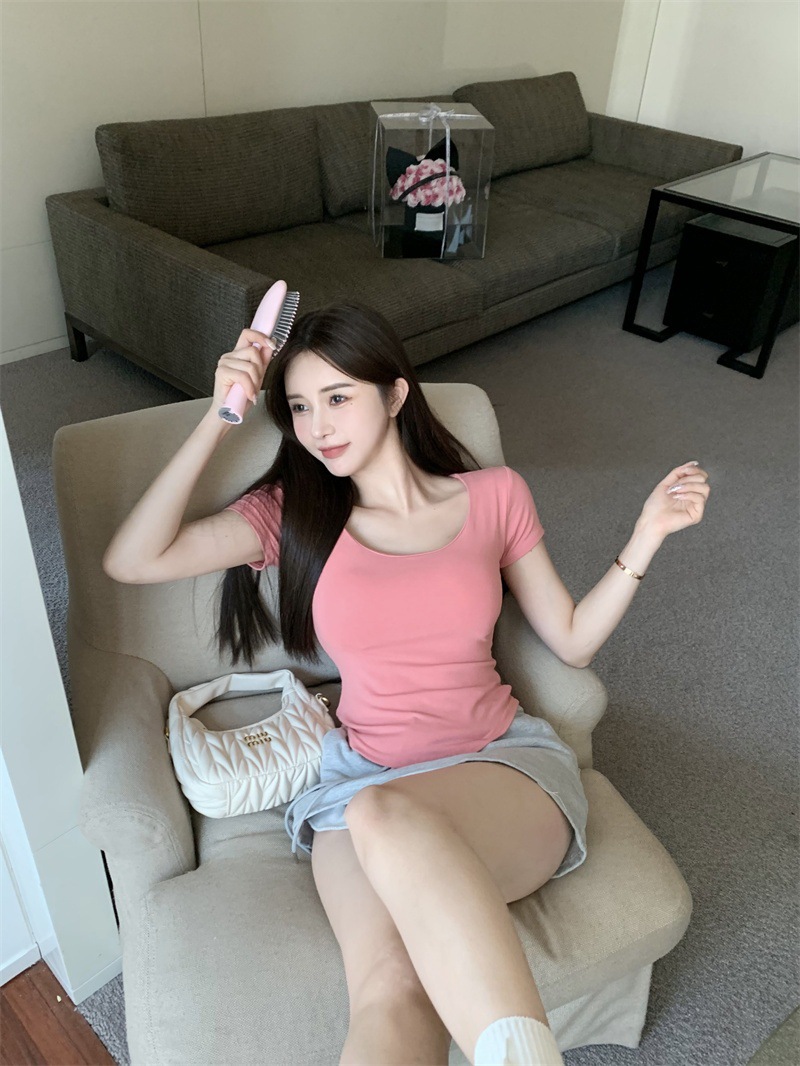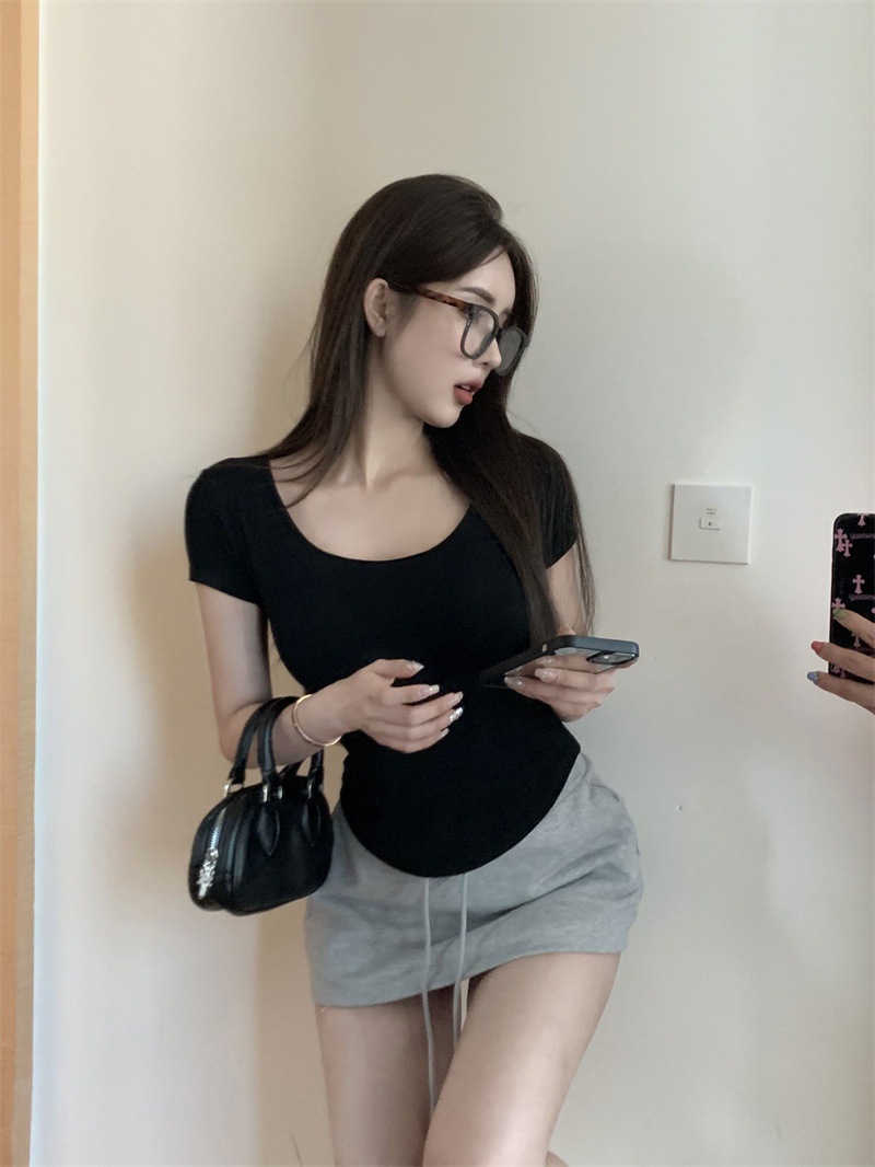 여름 새로운 솔리드 컬러 로우 넥 반팔 티셔츠 여성 가슴 패드 디자인 센스 살 커버 슬림 올 매치 아우터 탑스토어 가기