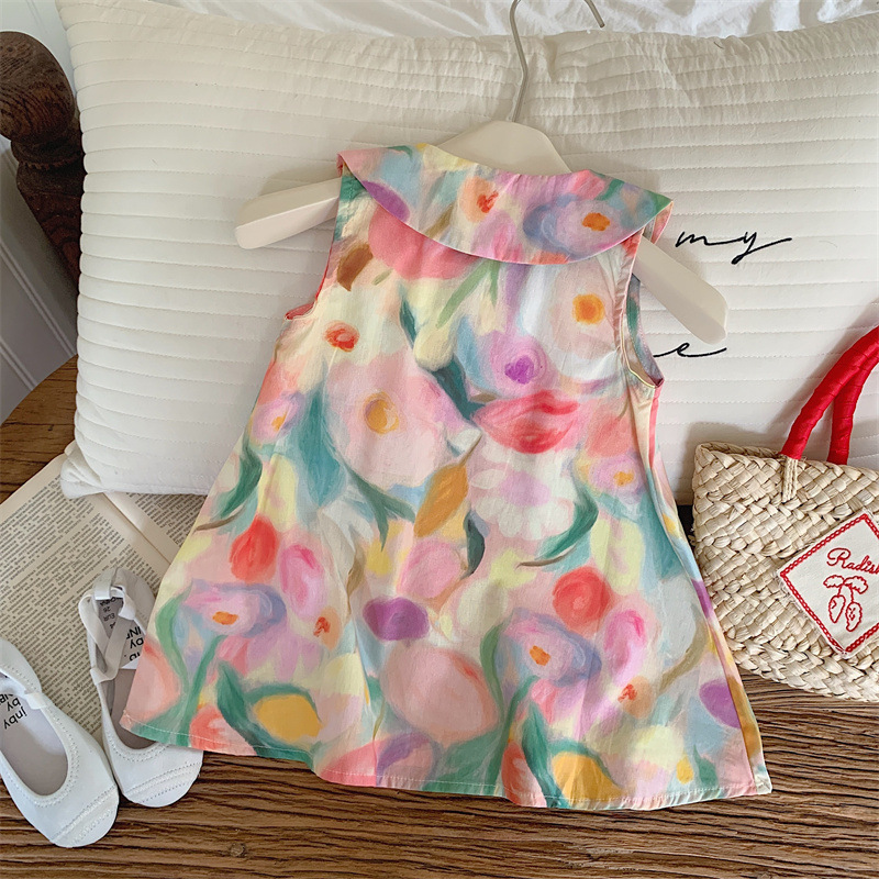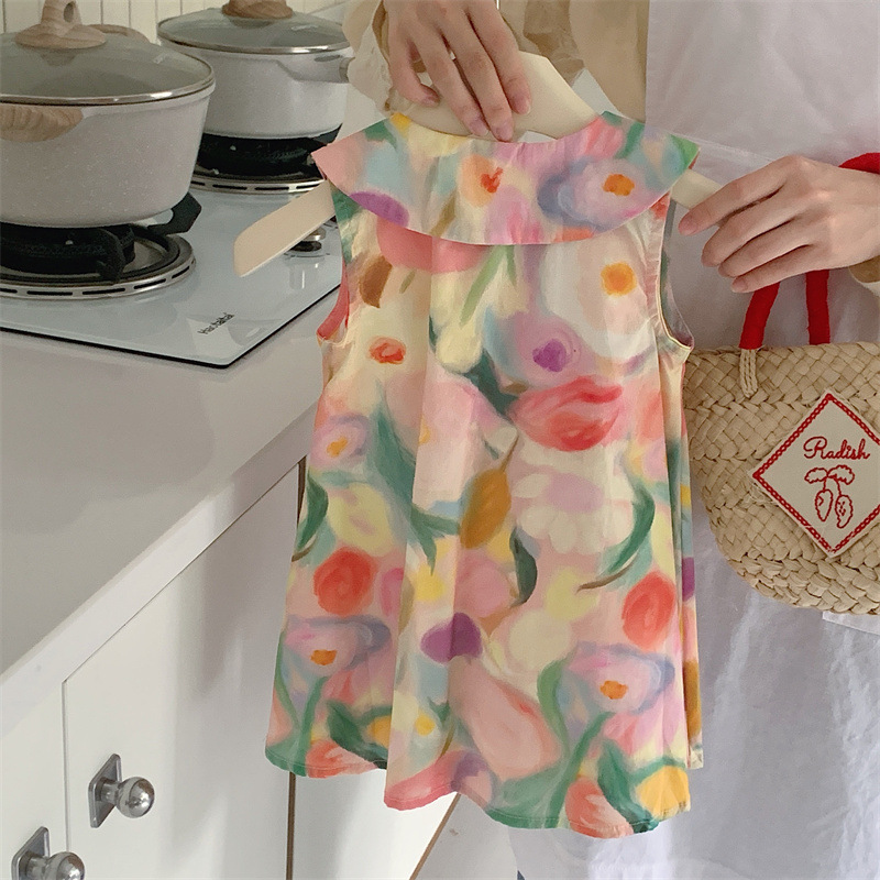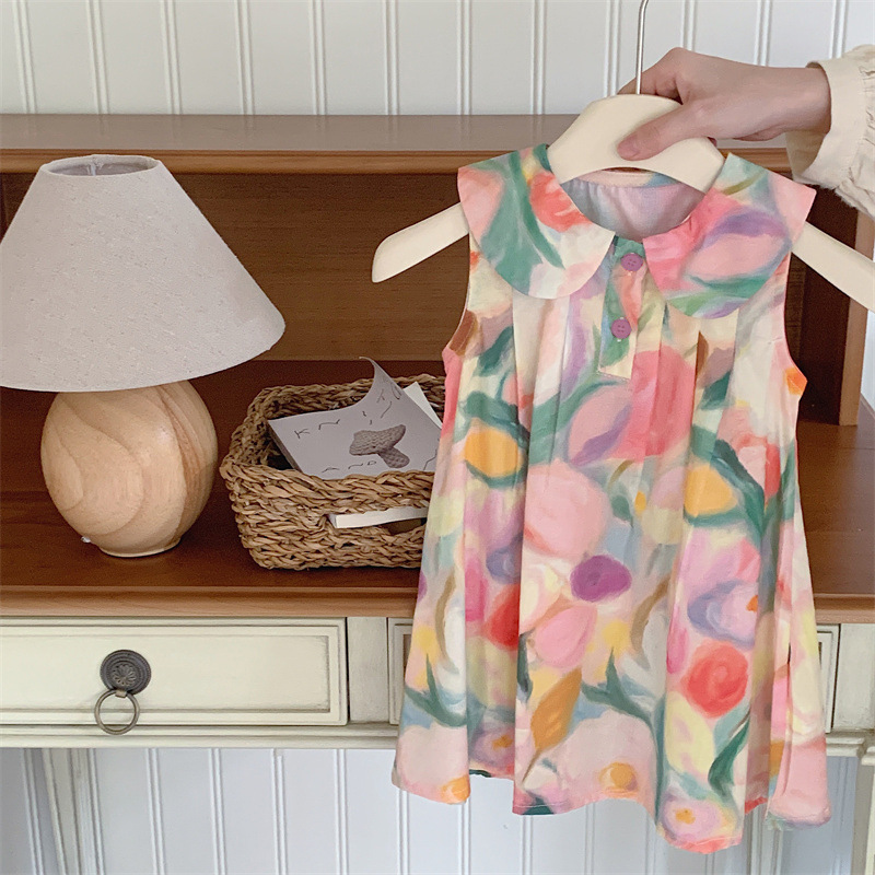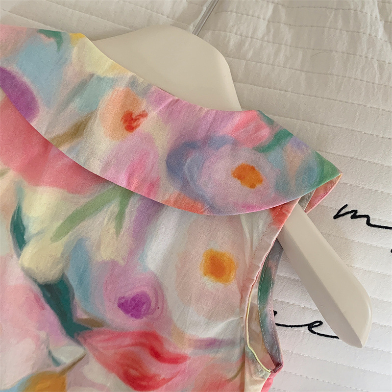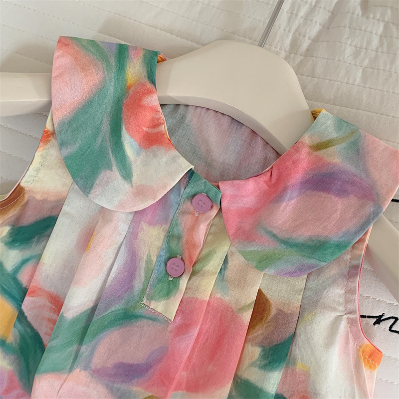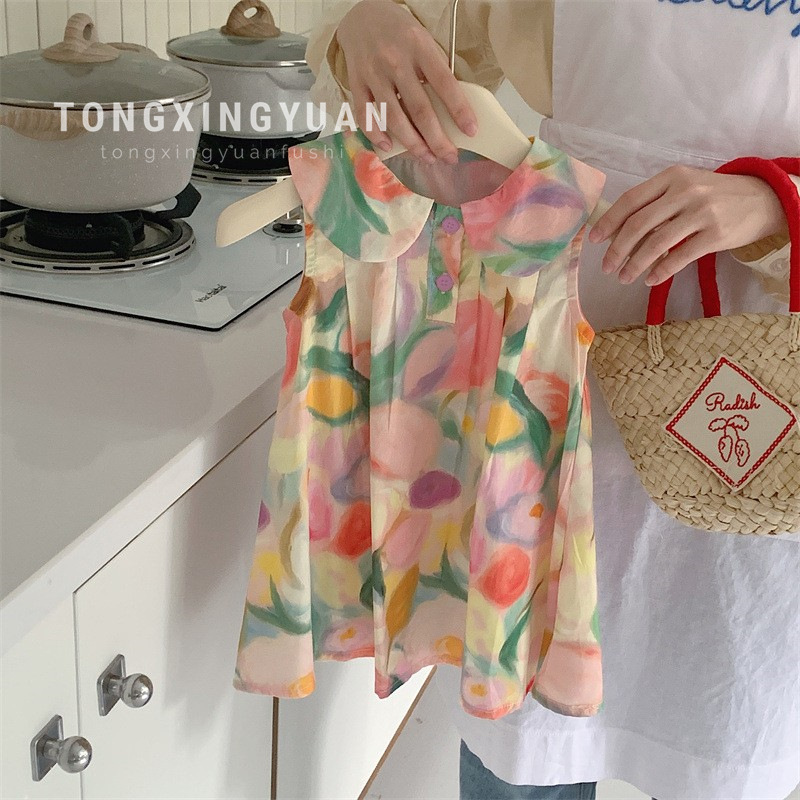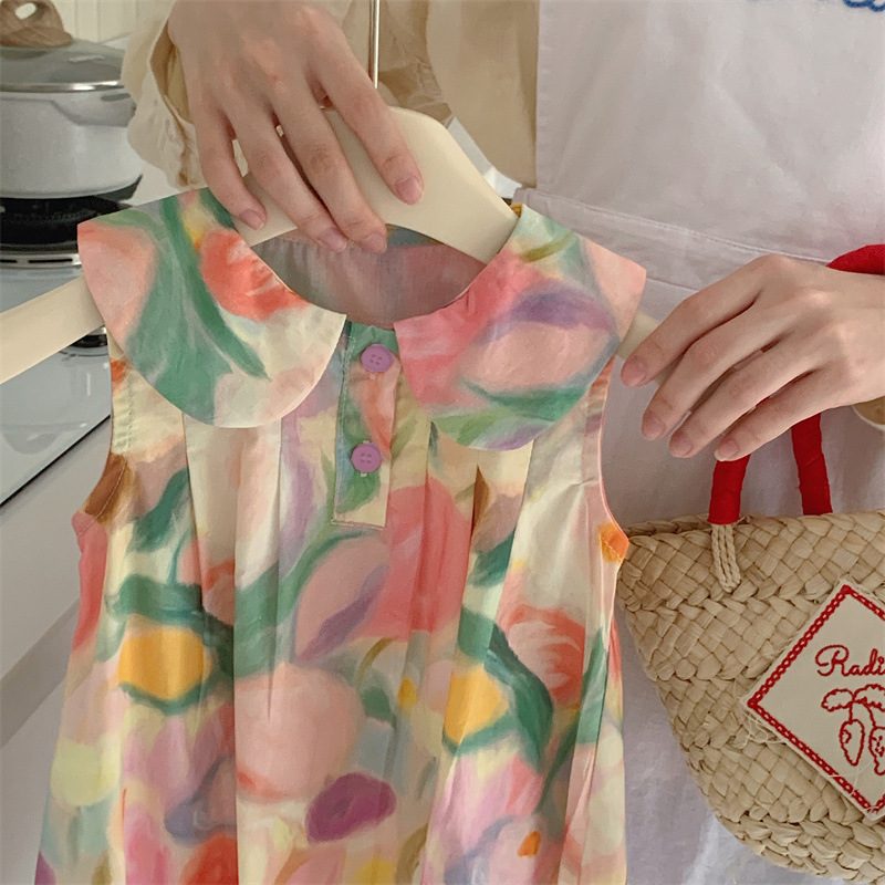 Tongxingyuan 2025 새로운 여름 스타일 한국 스타일 여자 프린트 라펠 드레스 여자 기질 민소매 스커트 달콤한