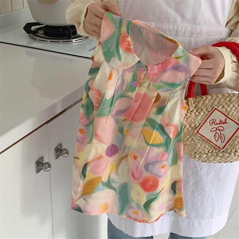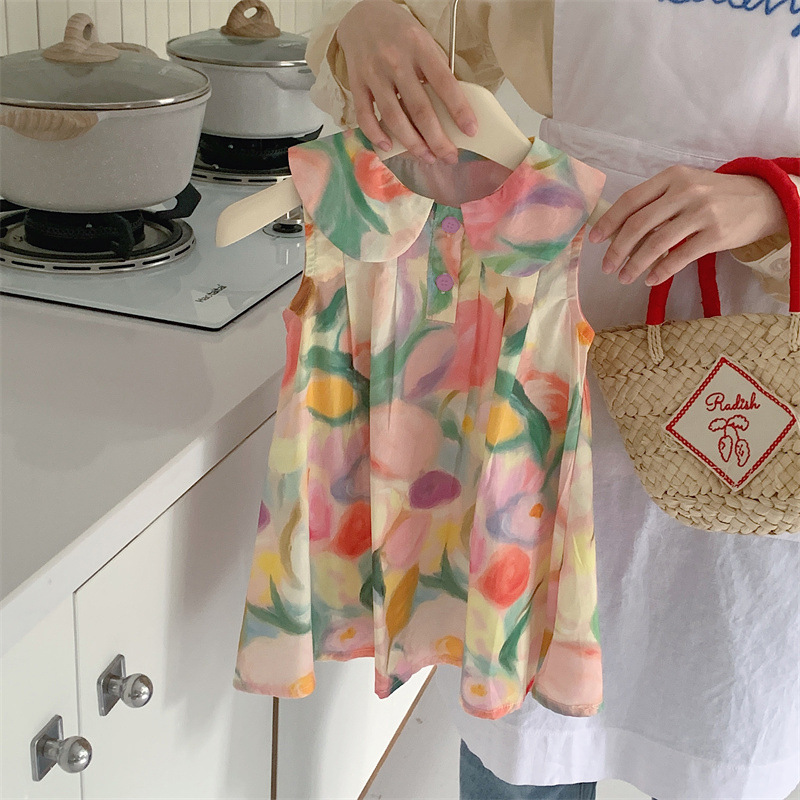 Tongxingyuan 2025 새로운 여름 스타일 한국 스타일 여자 프린트 라펠 드레스 여자 기질 민소매 스커트 달콤한스토어 가기