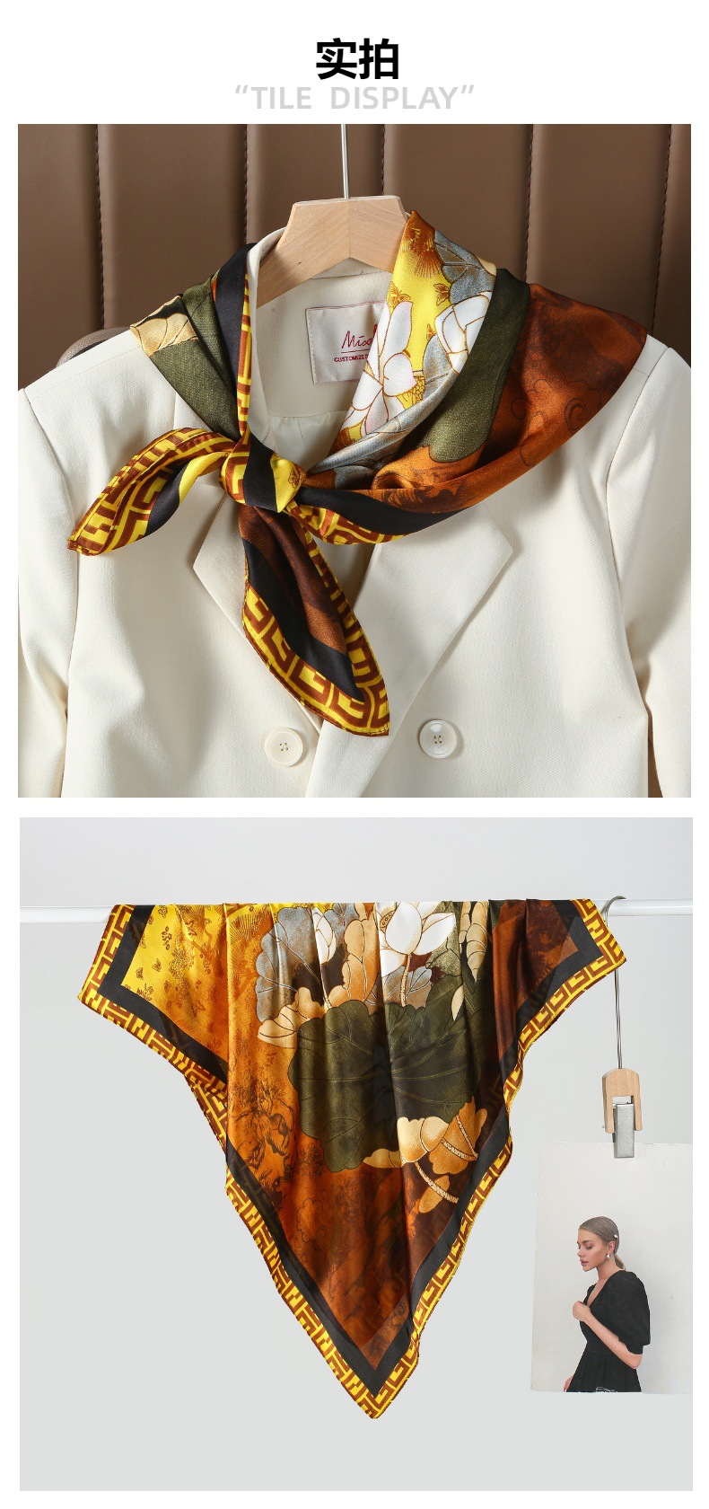 2024 Guofeng 연꽃 연못 인쇄 된 새틴 여성용 스카프 스카프 70CM 고급 감각 스카프 넥타이 헤어 벨트 도매스토어 가기