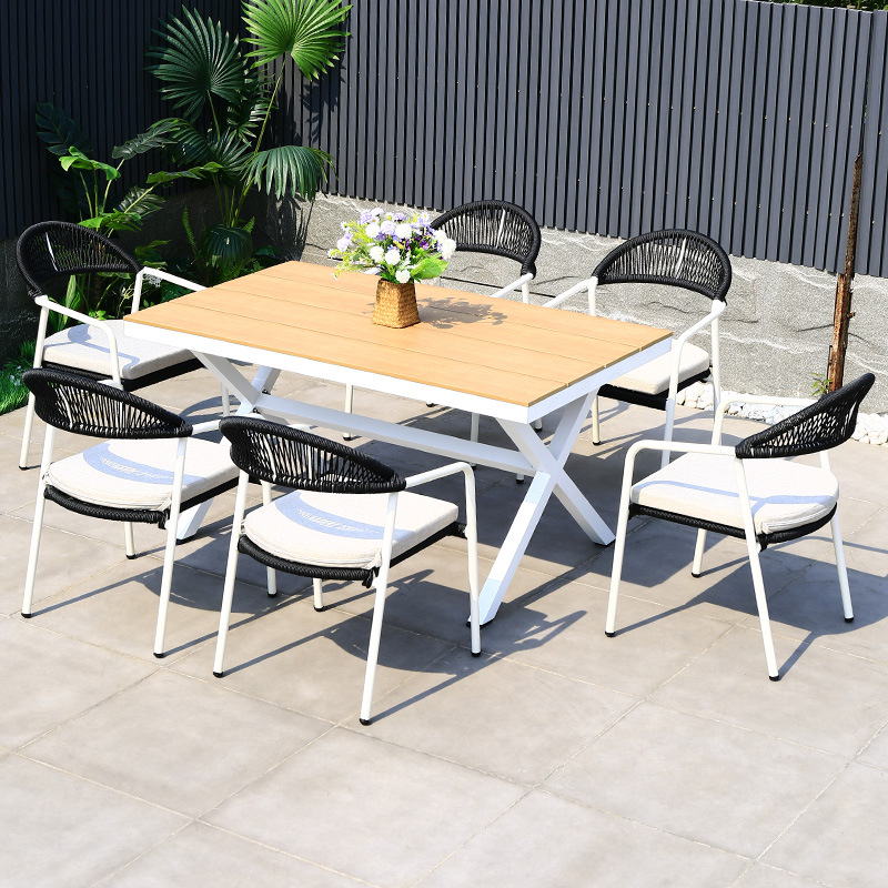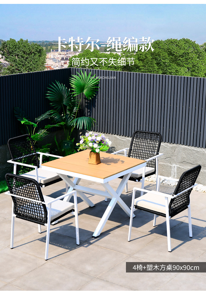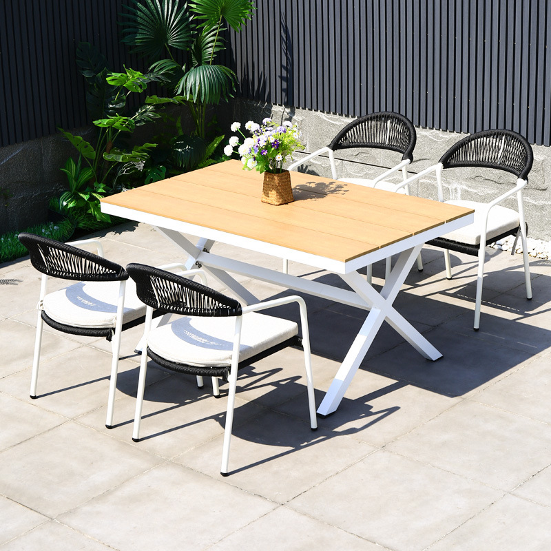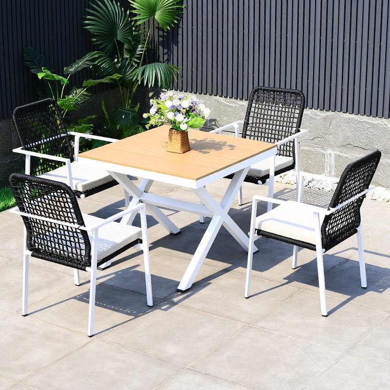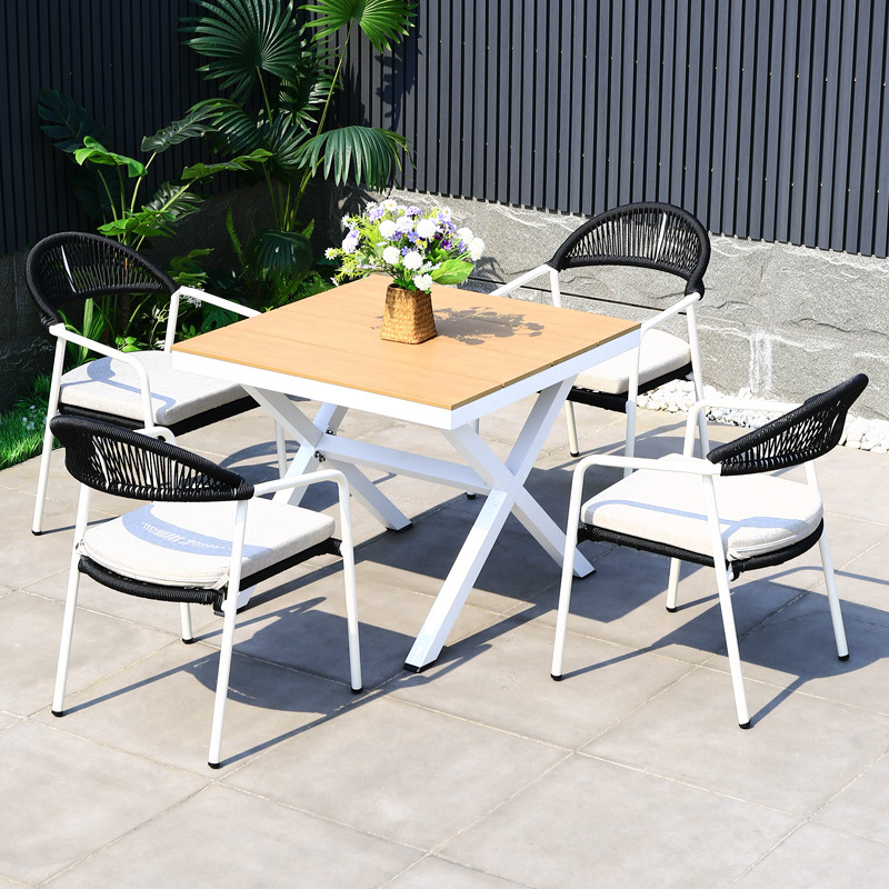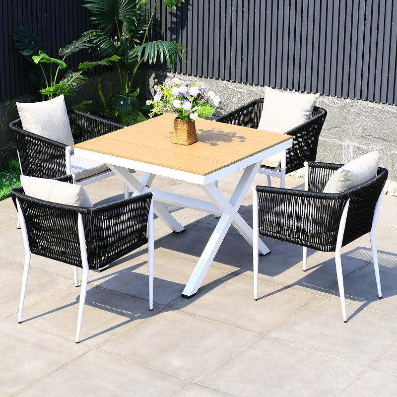 야외 테이블과 의자 안뜰 야외 정원 등나무 등나무 의자 조합 방수 선 스크린 갑판 테이블 캐주얼 식탁 세트