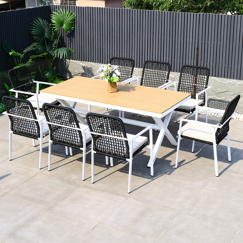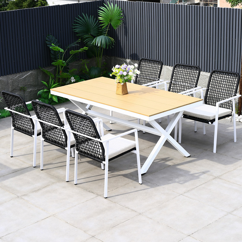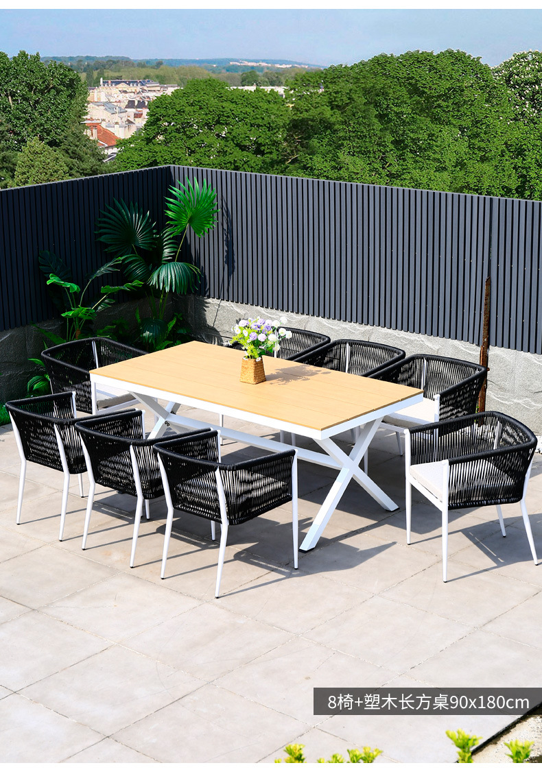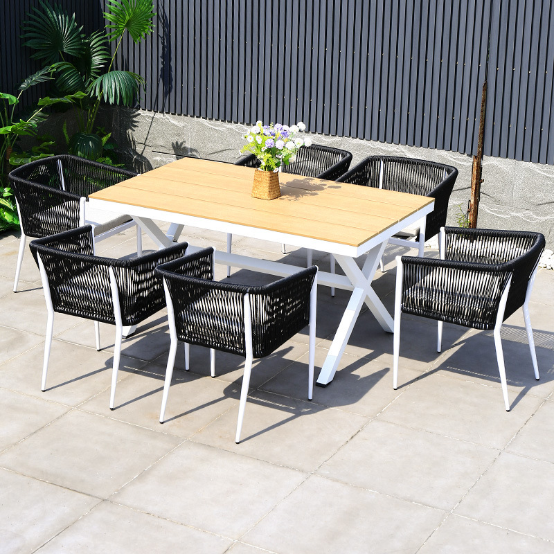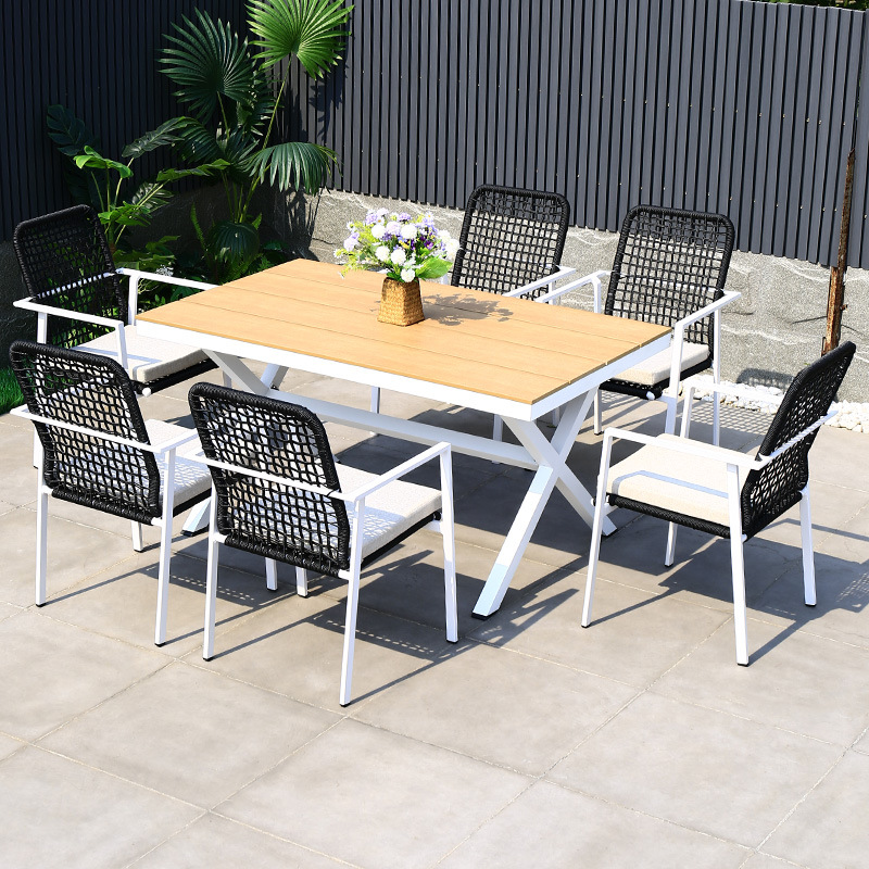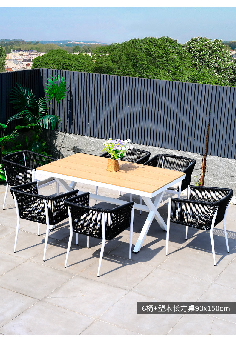야외 테이블과 의자 안뜰 야외 정원 등나무 등나무 의자 조합 방수 선 스크린 갑판 테이블 캐주얼 식탁 세트