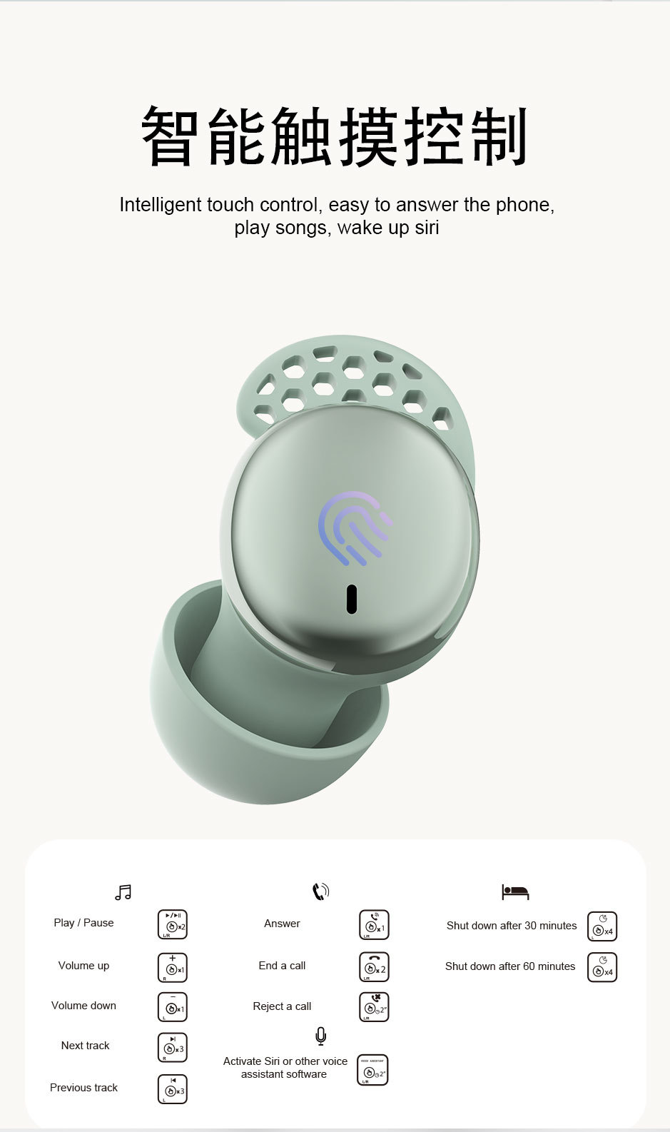支持功能: 接、打电话/暂停/播放/上一曲/下一曲/音量+/音量-/睡眠模式