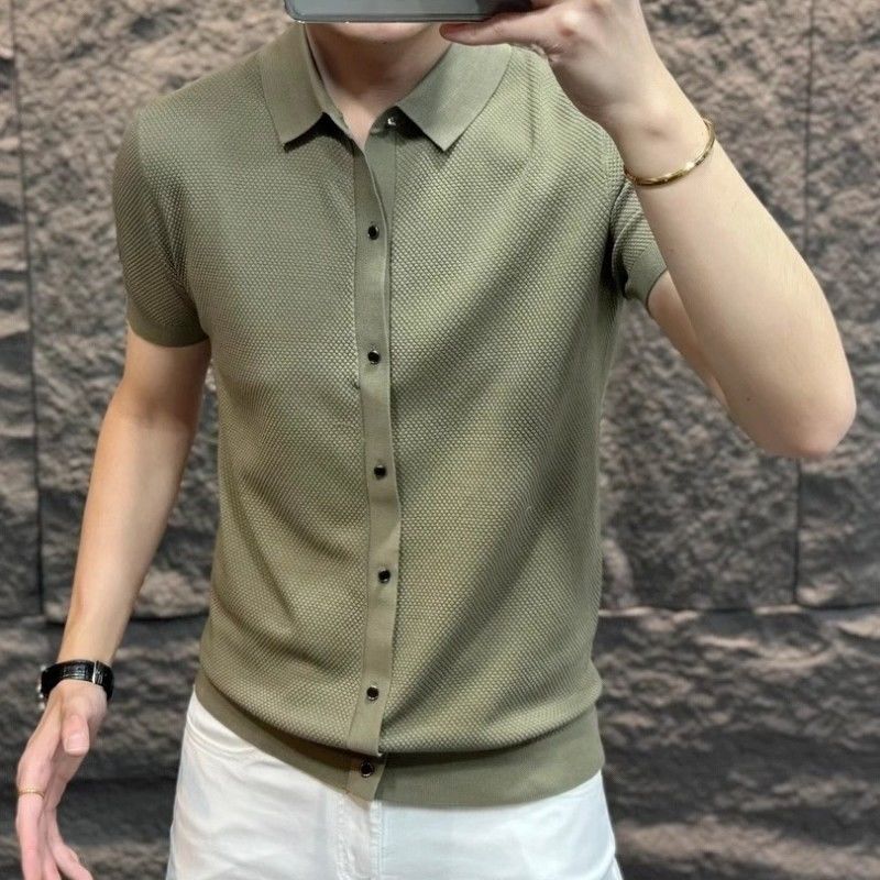 유럽 하이 엔드 남성 여름 새 옷깃 비즈니스 캐주얼 라이트 럭셔리 패션 슬림핏 올 매치 솔리드 컬러 하프 슬리브 티셔츠