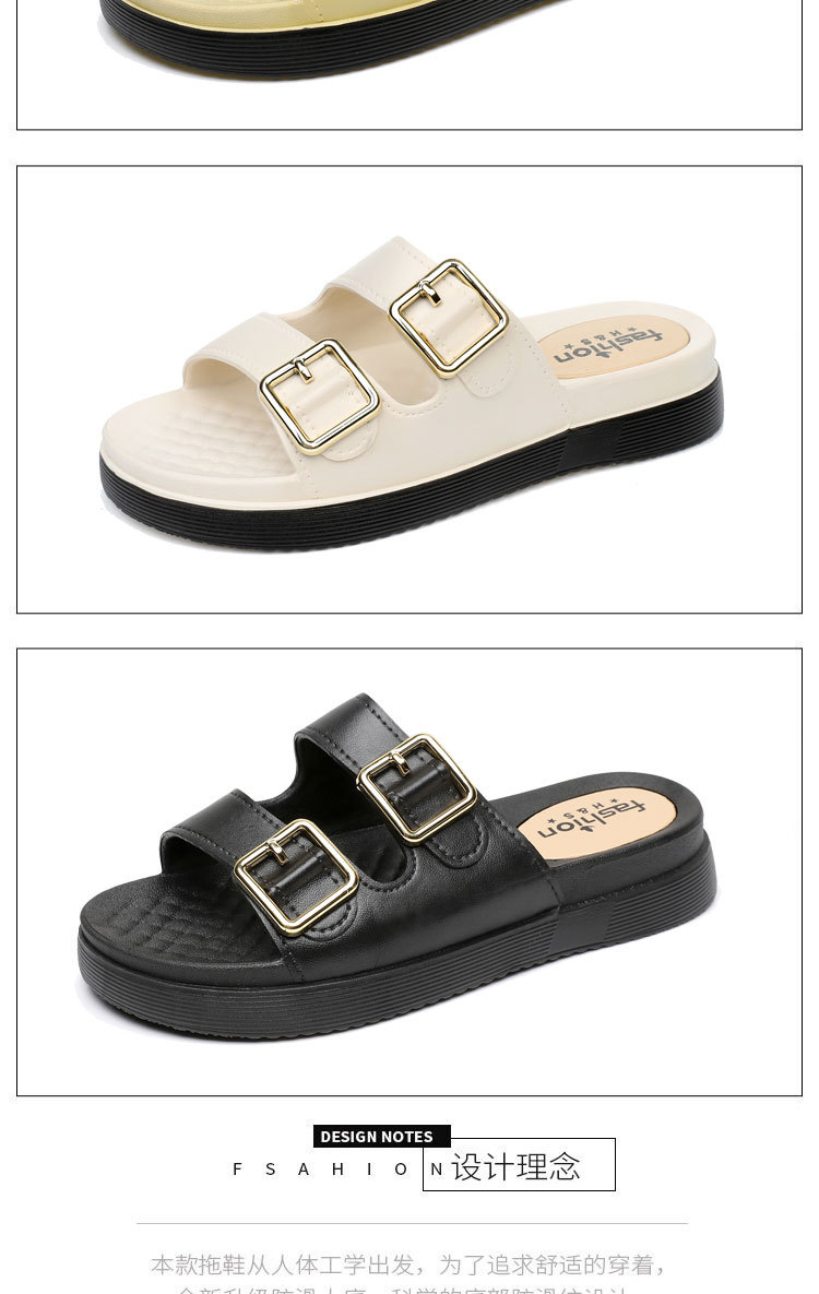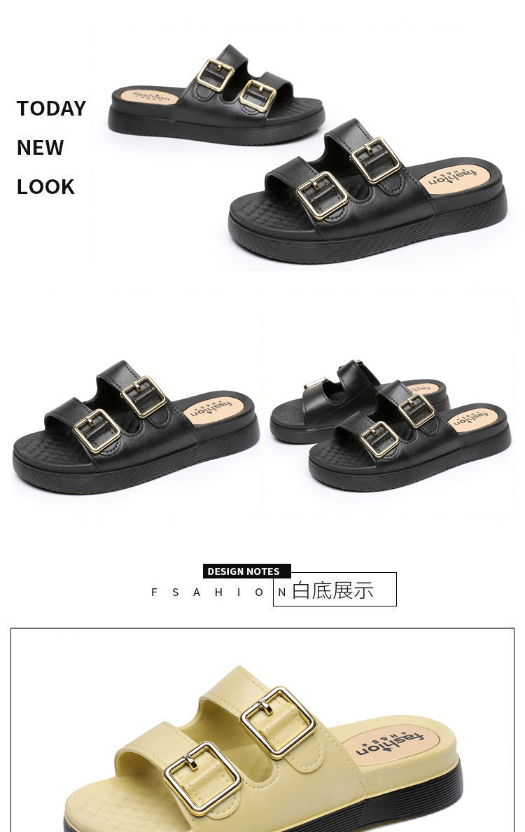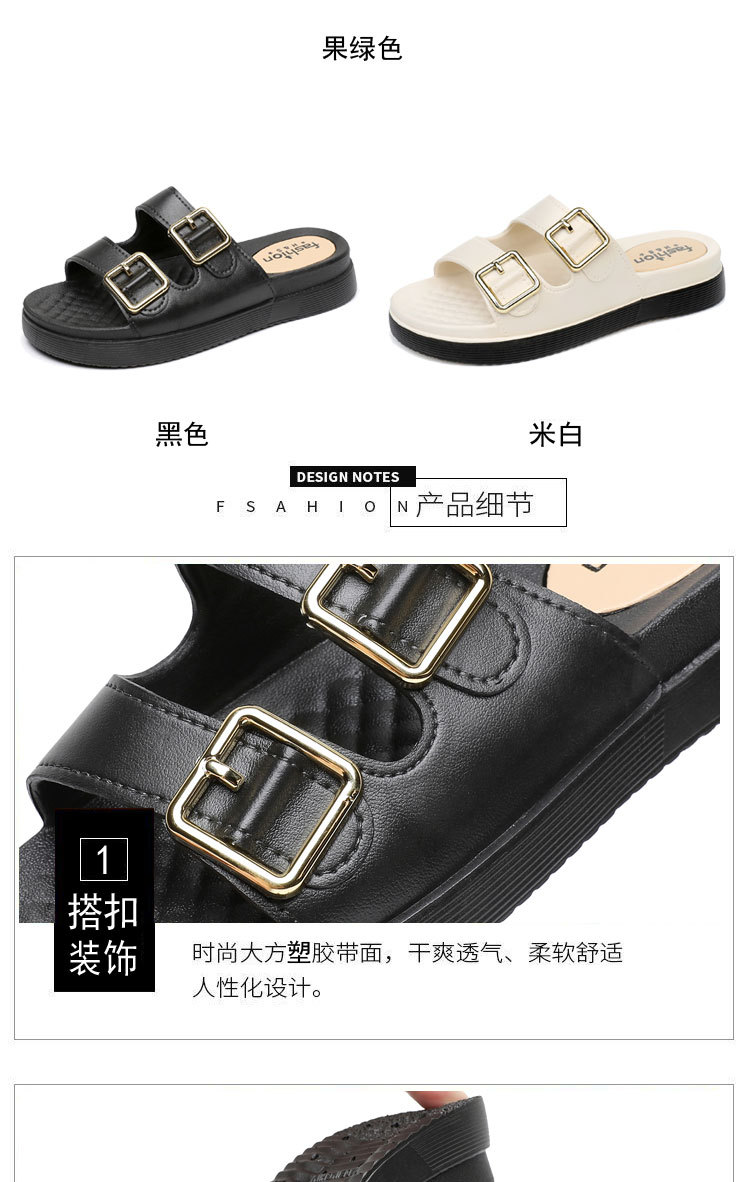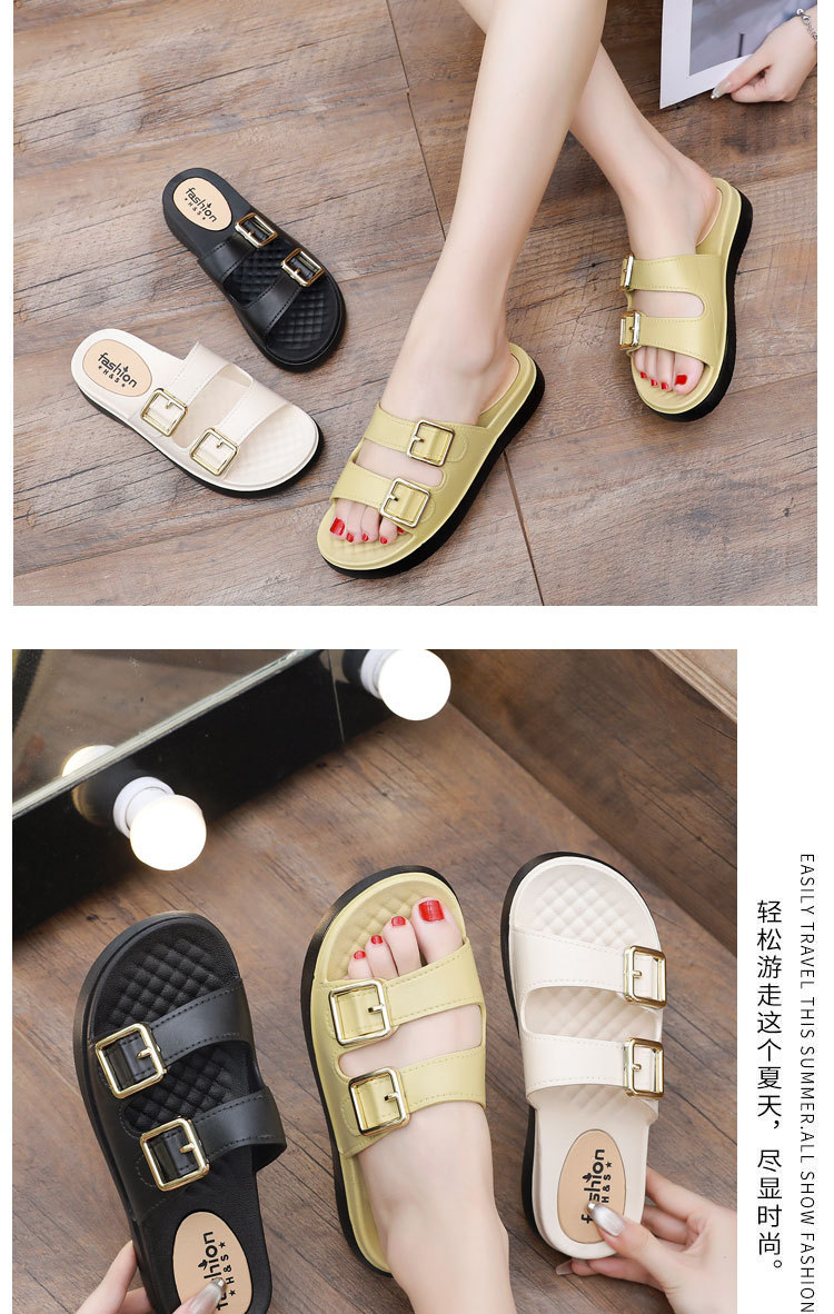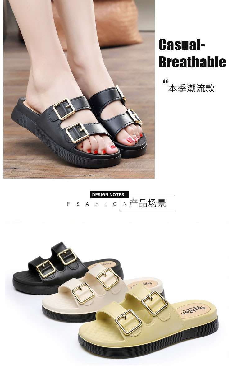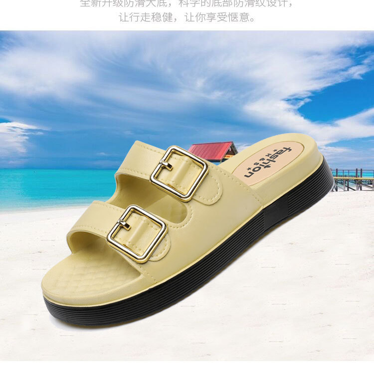 여성용 미끄럼 방지 슬라이드 유행 새 여름 외부 두꺼운 하단 미드 힐 편안한 더블 버클 캐주얼 비치 샌들