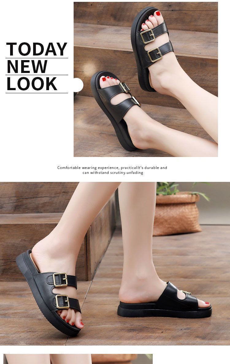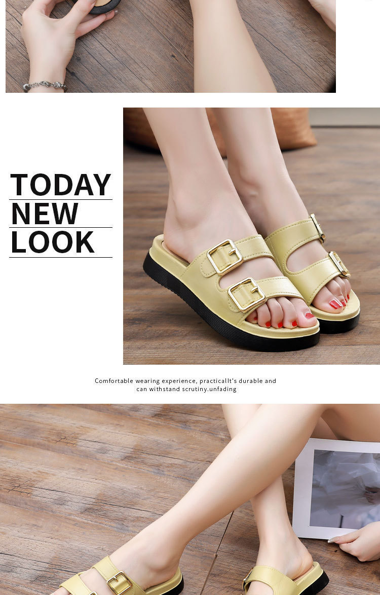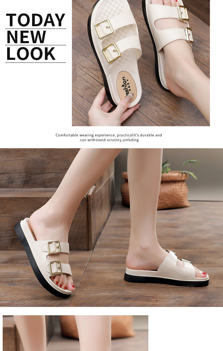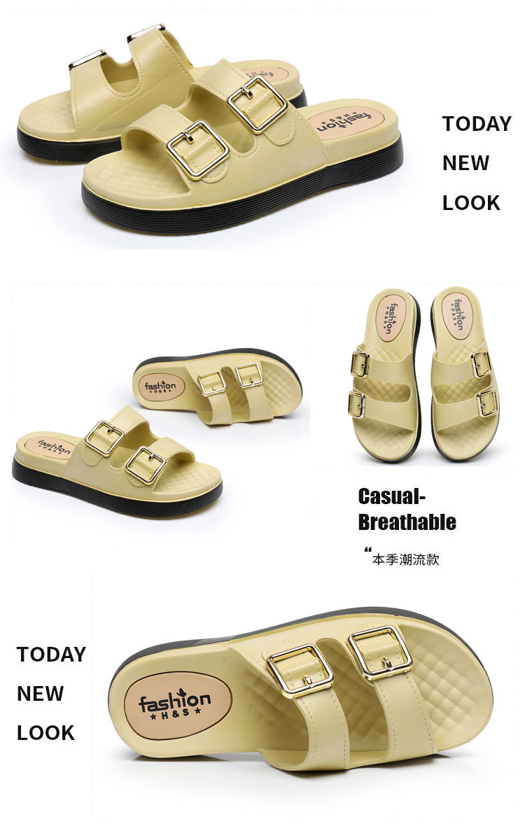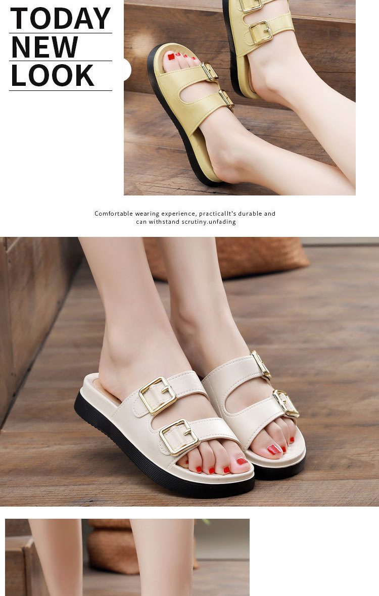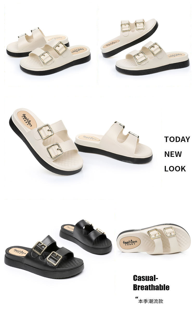 여성용 미끄럼 방지 슬라이드 유행 새 여름 외부 두꺼운 하단 미드 힐 편안한 더블 버클 캐주얼 비치 샌들스토어 가기