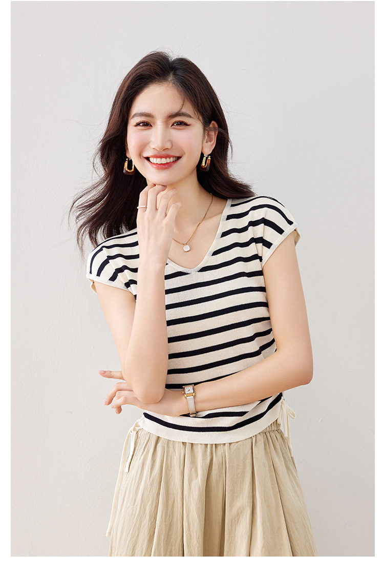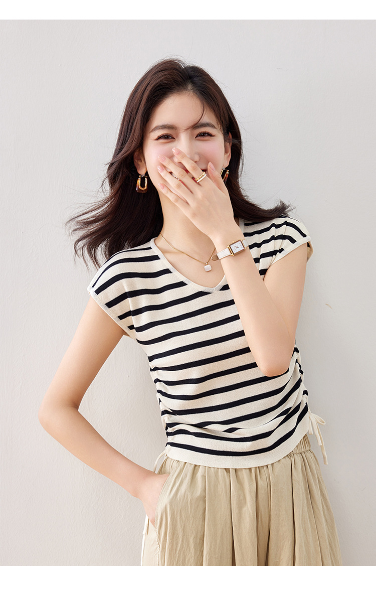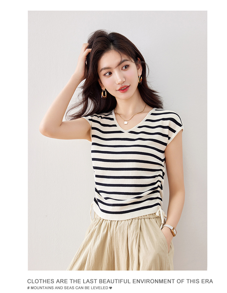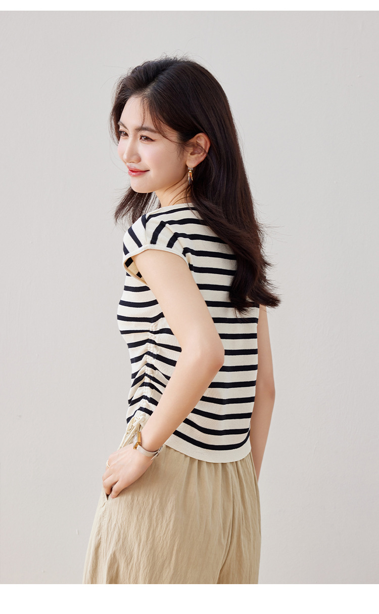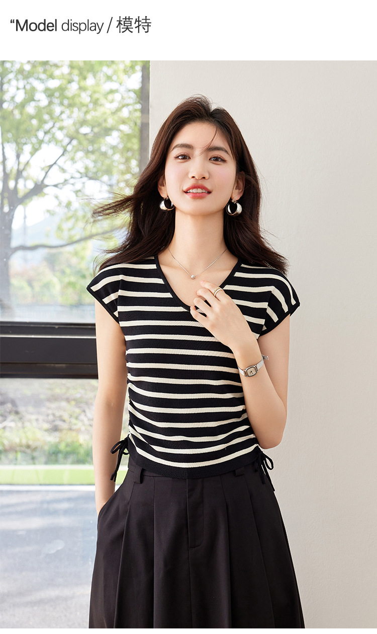 2024 년 여름 새로운 한국 스타일 디자인 센스 드로우 스트링 타이트 허리 짧은 줄무늬 풀오버 라운드 넥 짧은 소매 니트 탑스토어 가기