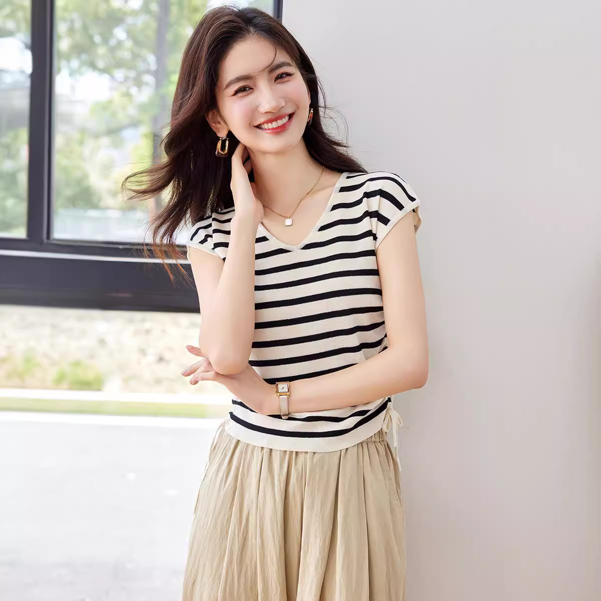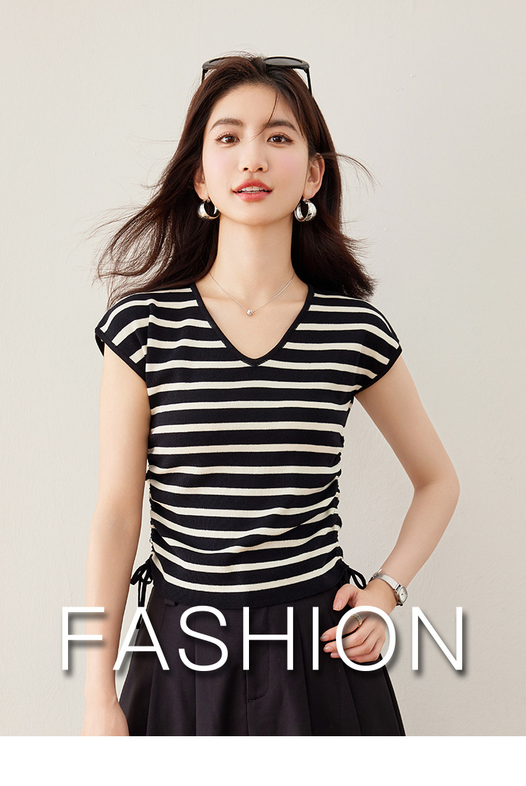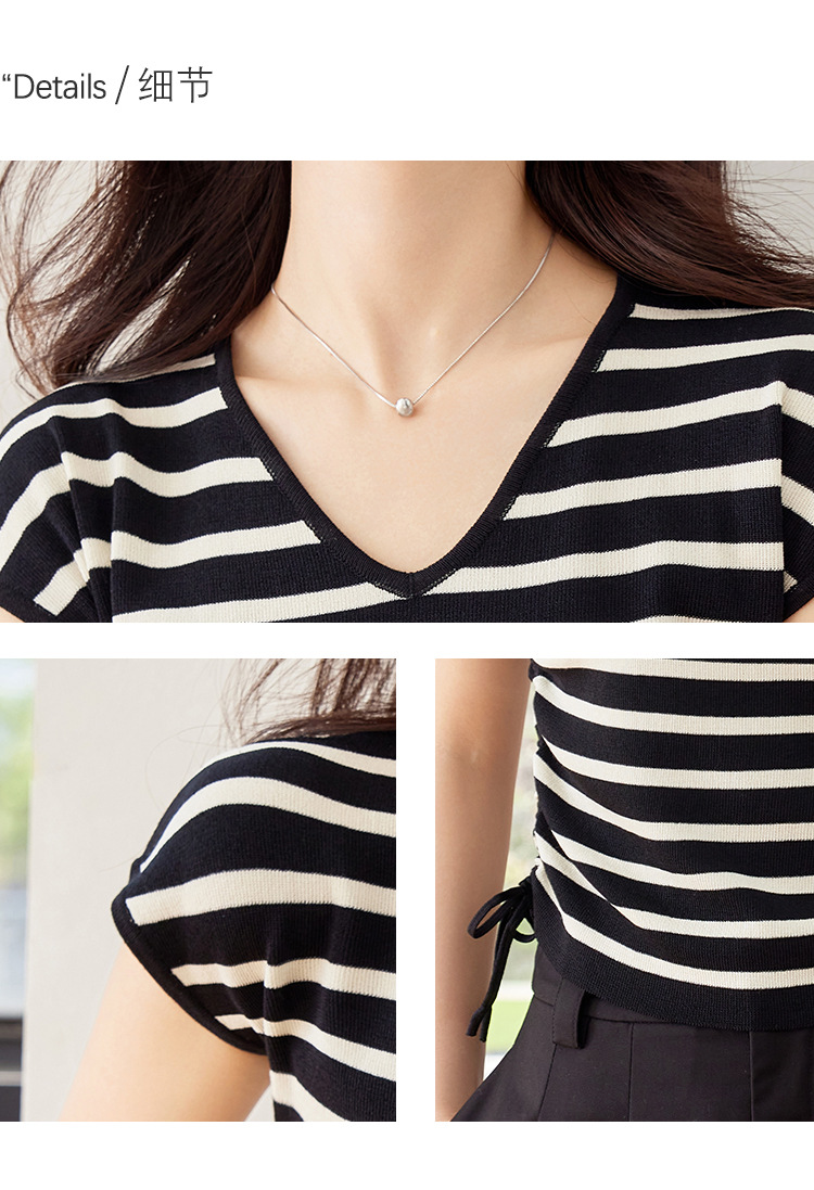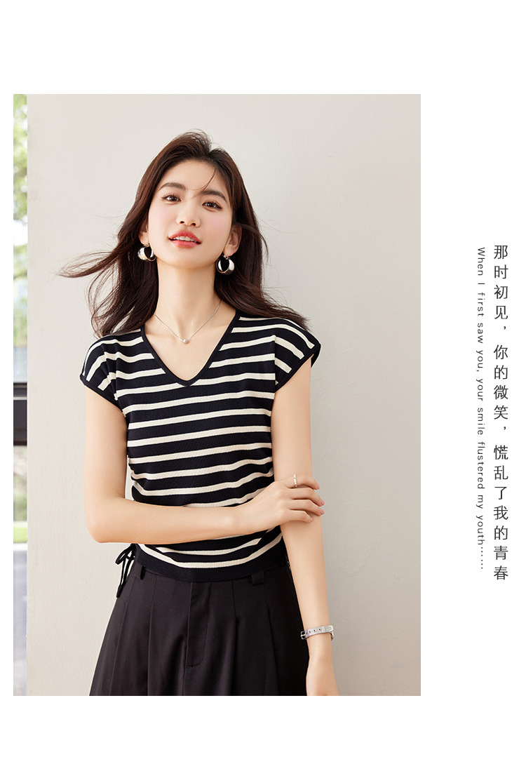 2024 년 여름 새로운 한국 스타일 디자인 센스 드로우 스트링 타이트 허리 짧은 줄무늬 풀오버 라운드 넥 짧은 소매 니트 탑스토어 가기