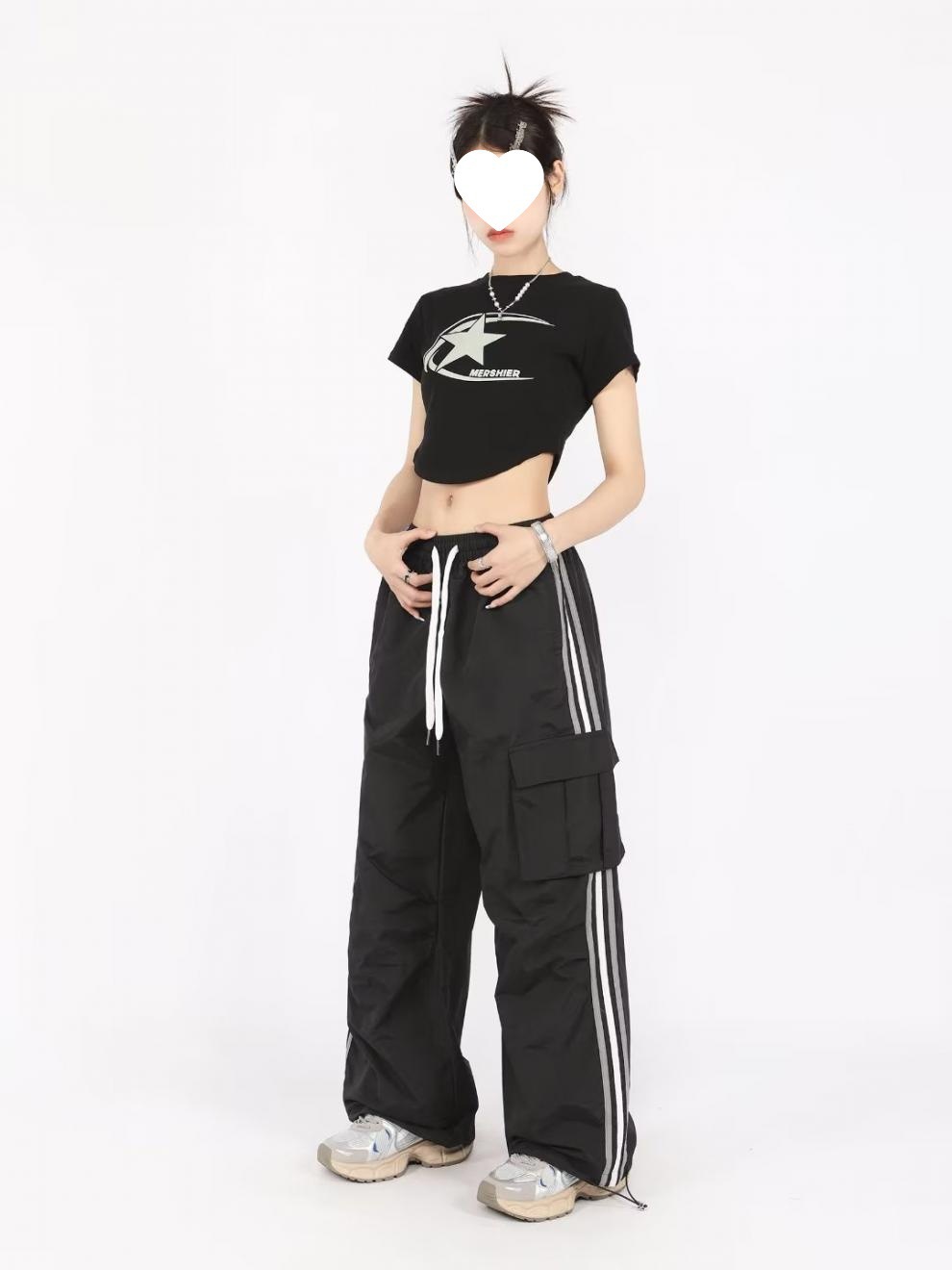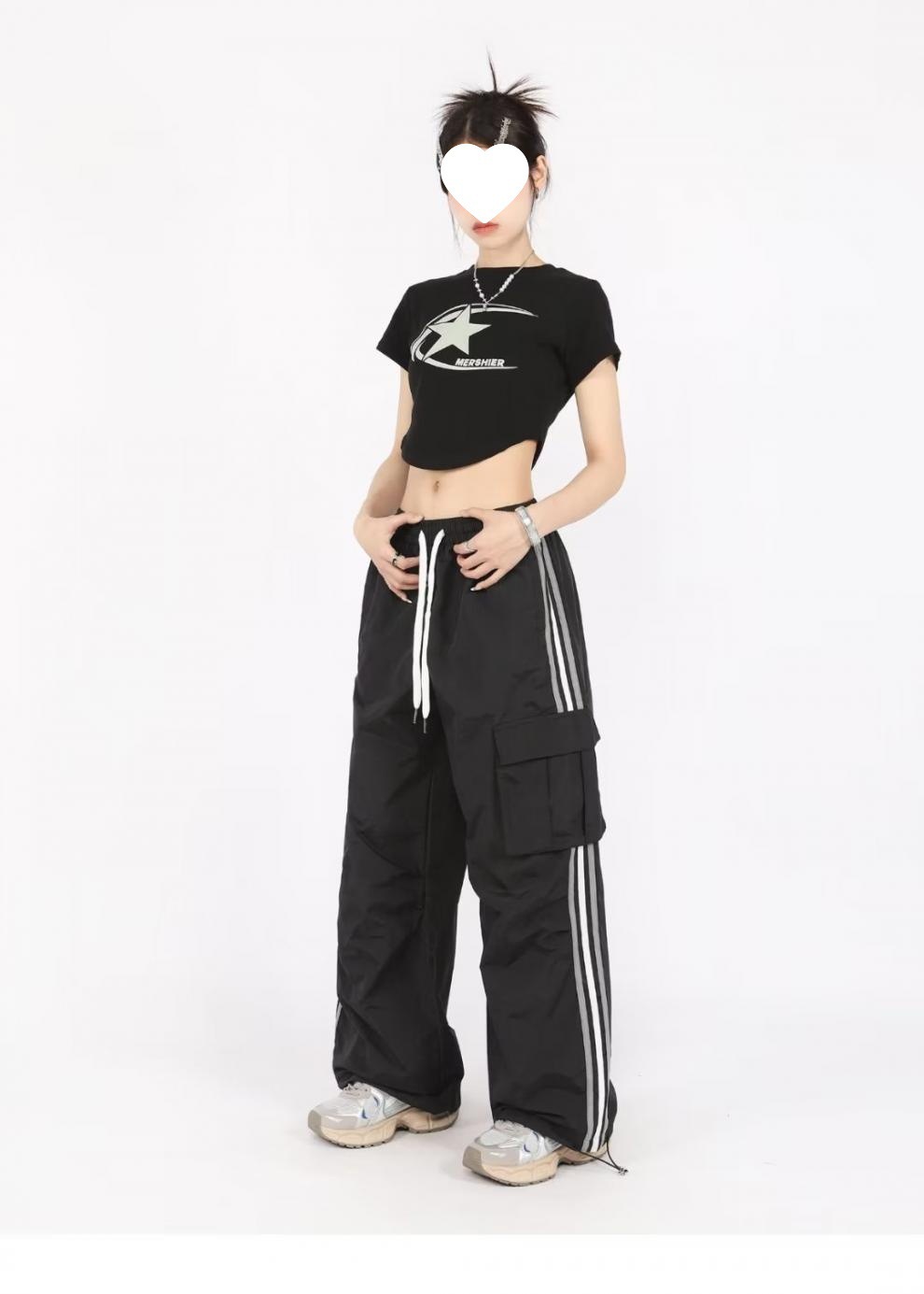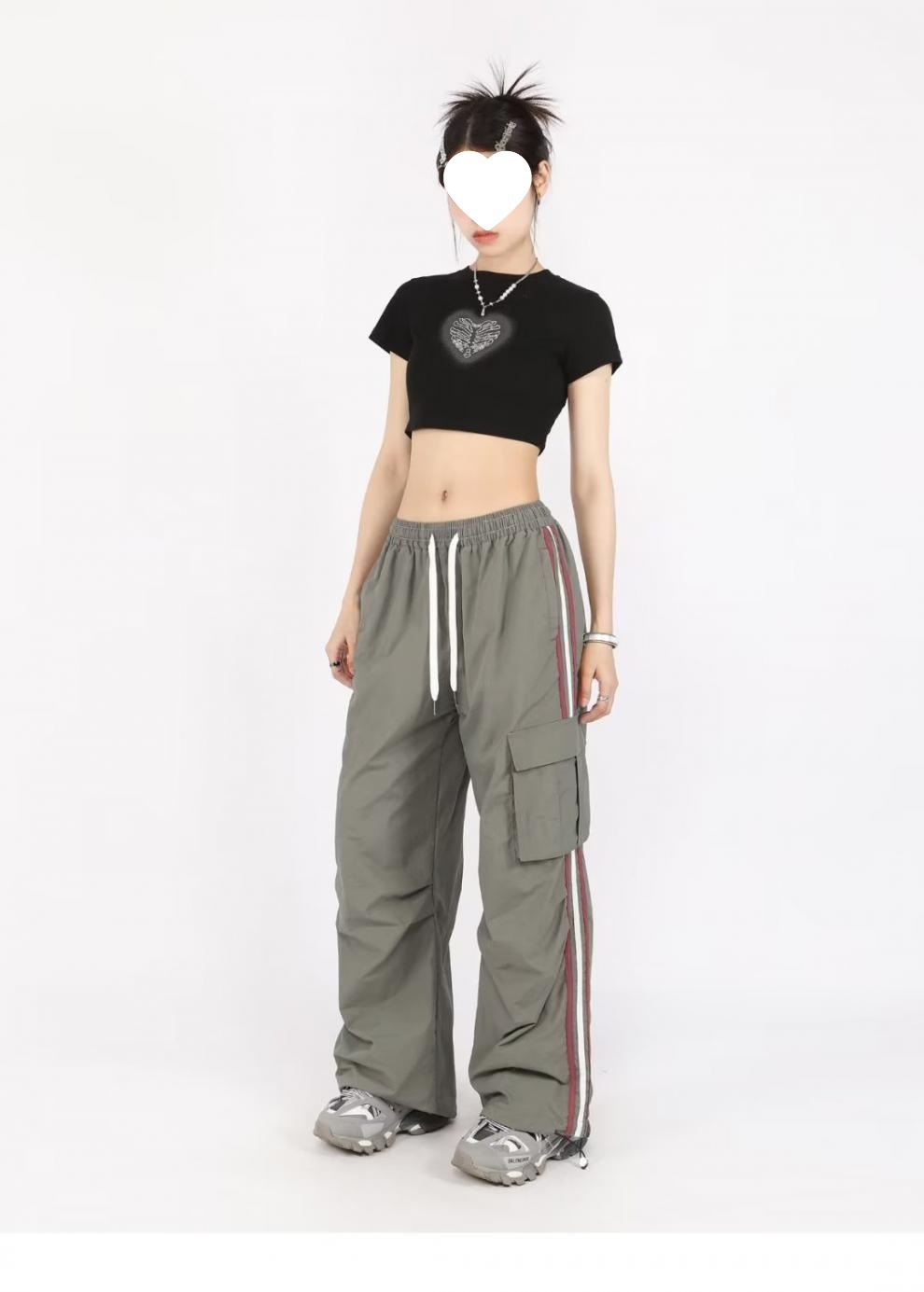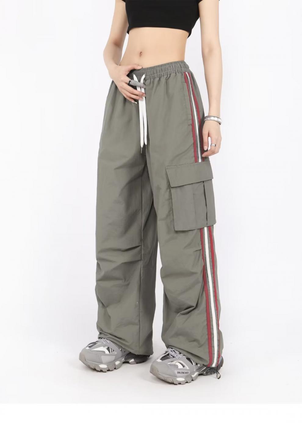 아메리칸 스타일 오버홀 여성 여름 느슨한 스트레이트 와이드 레그 캐주얼 바지 레트로 컬러 스트라이프 스포츠 충전 바지 트렌디스토어 가기