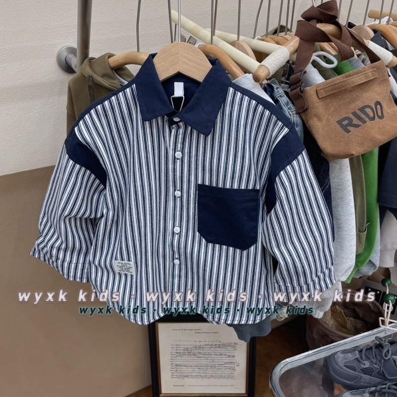 줄무늬 컬러 매칭 포켓 긴 소매 셔츠 봄과 가을 셔츠 코트 면 2024 봄 새로운 소년 외국 스타일 한국 스타일스토어 가기