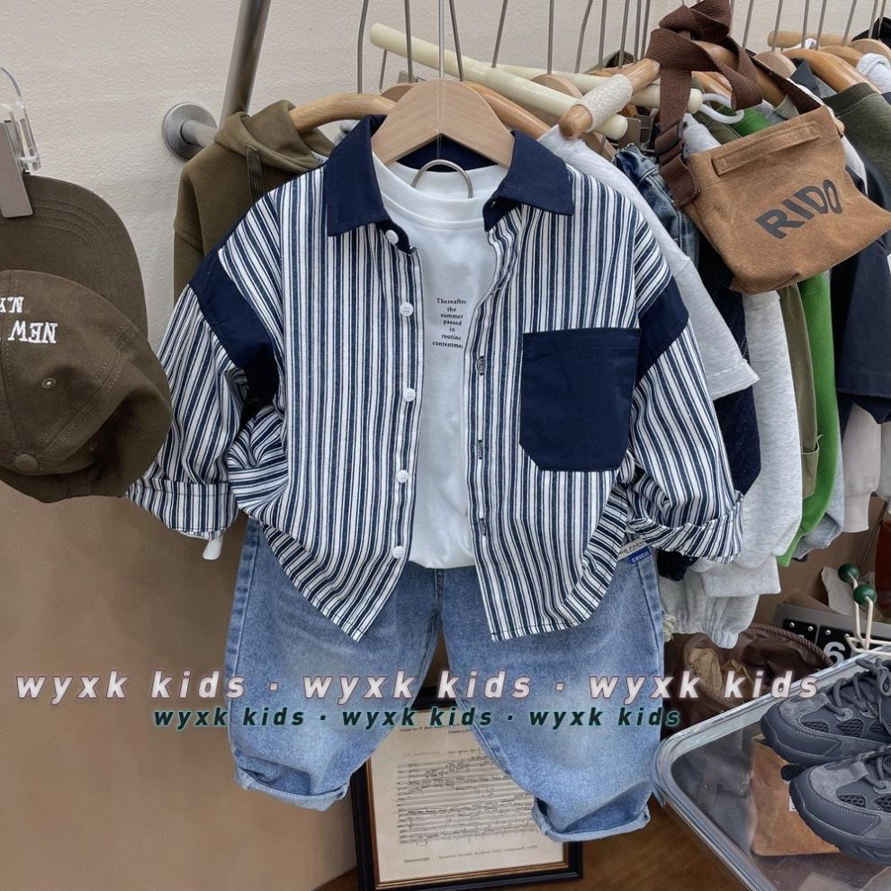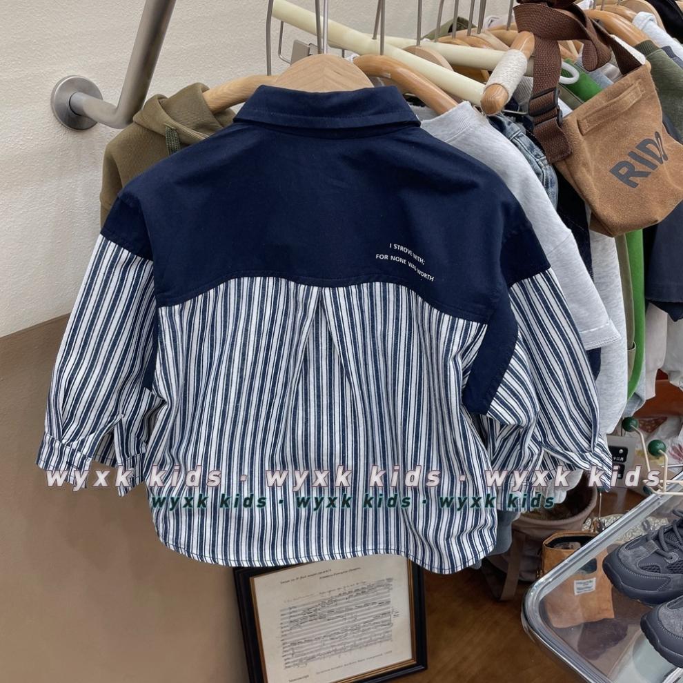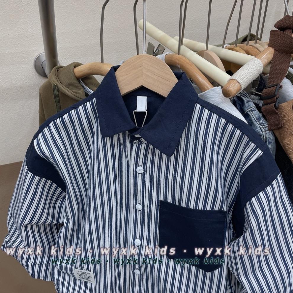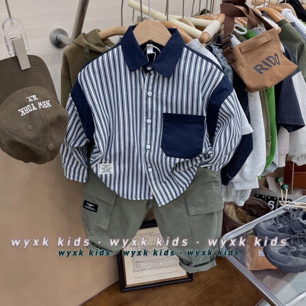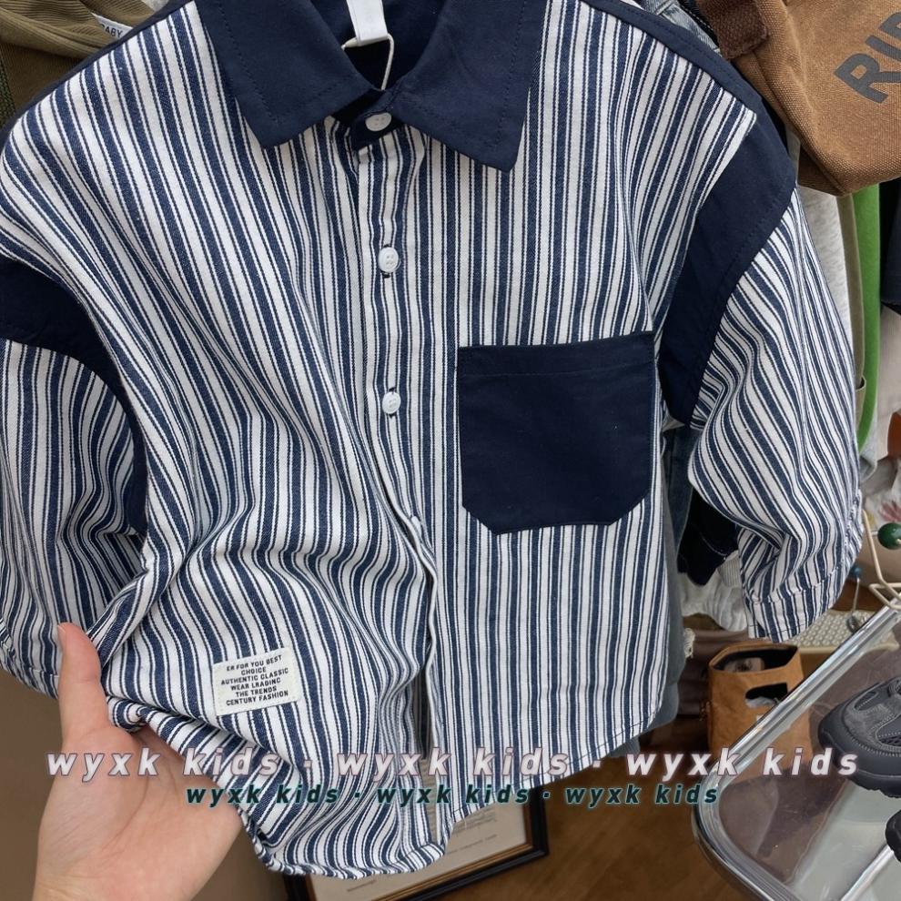 条纹拼色口袋长袖衬衫春秋款衬衣外套纯棉2023春季新款男童洋气韩