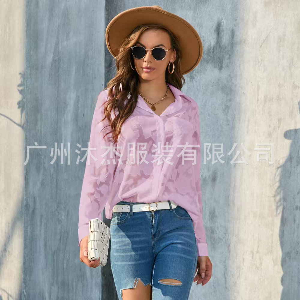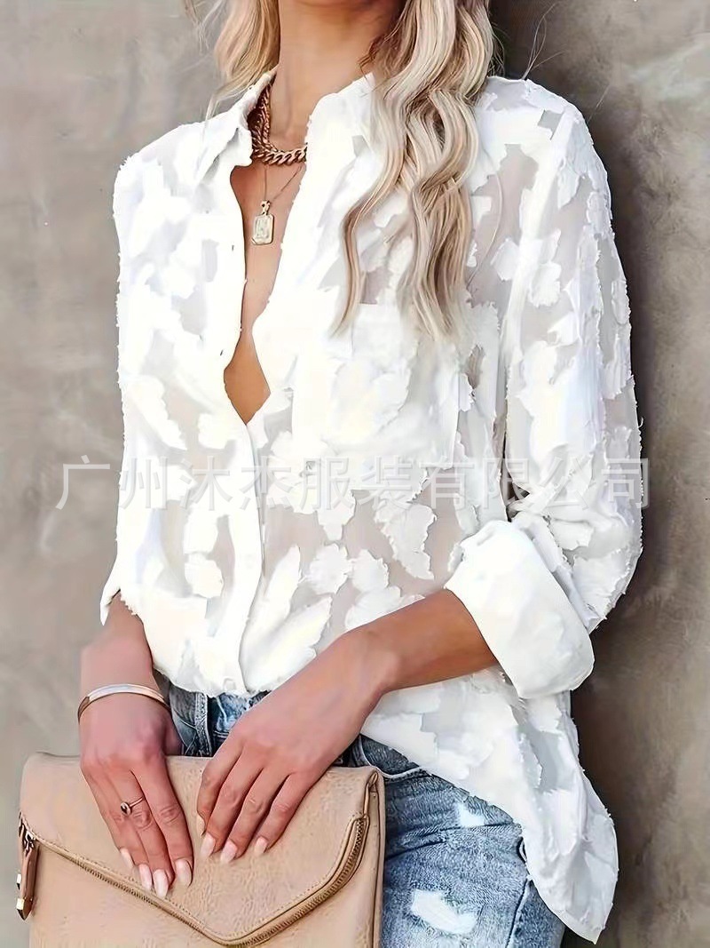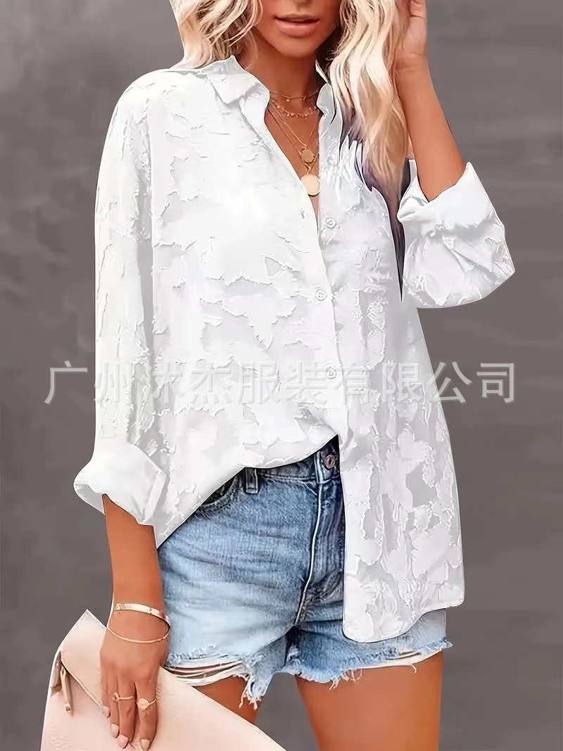 국경 간 유럽과 미국의 소스 아마존 2024 새로운 패션 플러스 사이즈 쉬폰 자카드 여성용 단색 캐주얼 셔츠