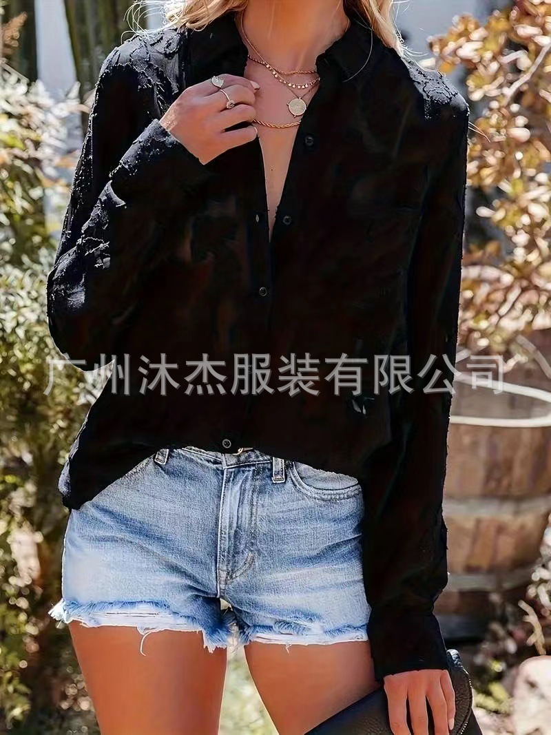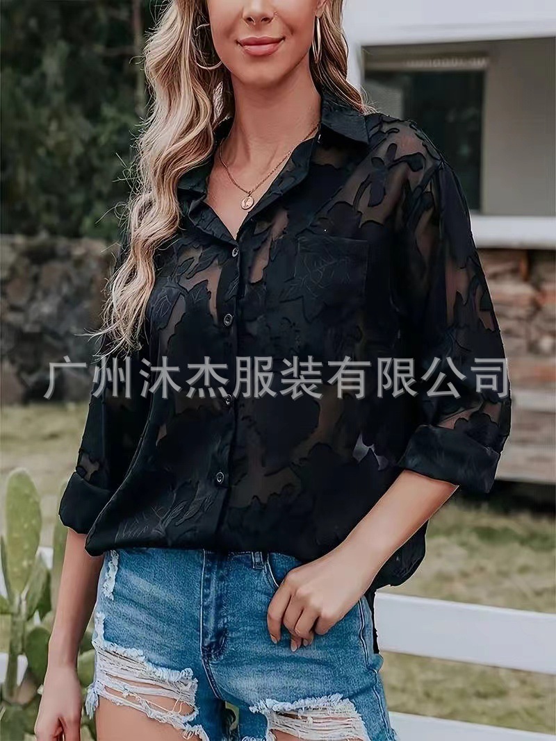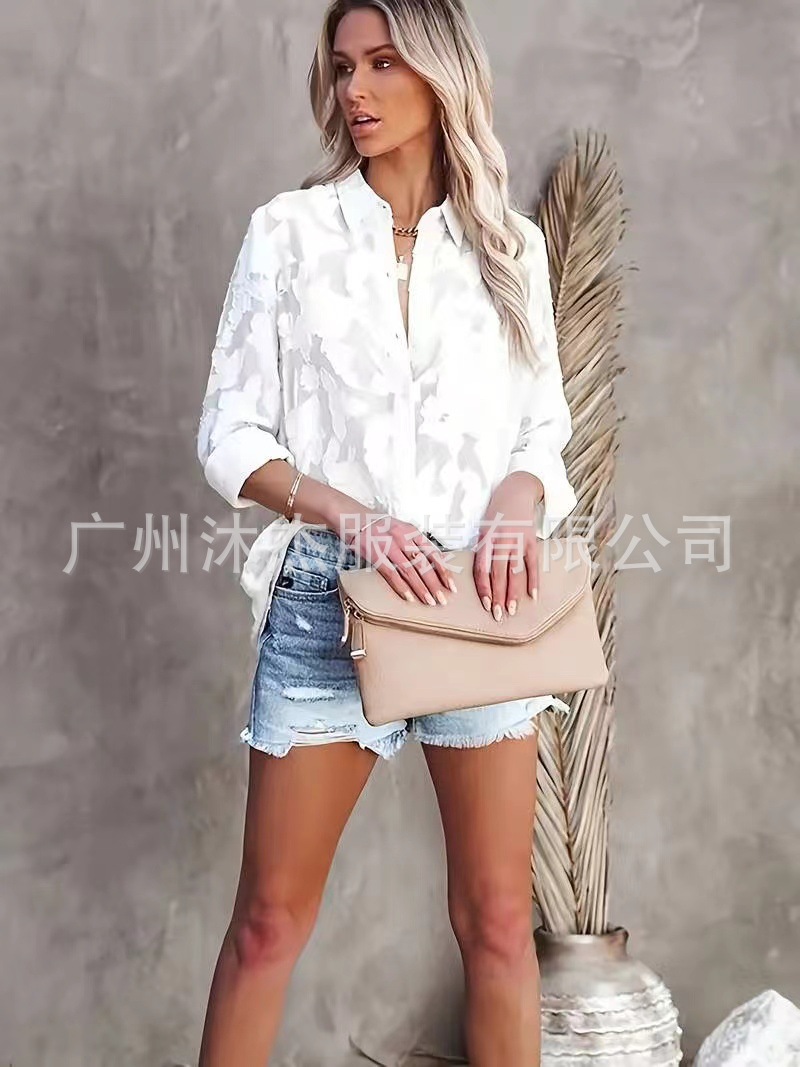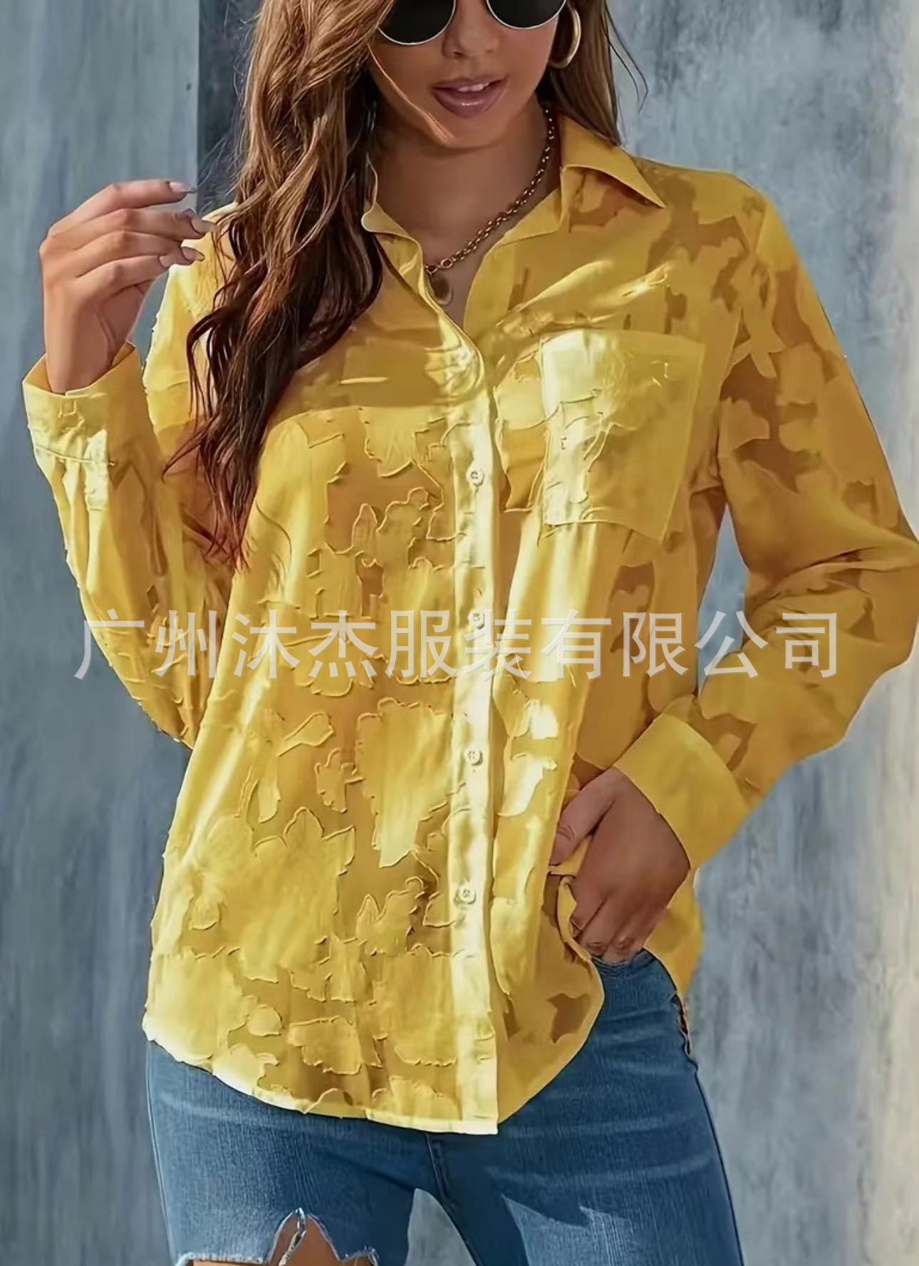 국경 간 유럽과 미국의 소스 아마존 2024 새로운 패션 플러스 사이즈 쉬폰 자카드 여성용 단색 캐주얼 셔츠
