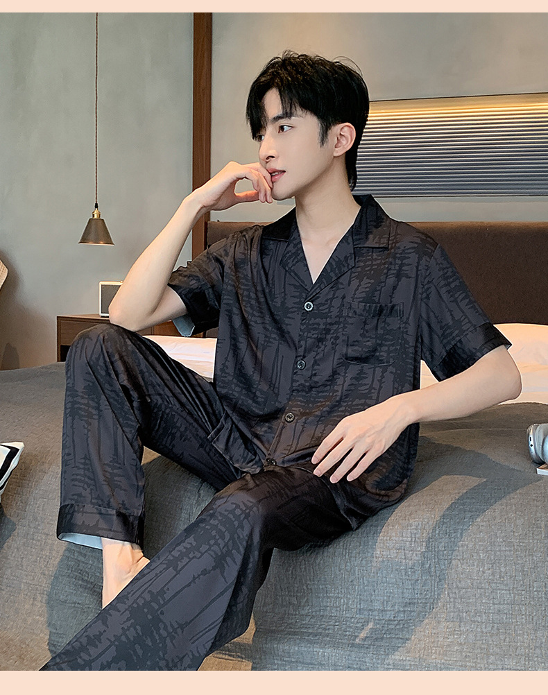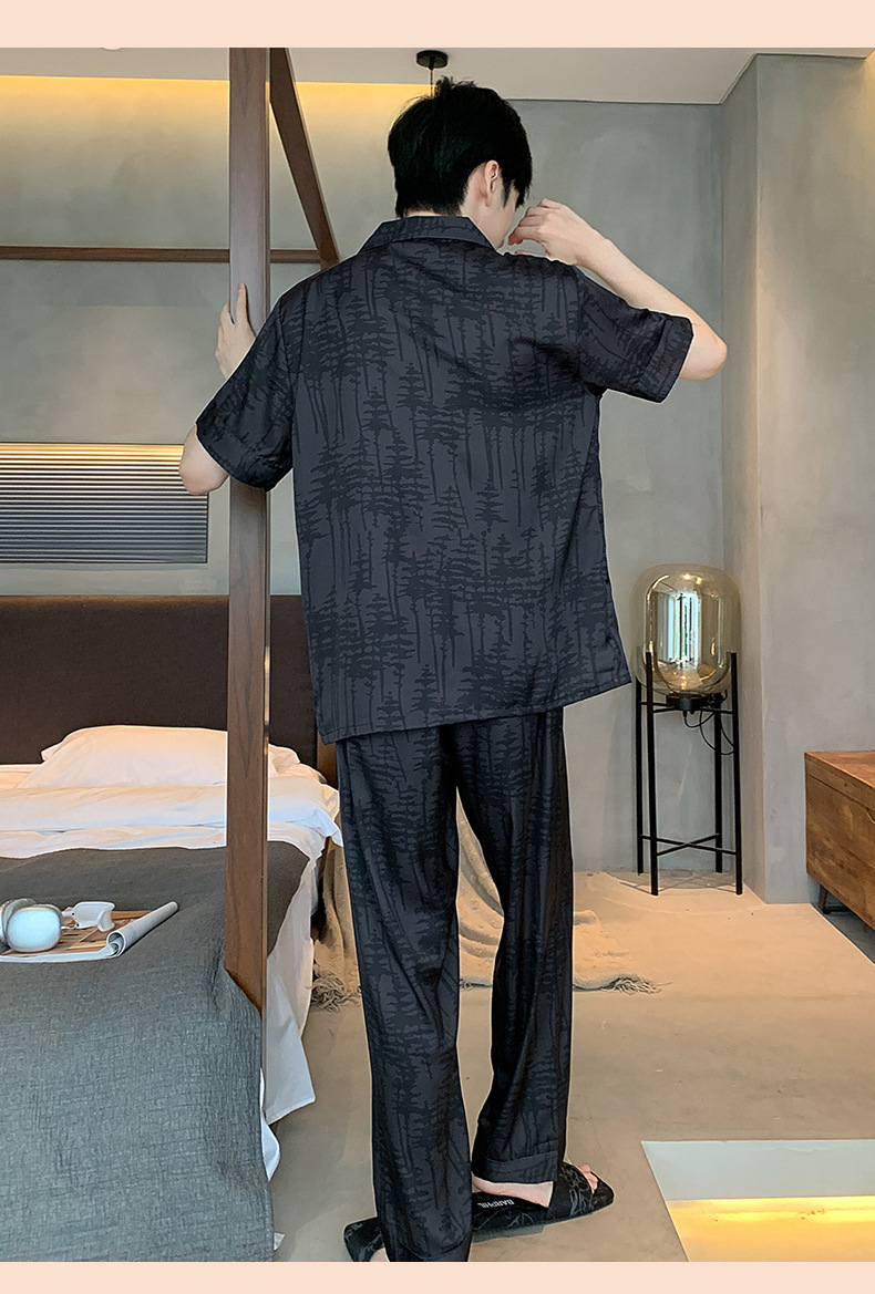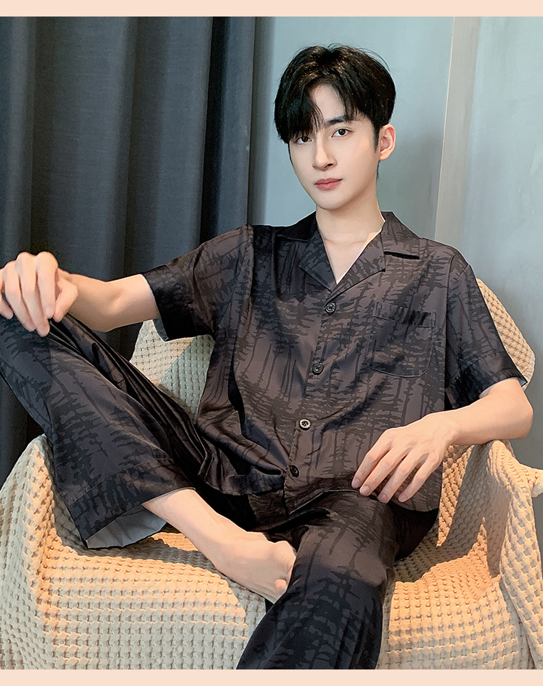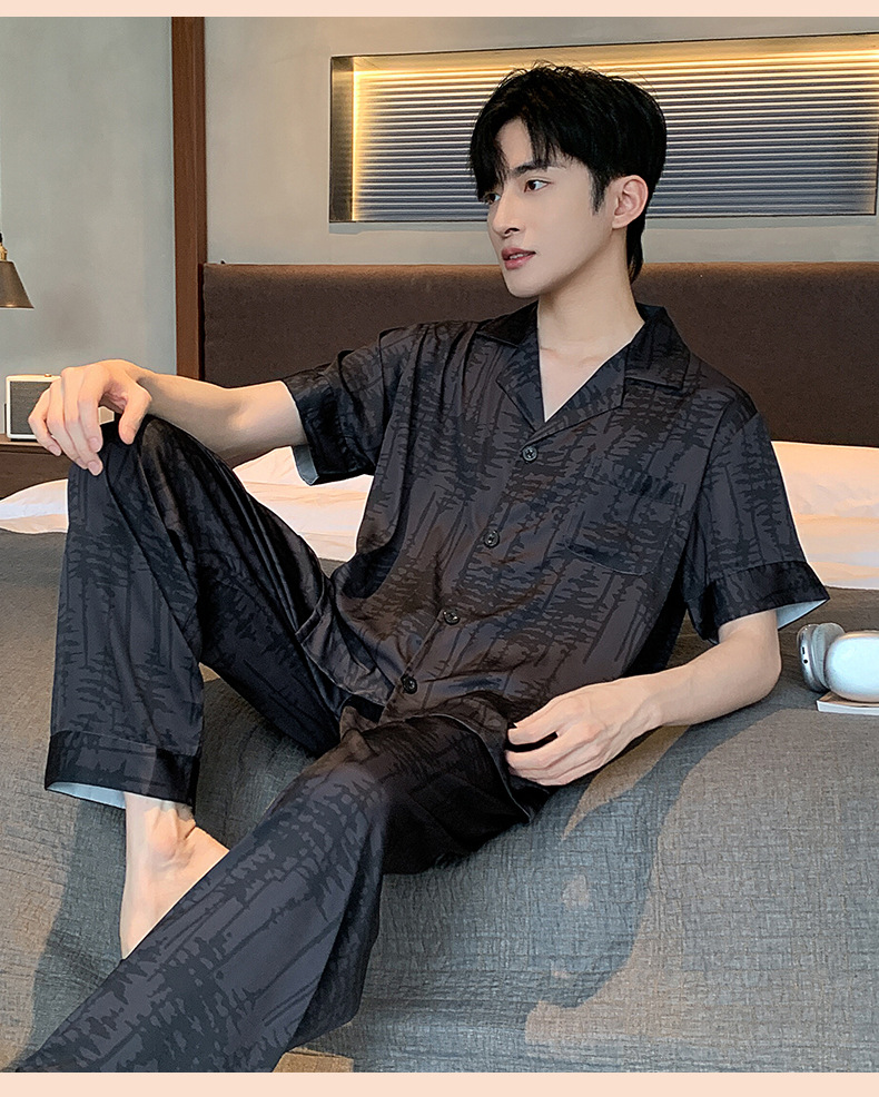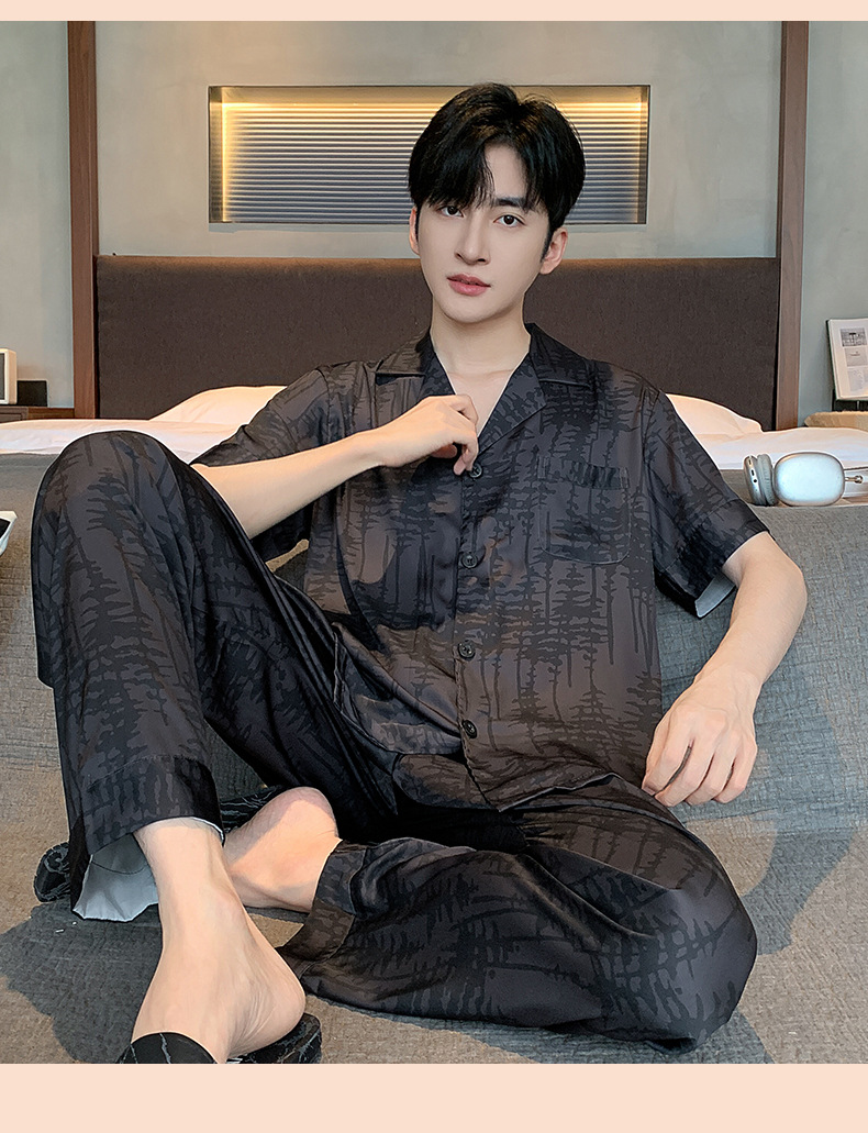 2024 여름 새로운 아이스 실크 잠옷 남자의 V-Neck 얇은 바지 짧은 소매 줄무늬 카디건 캐주얼 홈 의류 세트