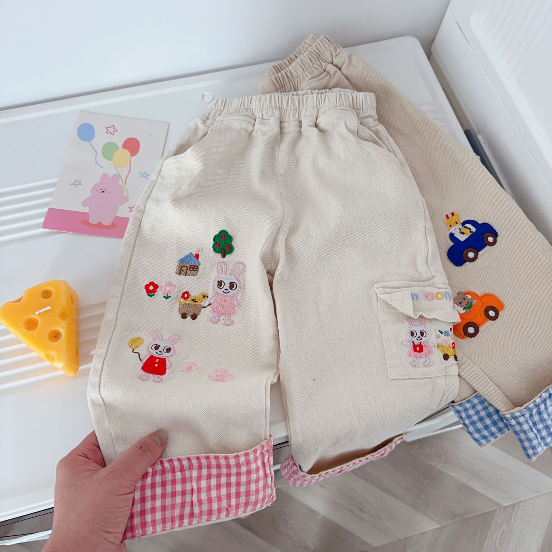 아동용 바지 26년 봄 모델, 중소 아동용 봄 캐주얼 바지, 재고 있음, 만화 자수, 발목 조임형 남아용 바지스토어 가기