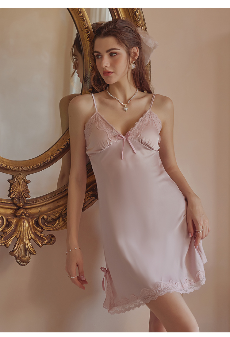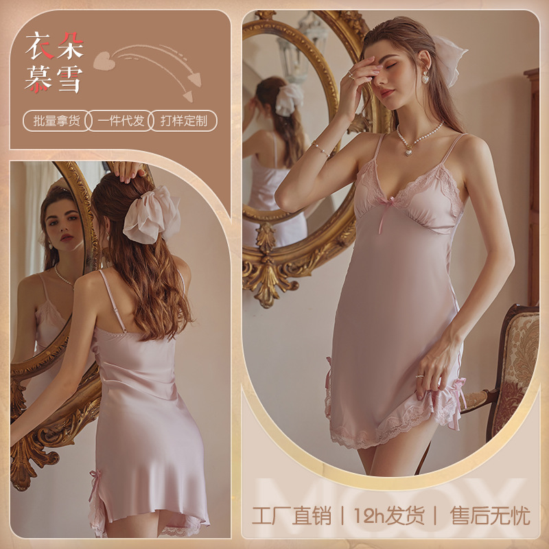 3080 Guanyun 섹시한 잠옷 가슴 패드 여성 여름 프랑스어 빛 럭셔리 홈웨어 얼음 실크 잠옷 순수한 욕망 레이스 슬링