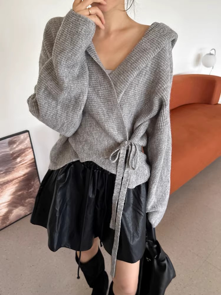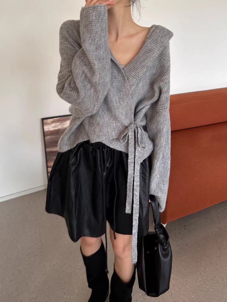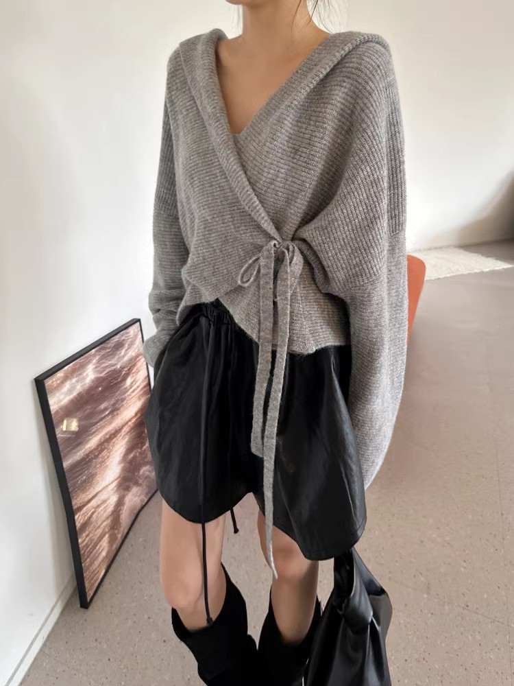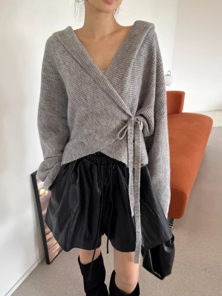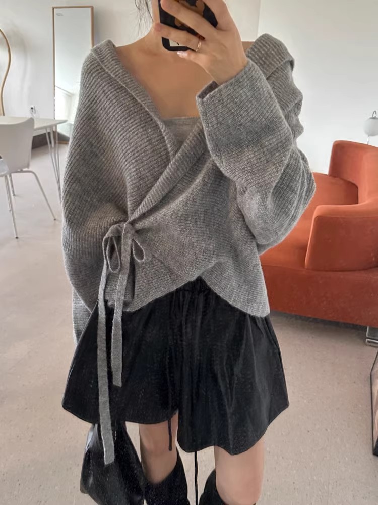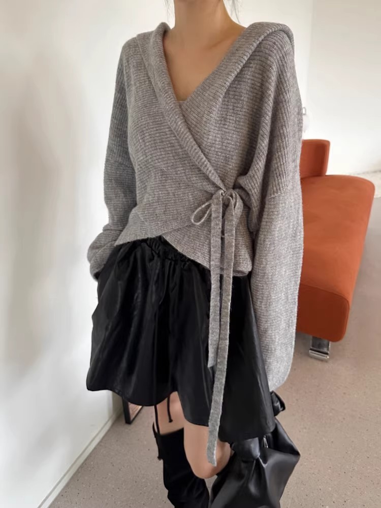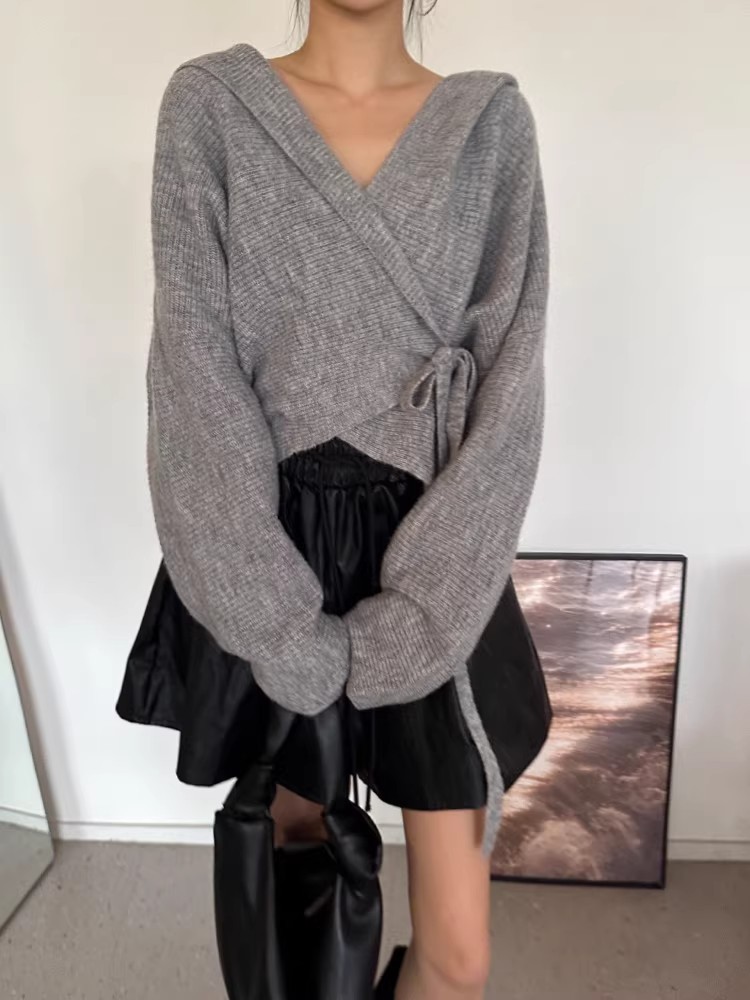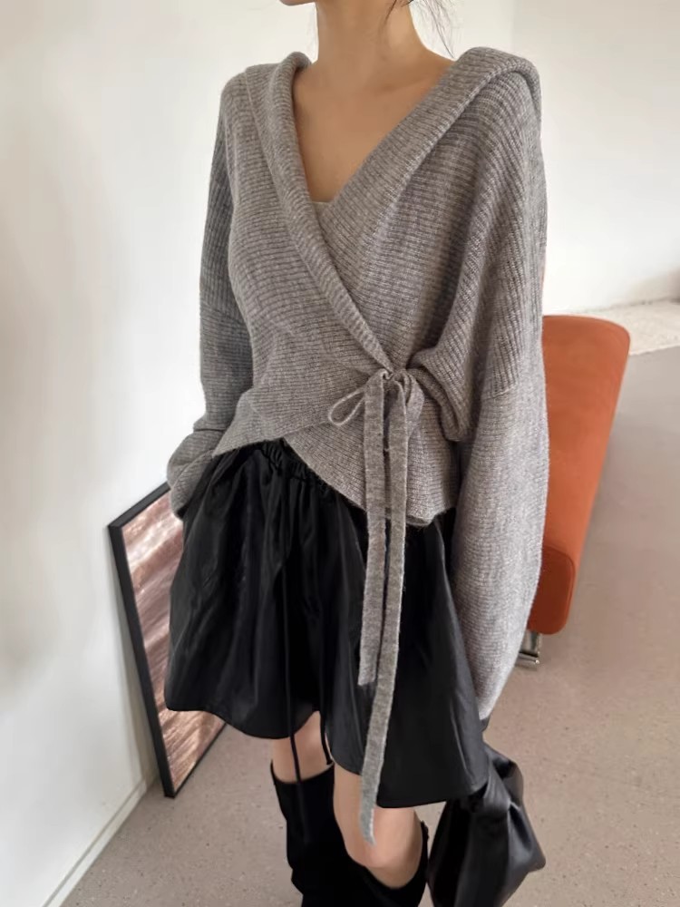 한국 세련된 가을과 겨울 빈티지 기질 크로스 v 칼라 후드 레이스 업 디자인 느슨한 올 매치 스웨터 코트 여성