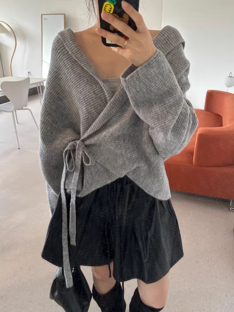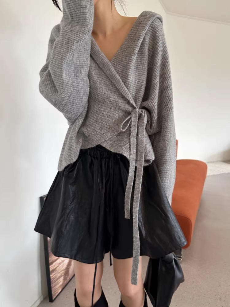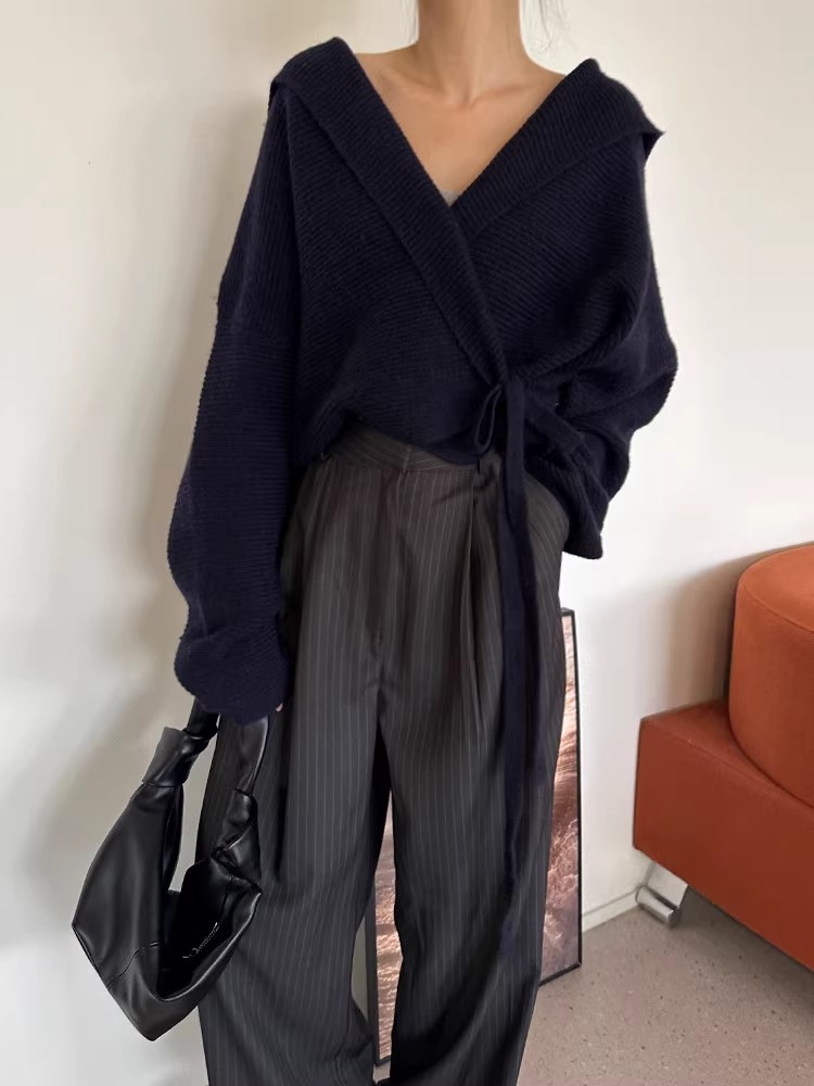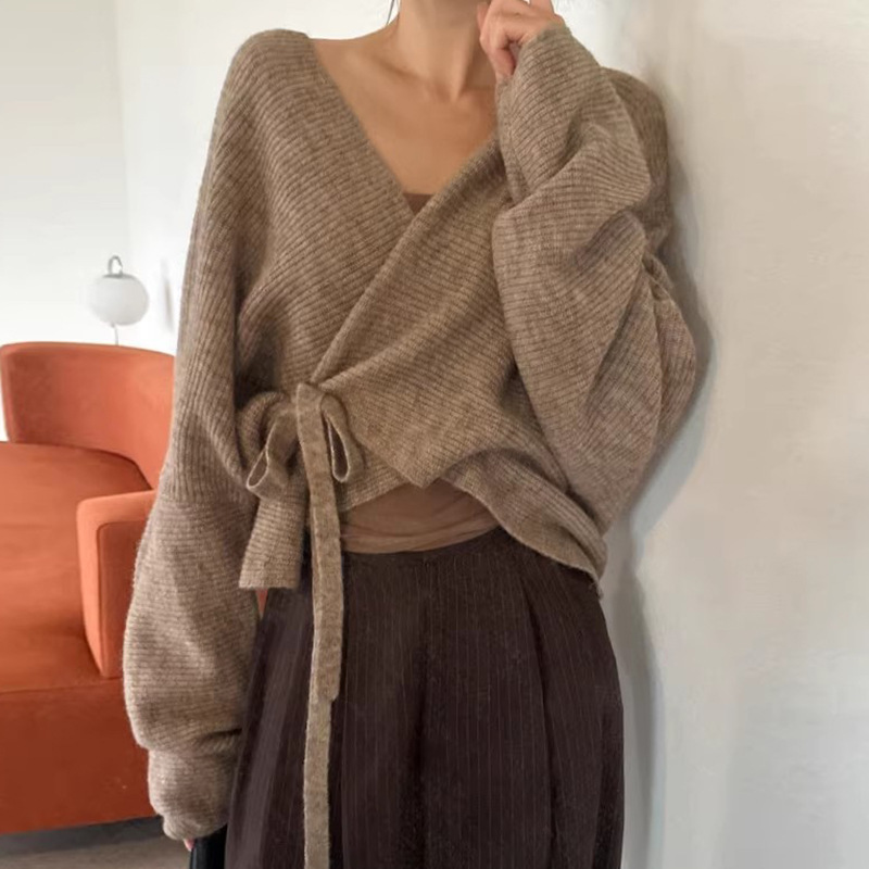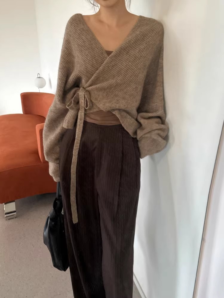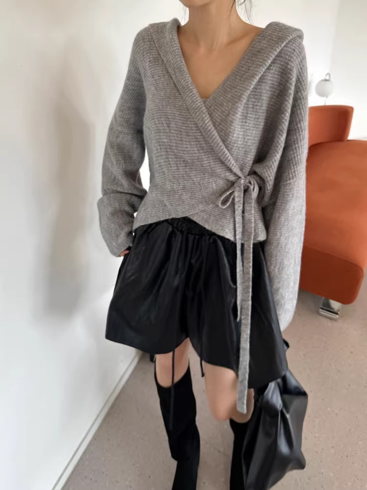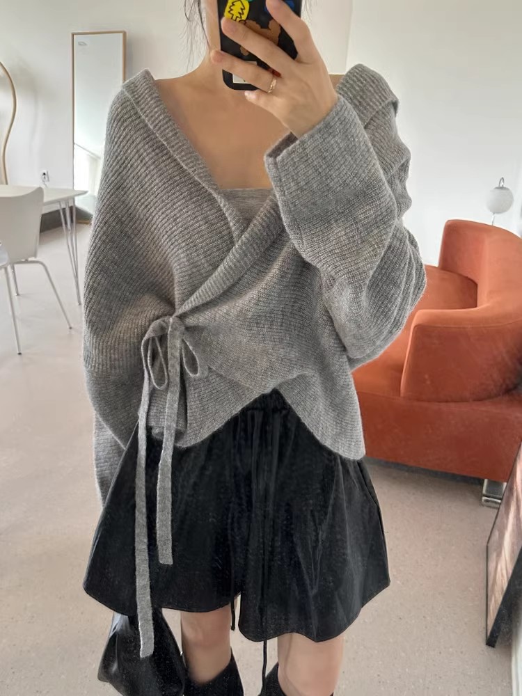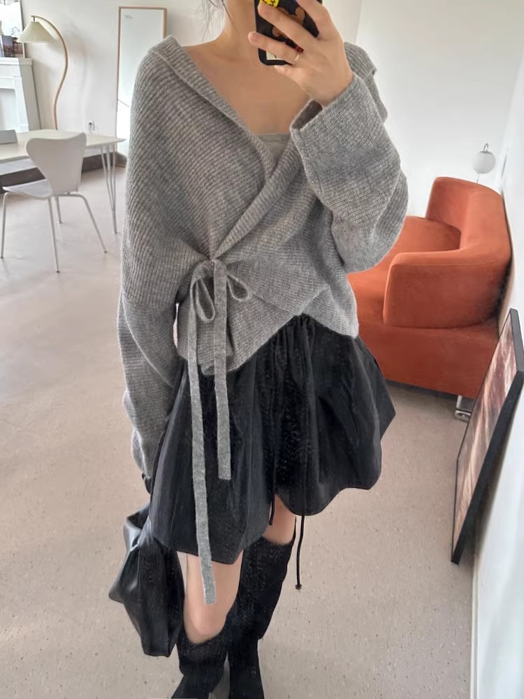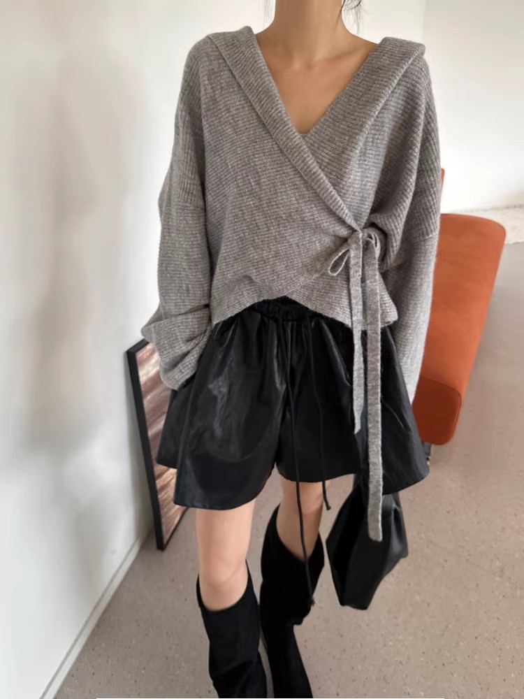 한국 세련된 가을과 겨울 빈티지 기질 크로스 v 칼라 후드 레이스 업 디자인 느슨한 올 매치 스웨터 코트 여성