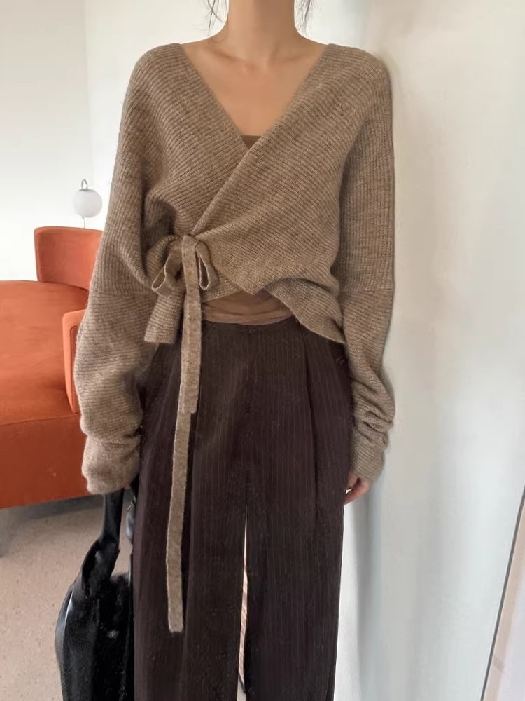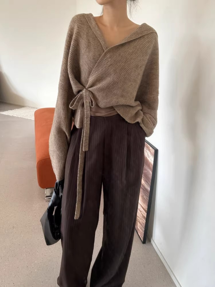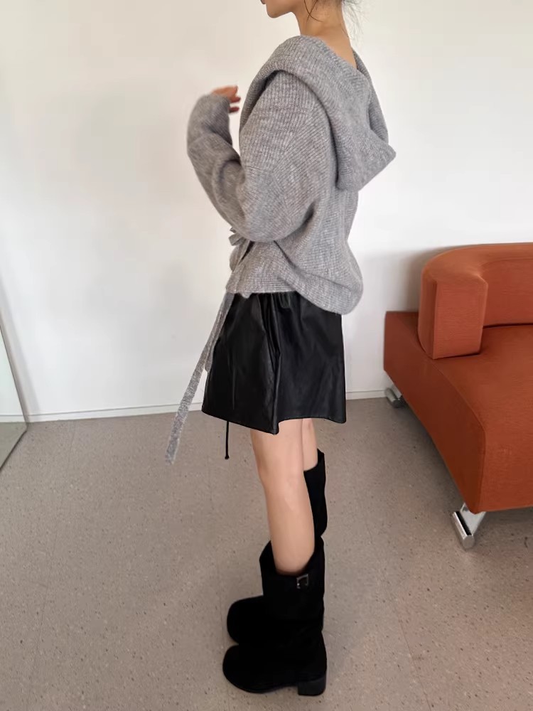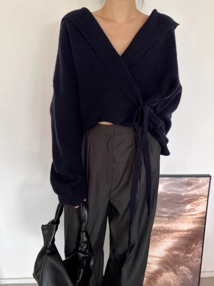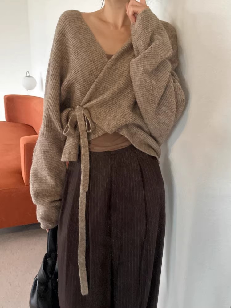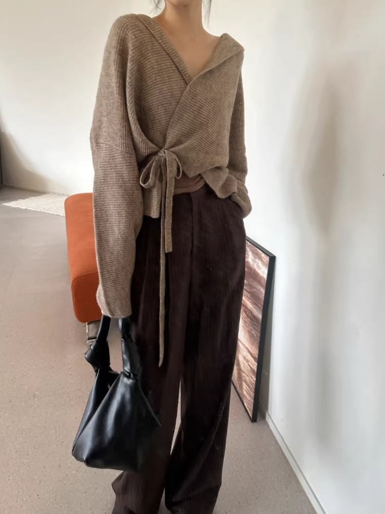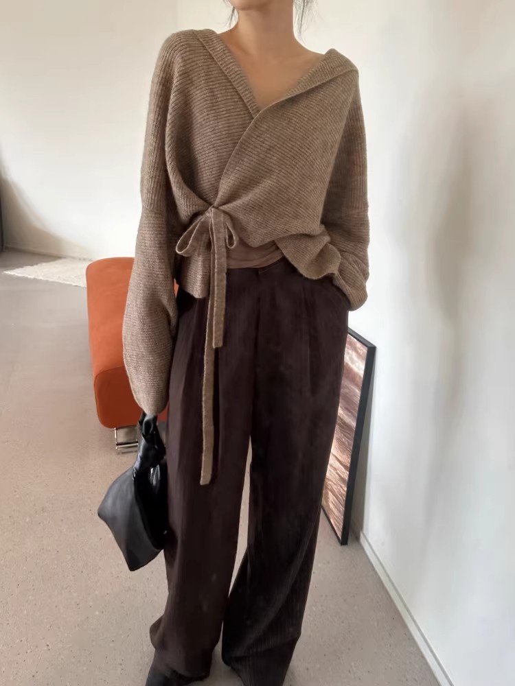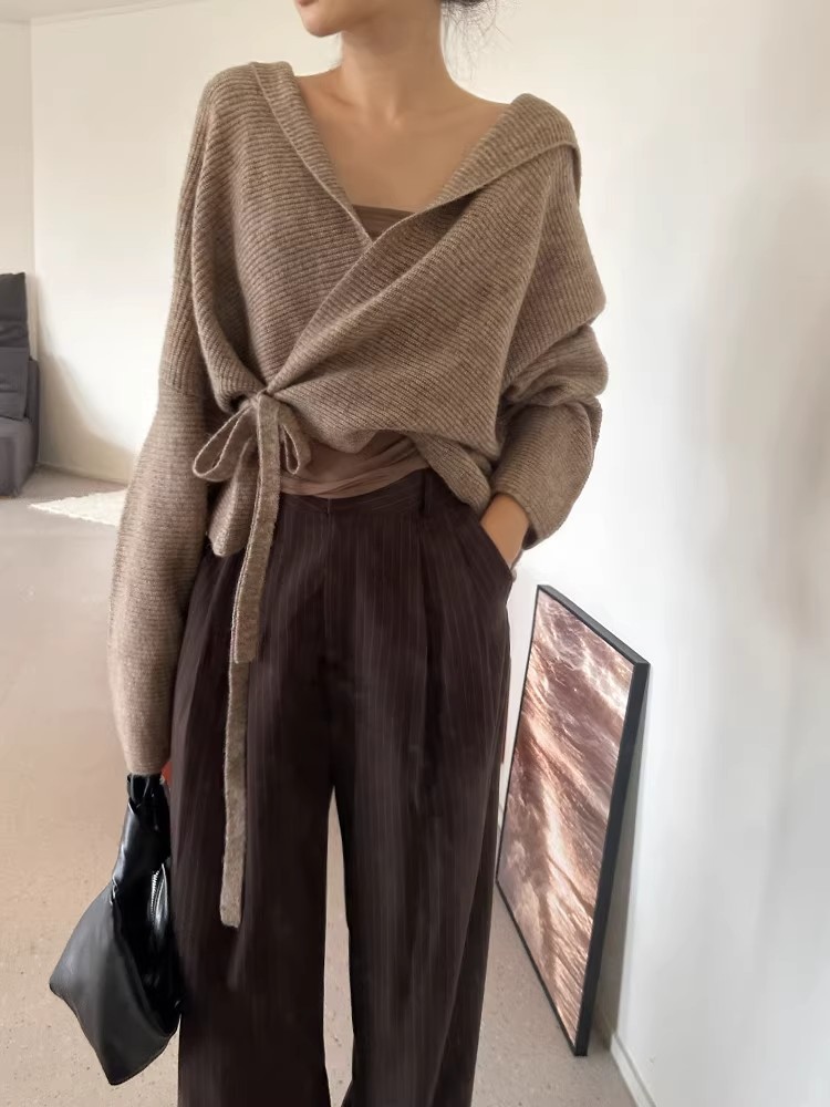 한국 세련된 가을과 겨울 빈티지 기질 크로스 v 칼라 후드 레이스 업 디자인 느슨한 올 매치 스웨터 코트 여성