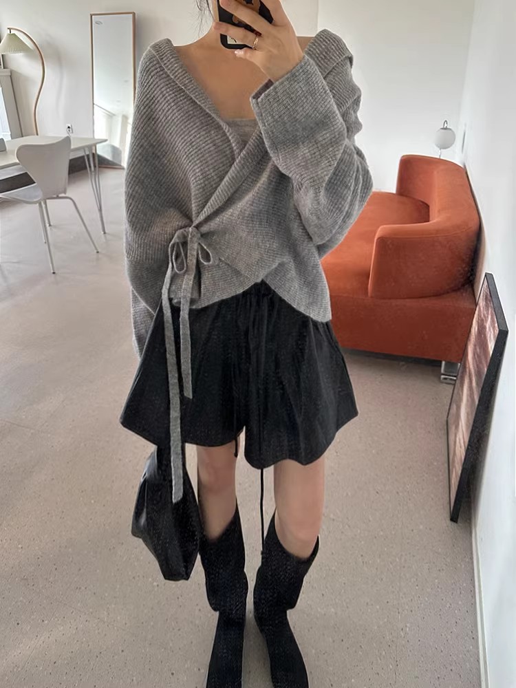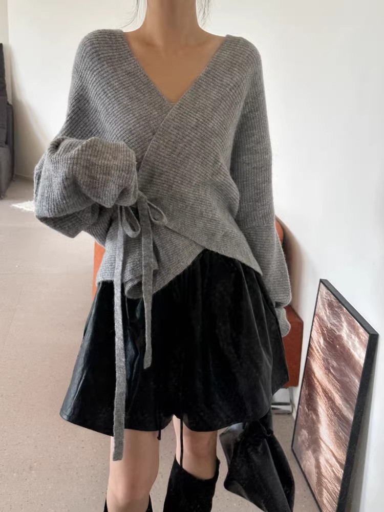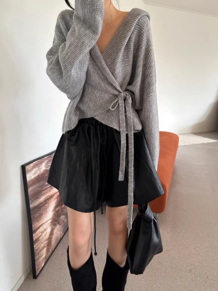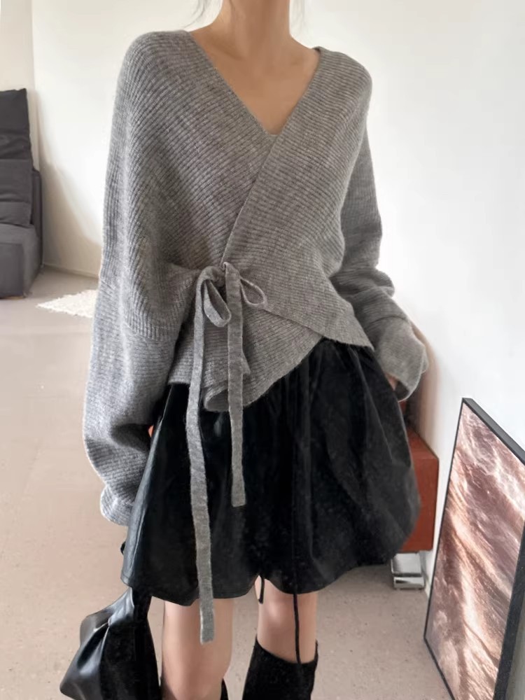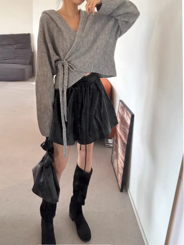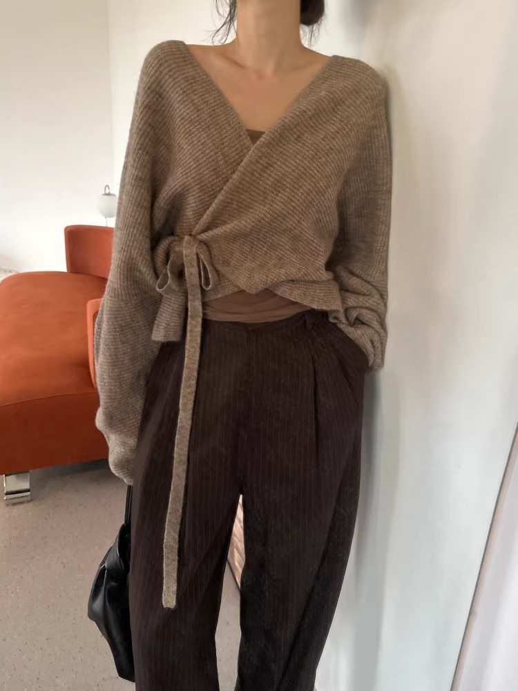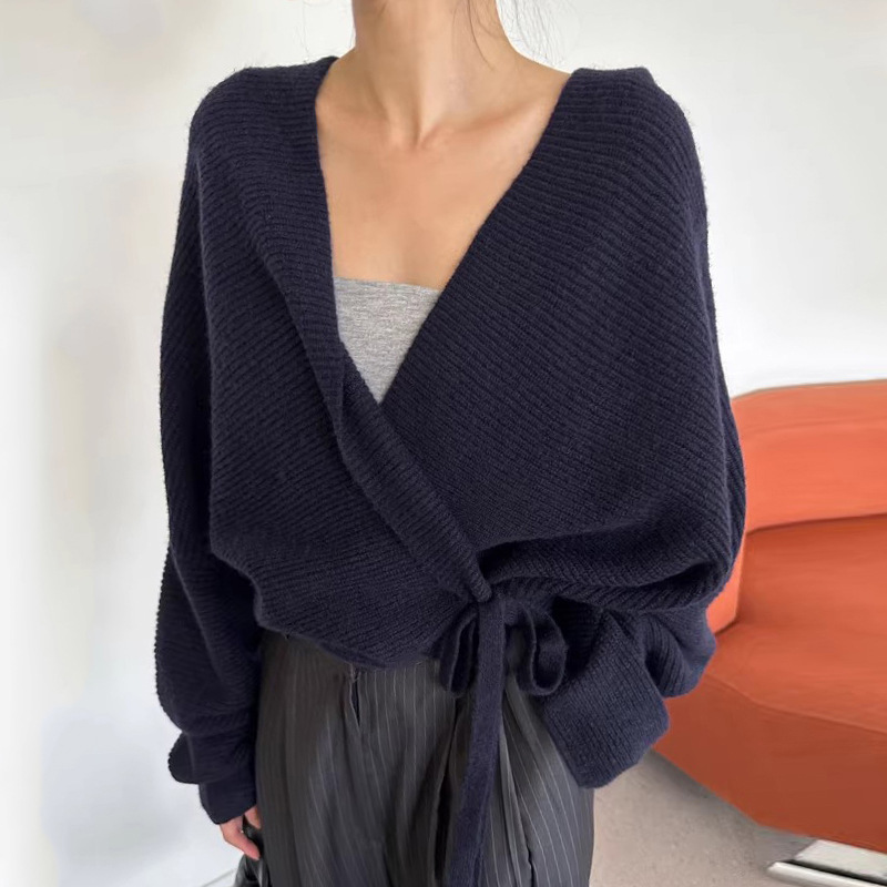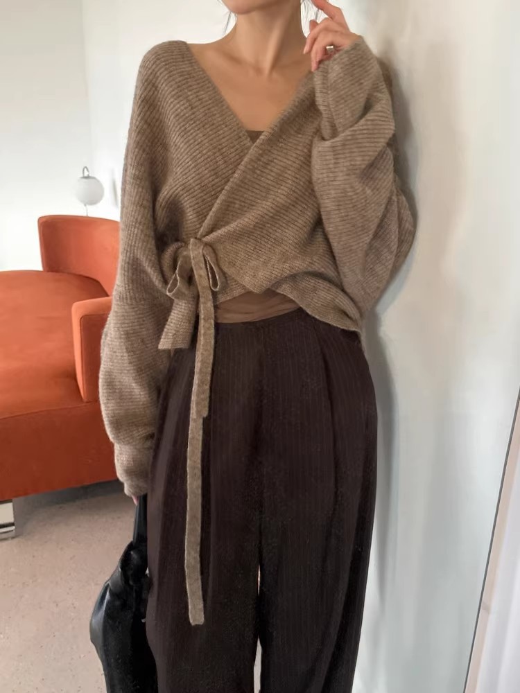 한국 세련된 가을과 겨울 빈티지 기질 크로스 v 칼라 후드 레이스 업 디자인 느슨한 올 매치 스웨터 코트 여성