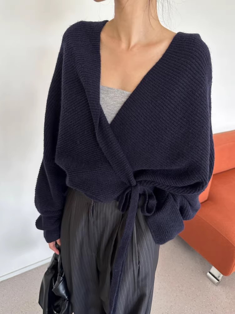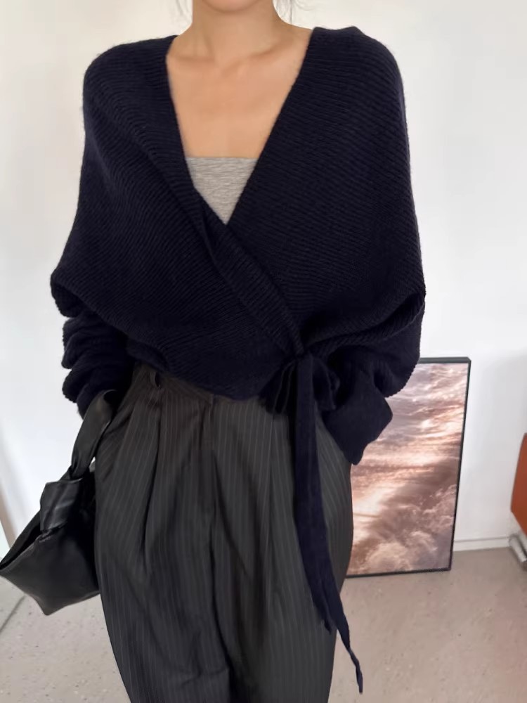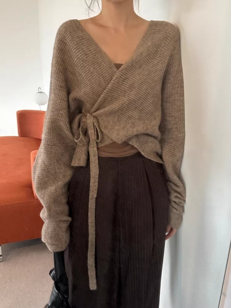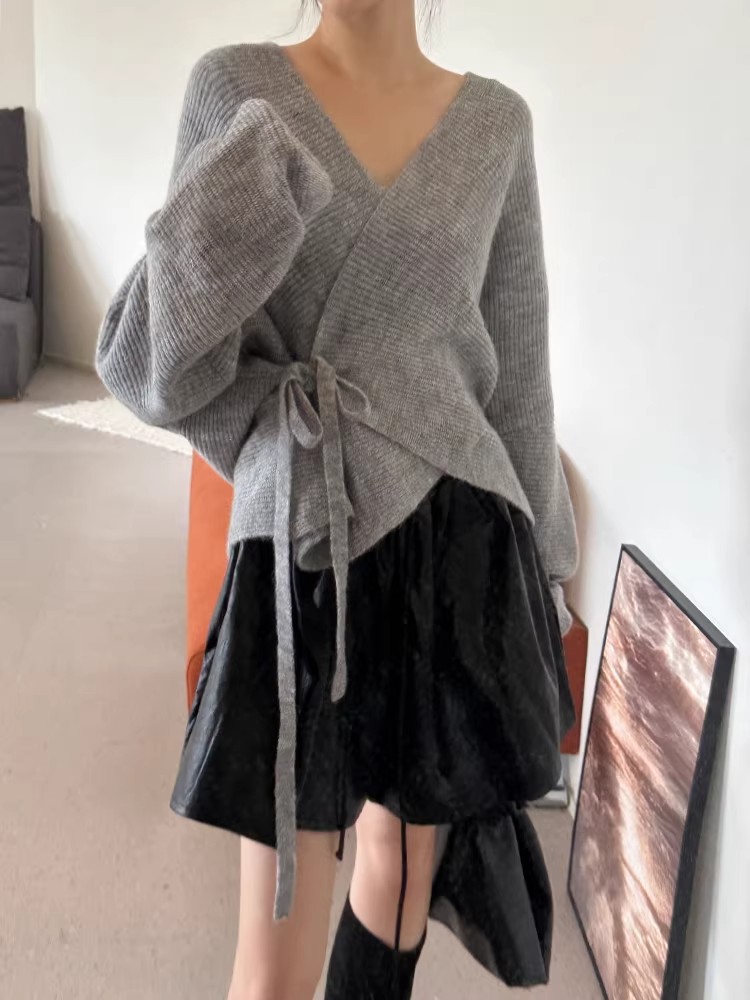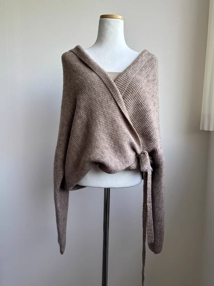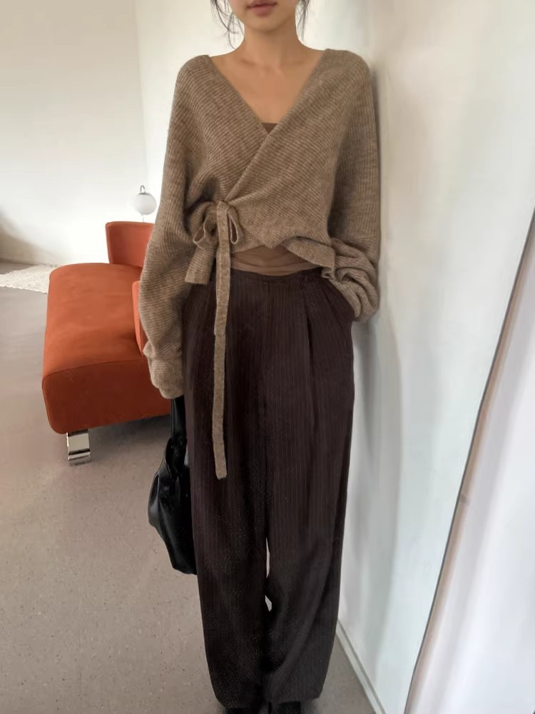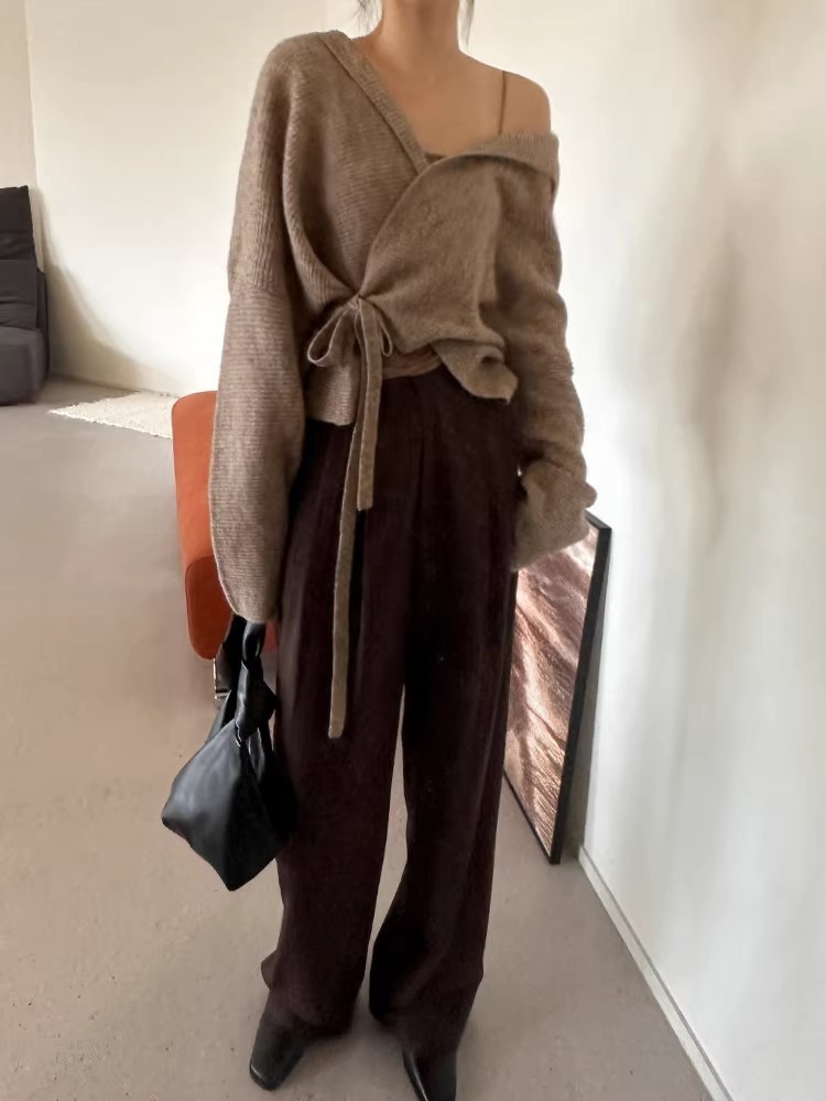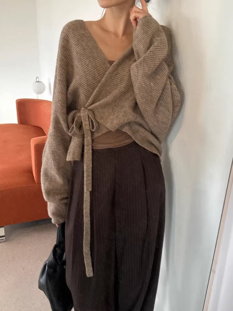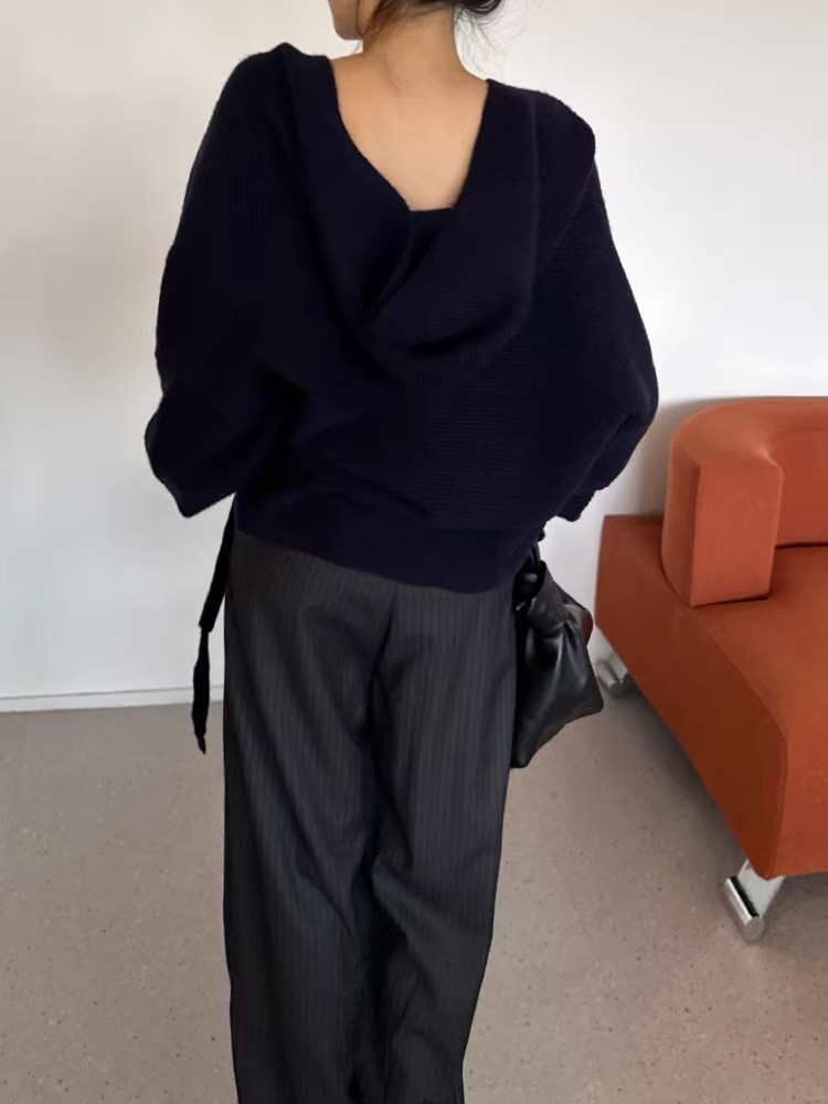한국 세련된 가을과 겨울 빈티지 기질 크로스 v 칼라 후드 레이스 업 디자인 느슨한 올 매치 스웨터 코트 여성