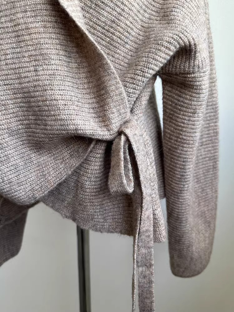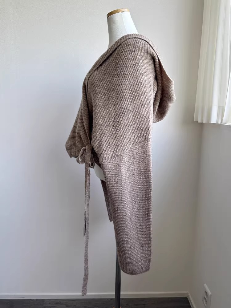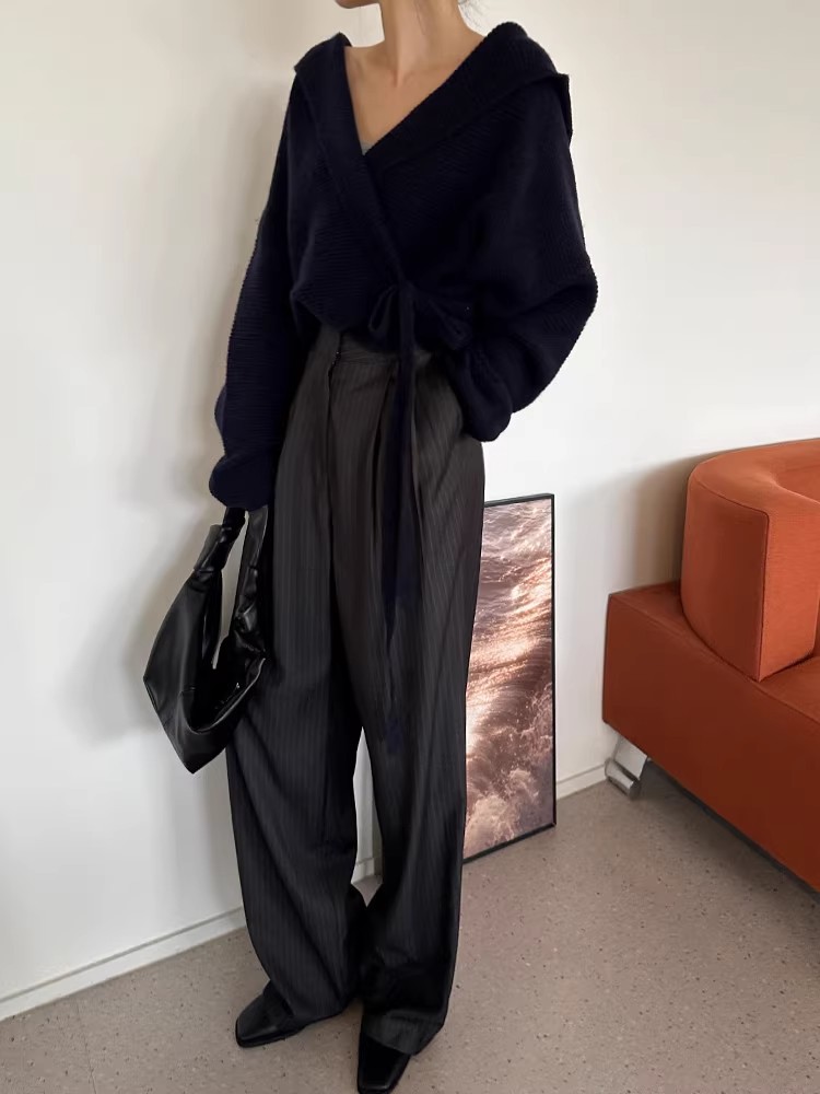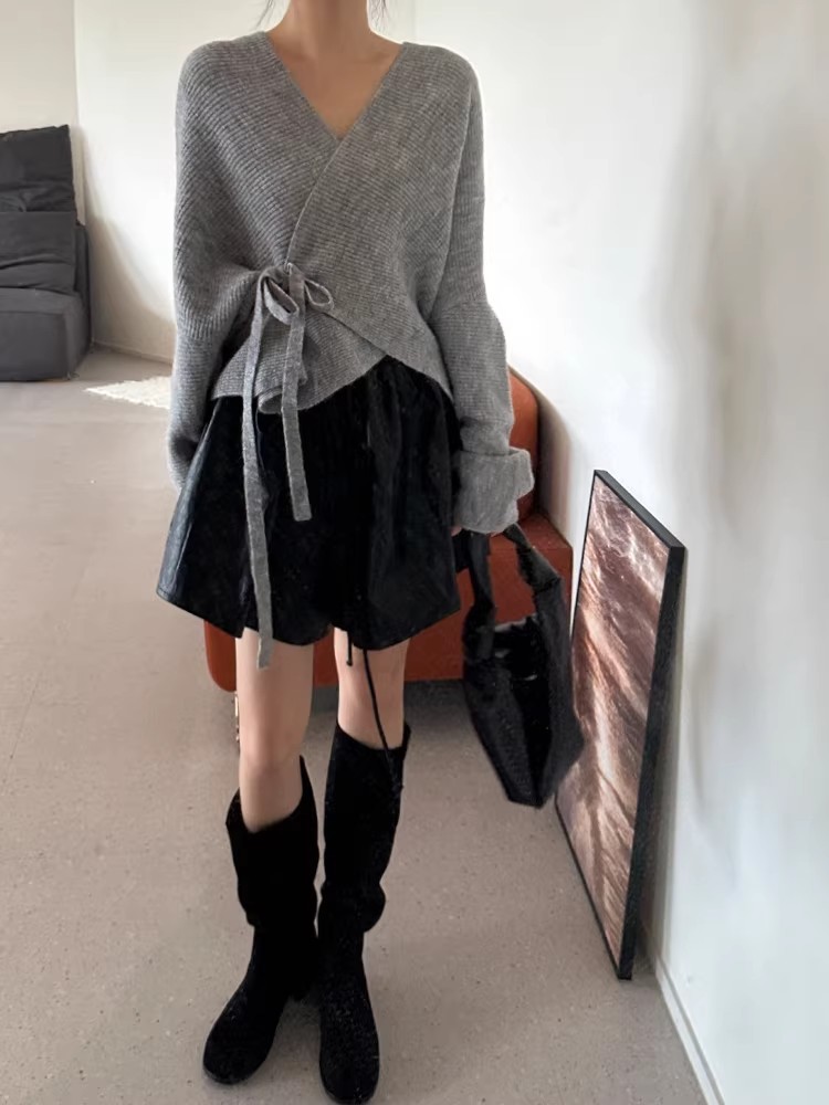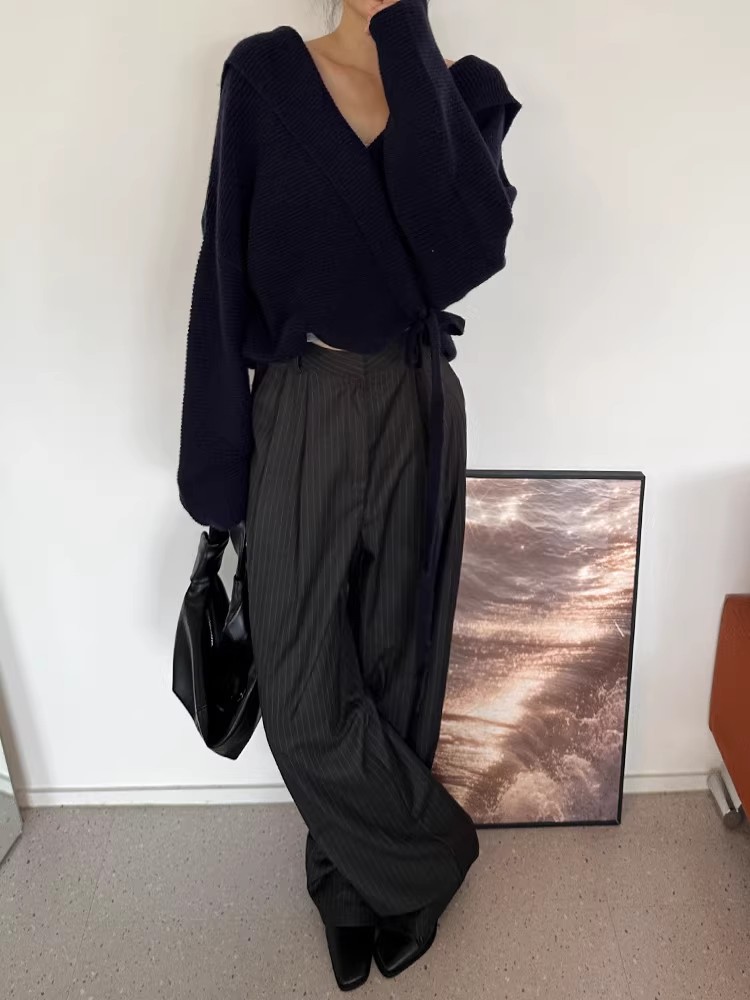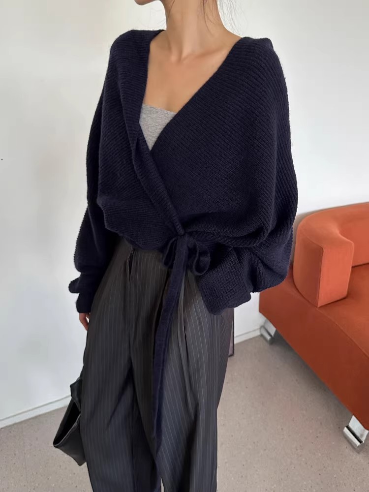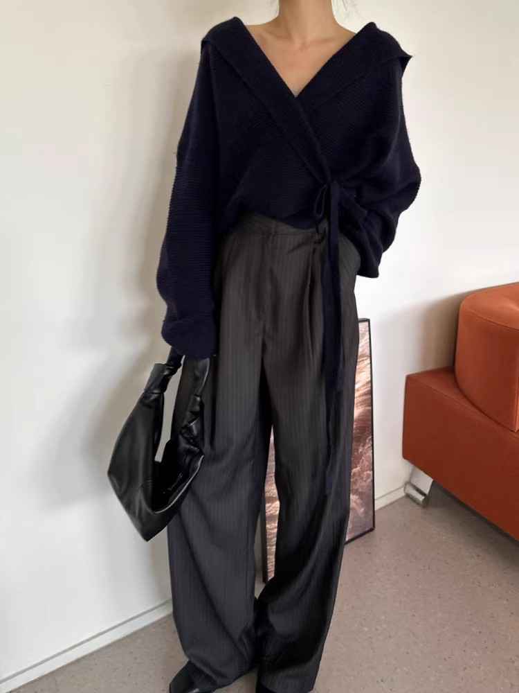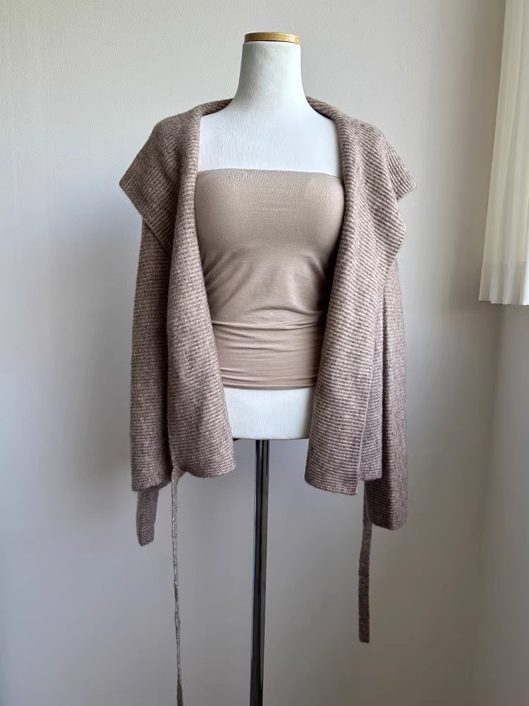한국 세련된 가을과 겨울 빈티지 기질 크로스 v 칼라 후드 레이스 업 디자인 느슨한 올 매치 스웨터 코트 여성