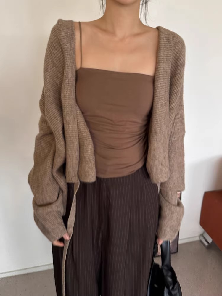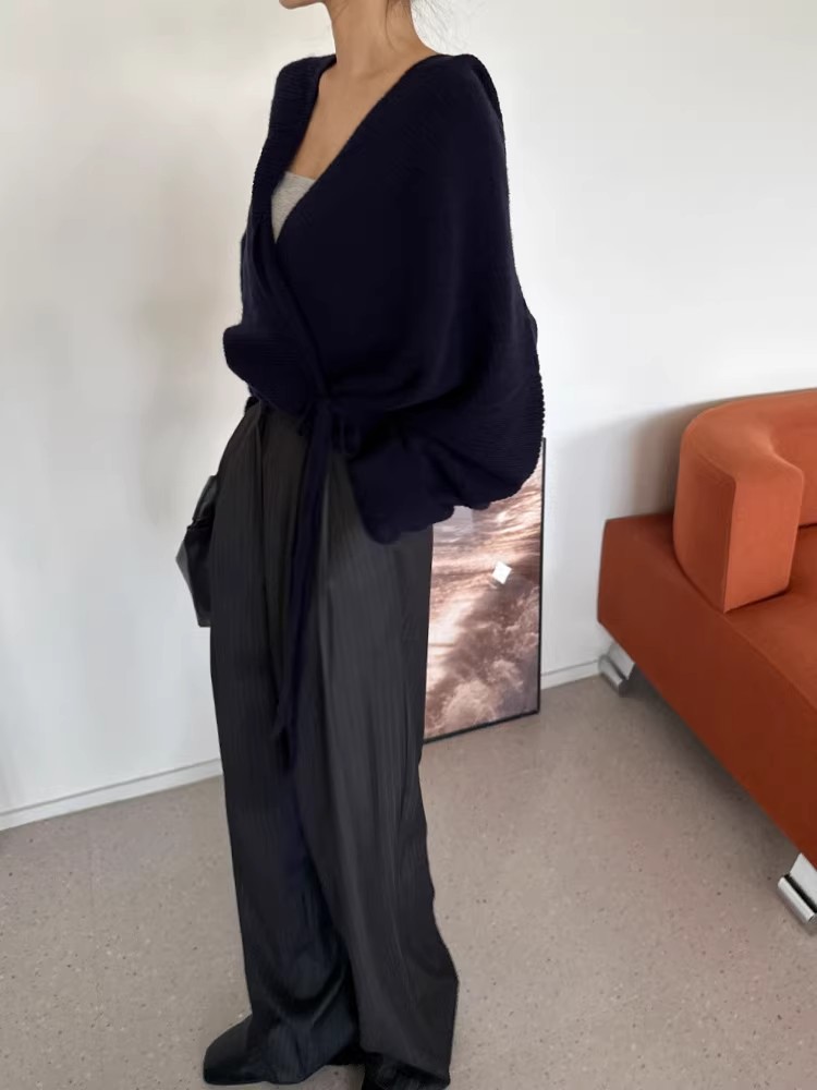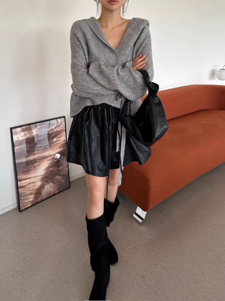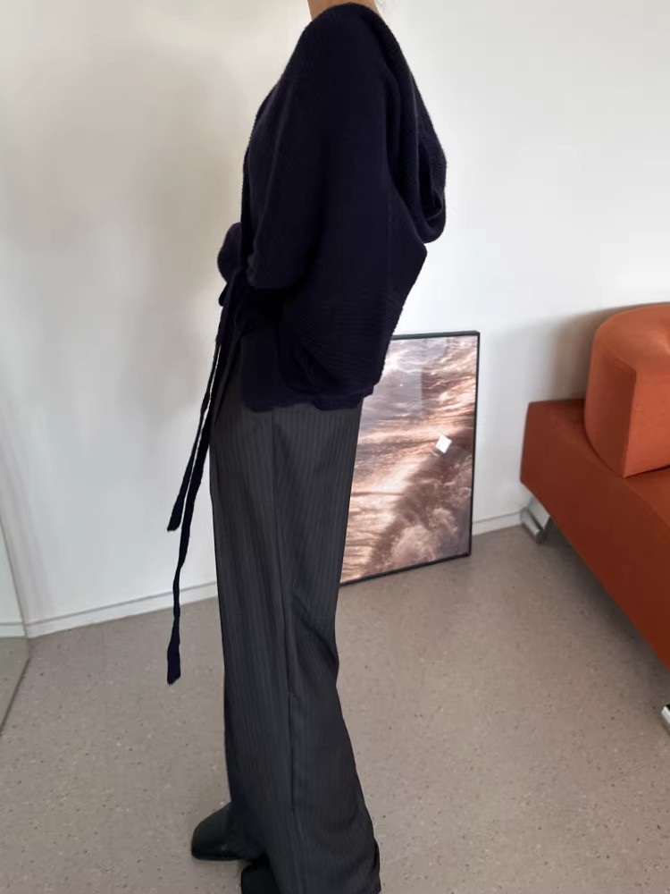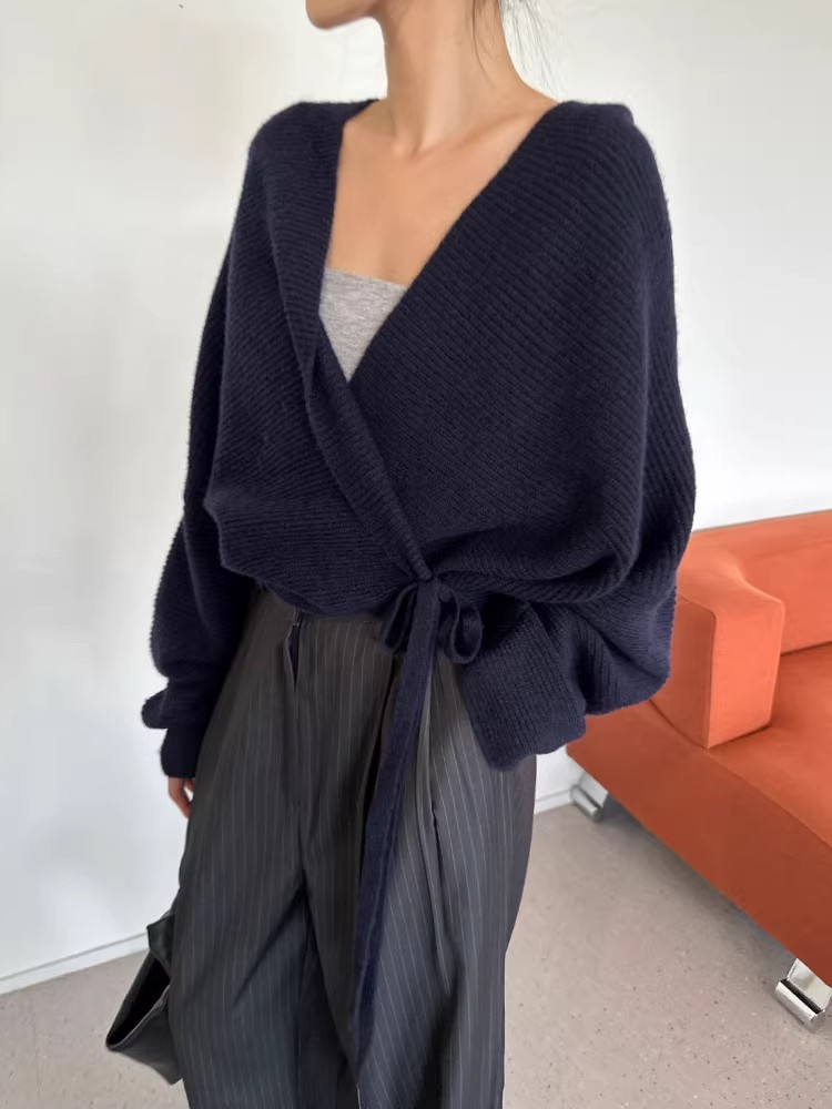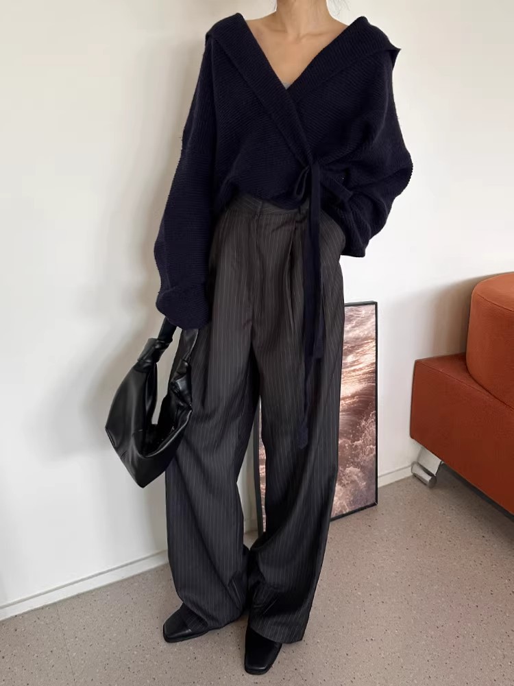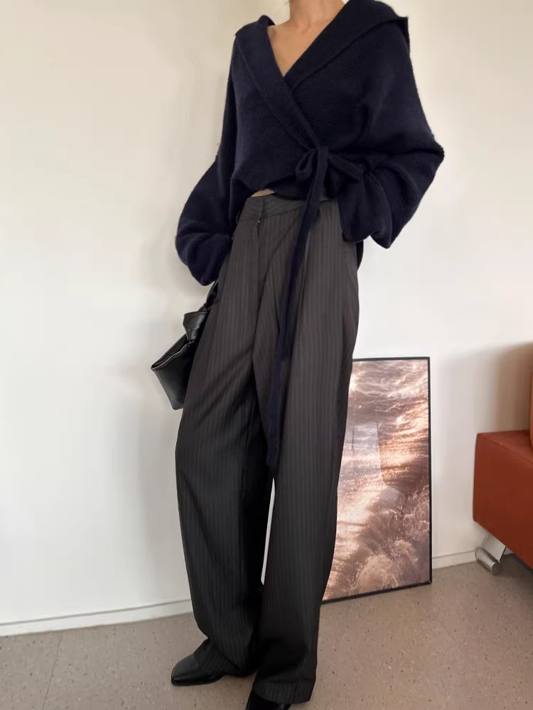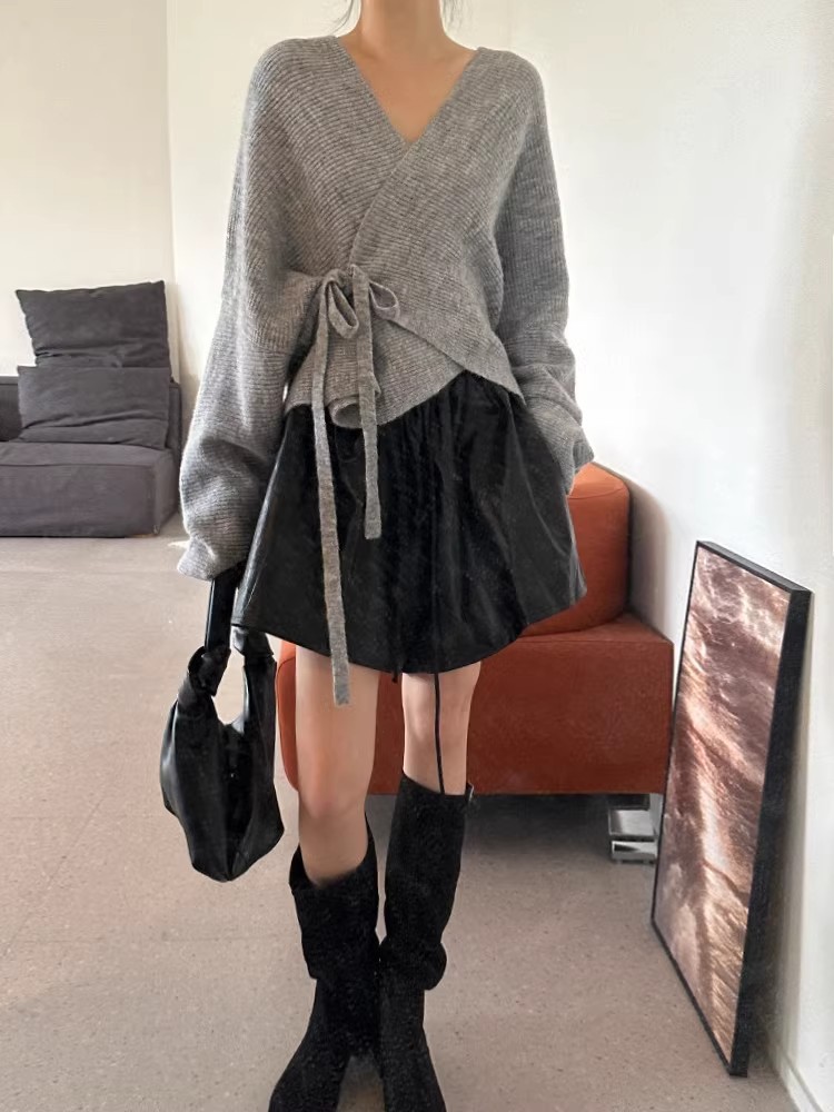 한국 세련된 가을과 겨울 빈티지 기질 크로스 v 칼라 후드 레이스 업 디자인 느슨한 올 매치 스웨터 코트 여성