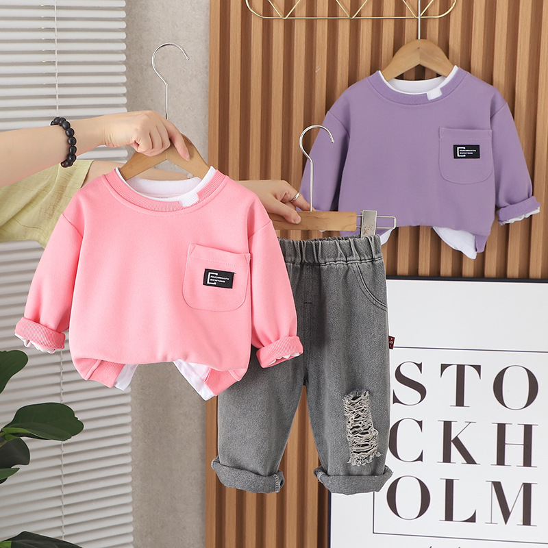 소년 서양식 가을 세트 봄과 가을 새로운 어린이 잘 생긴 더블 레이어 칼라 긴팔 구멍 바지 2 피스 세트스토어 가기