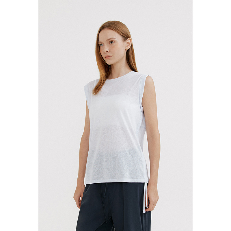 2024 년 여름 새로운 도착 레이스 업 민소매 요가 세트 긴 느슨한 엉덩이 커버 블라우스 마이크로 투명 순수한 욕망 스웨트 셔츠