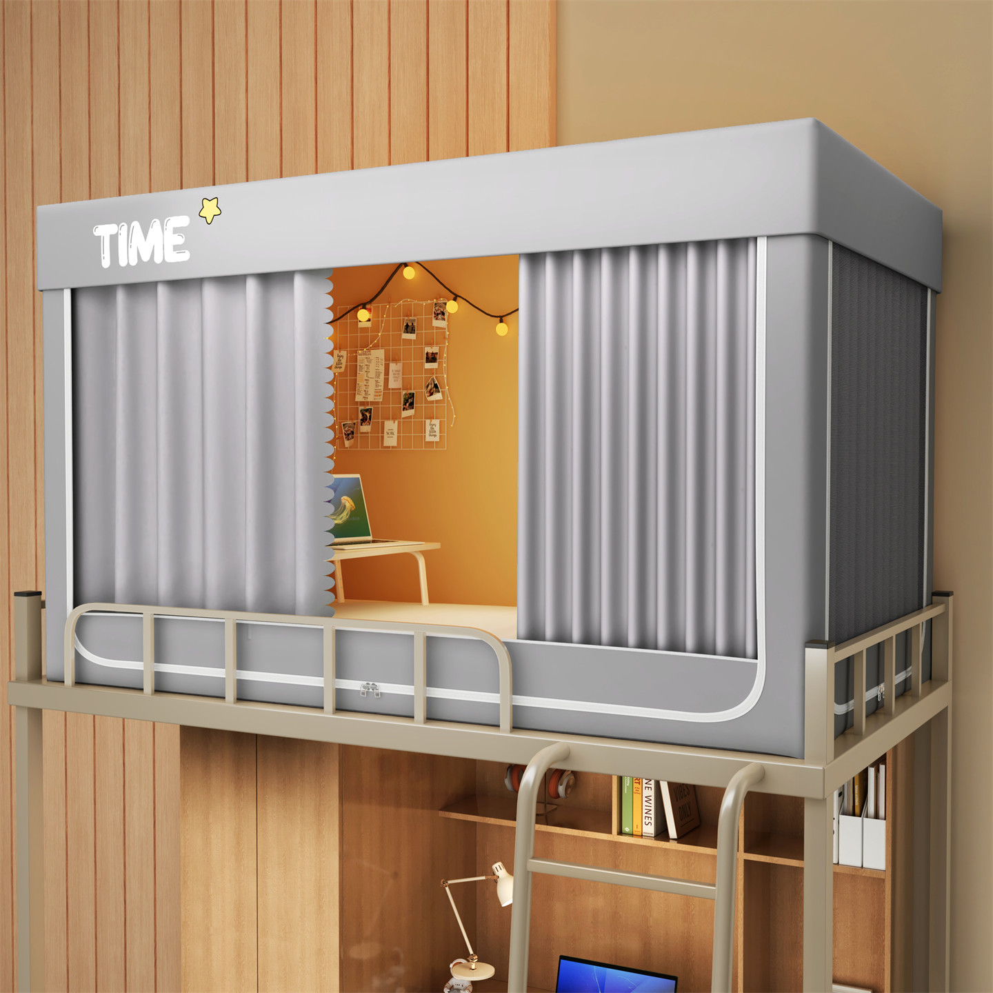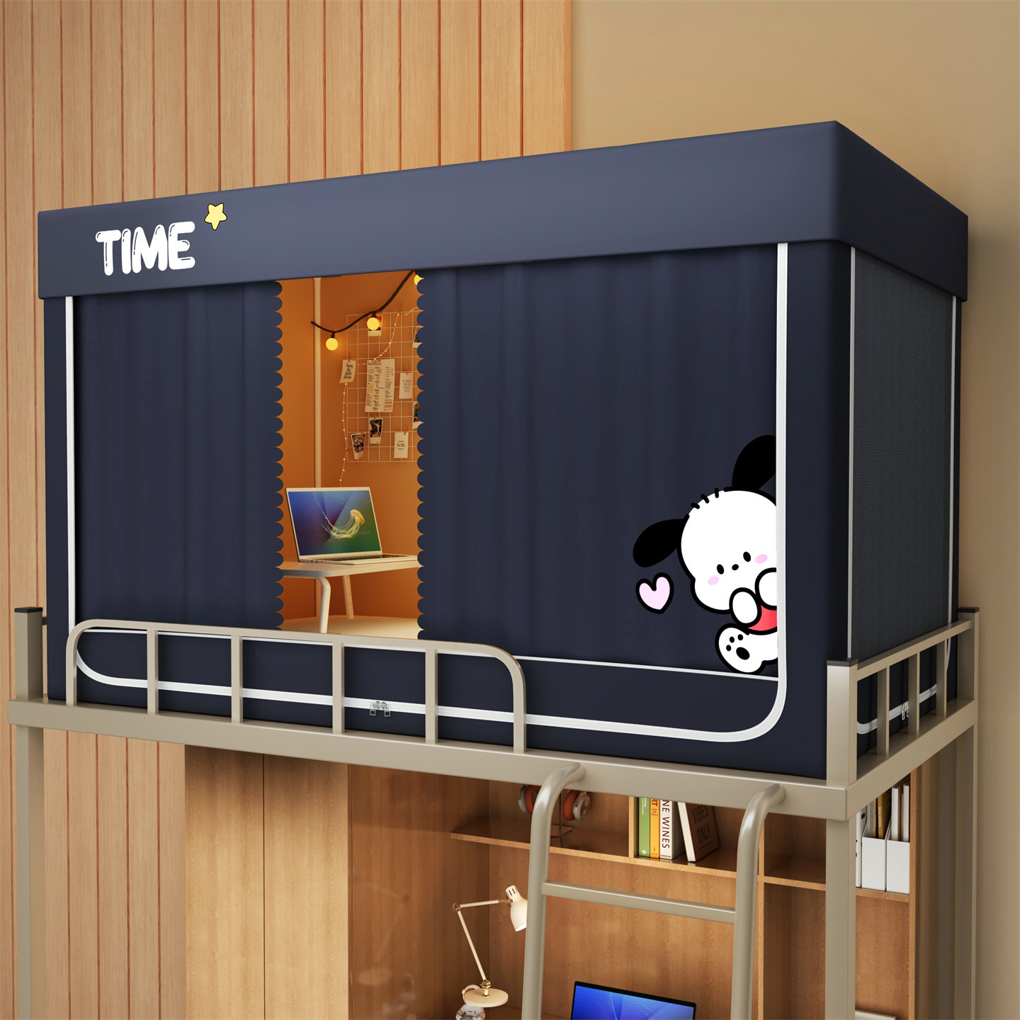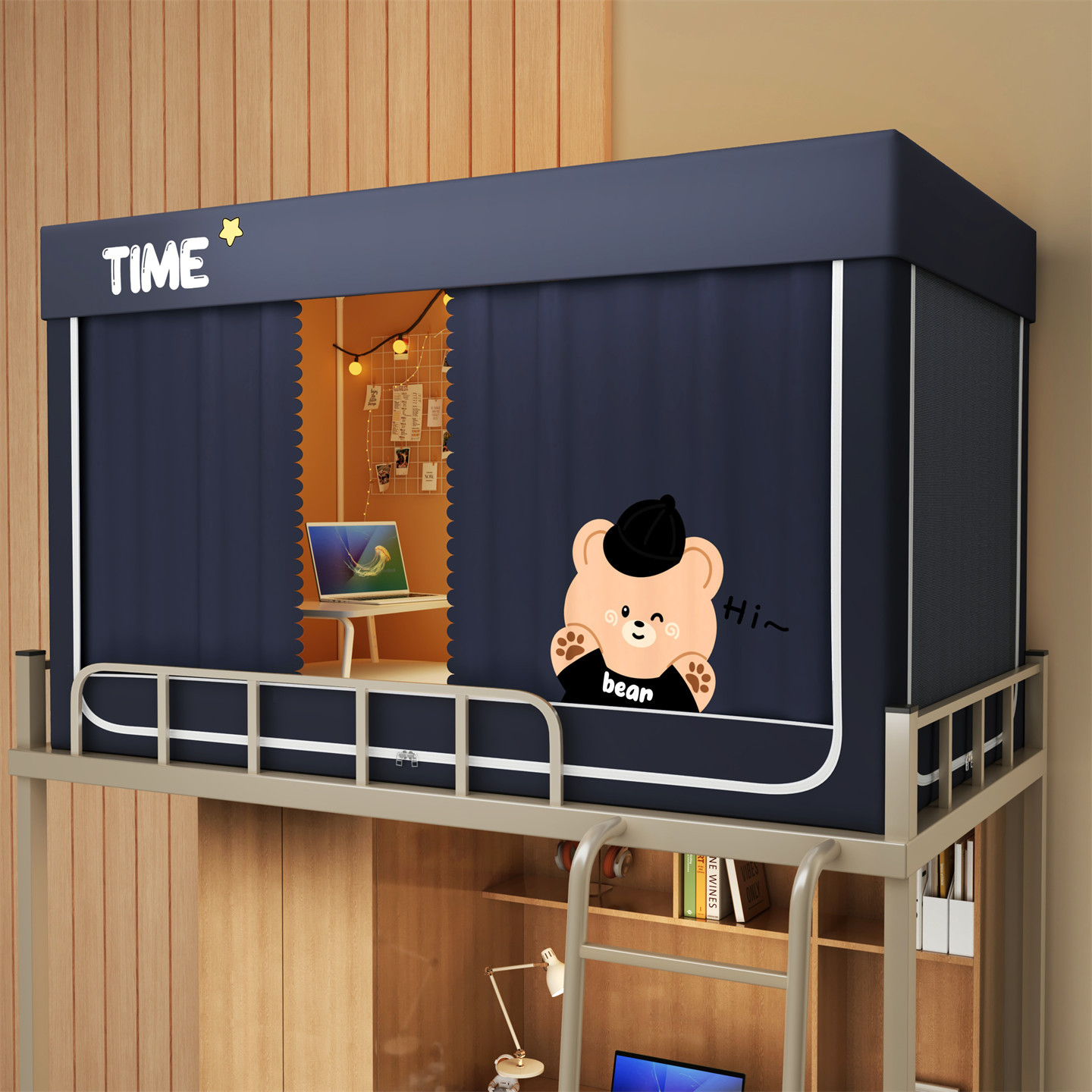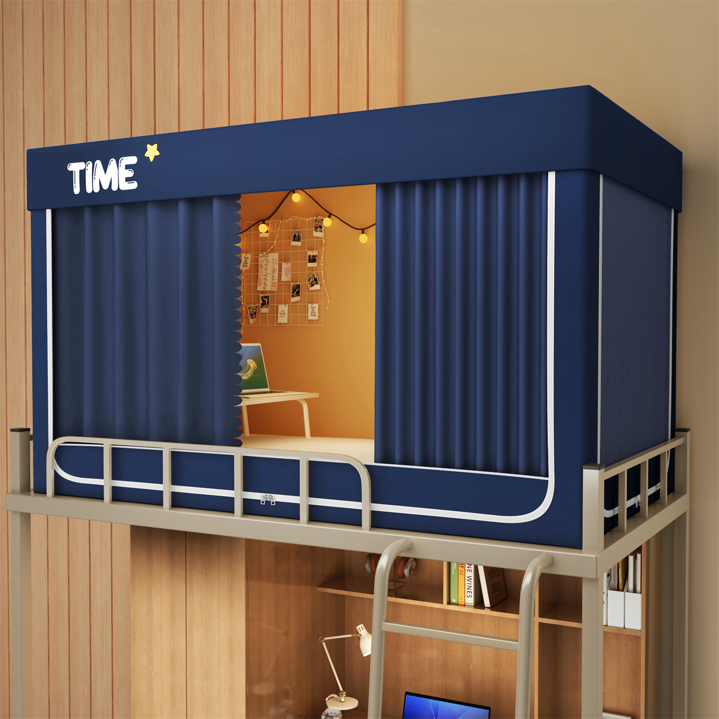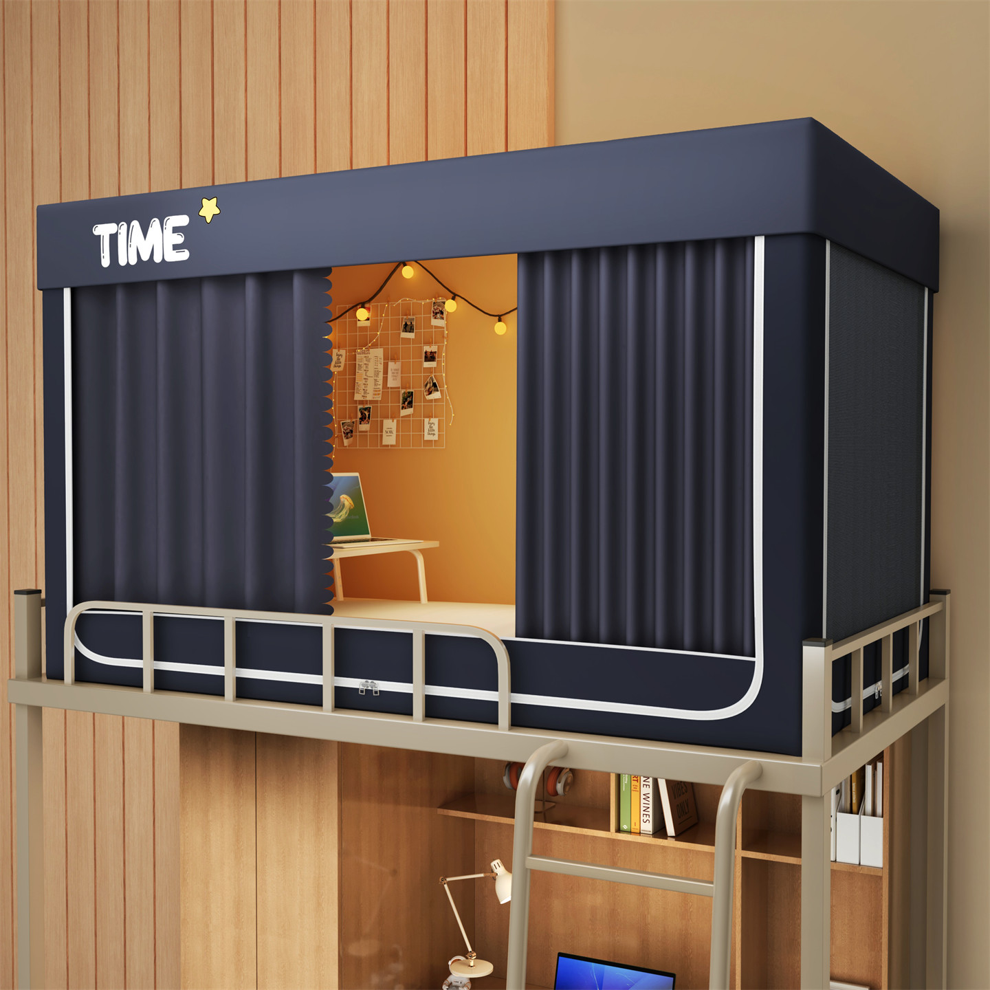 • 하단 침대 90cm 폭 * 190cm 길이 * 90cm 높이 [5면 암막, 자체 연결 지지대] 벽면 커튼