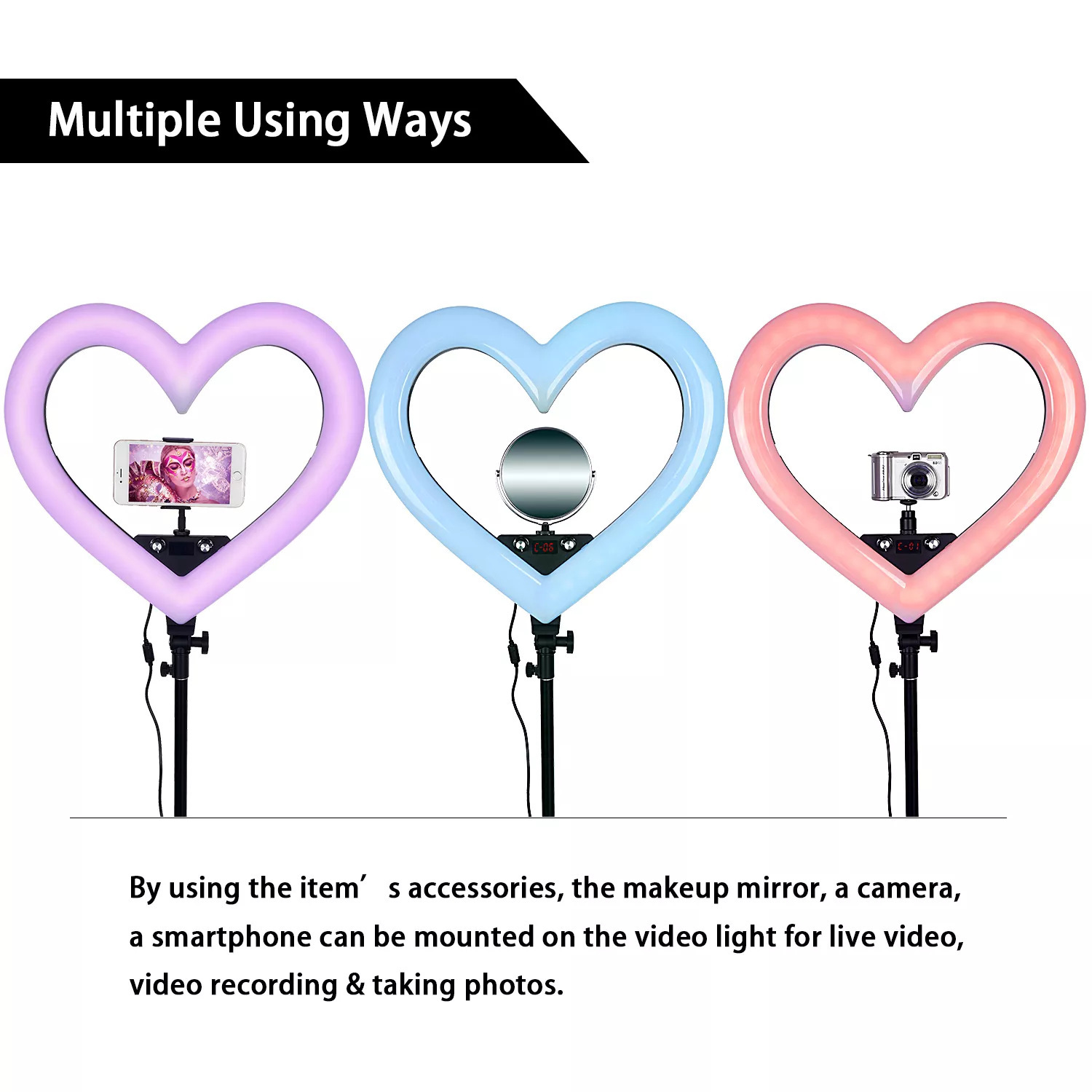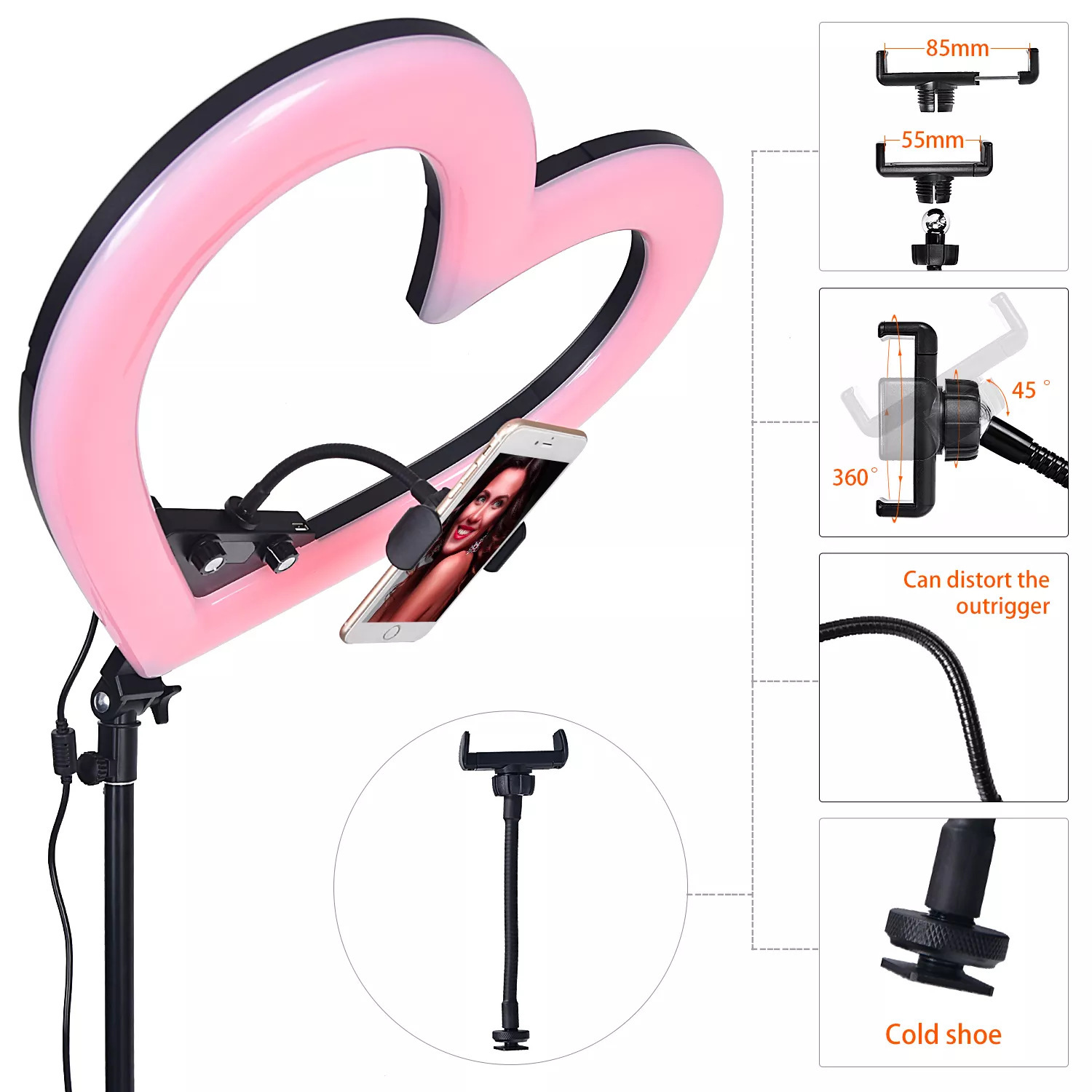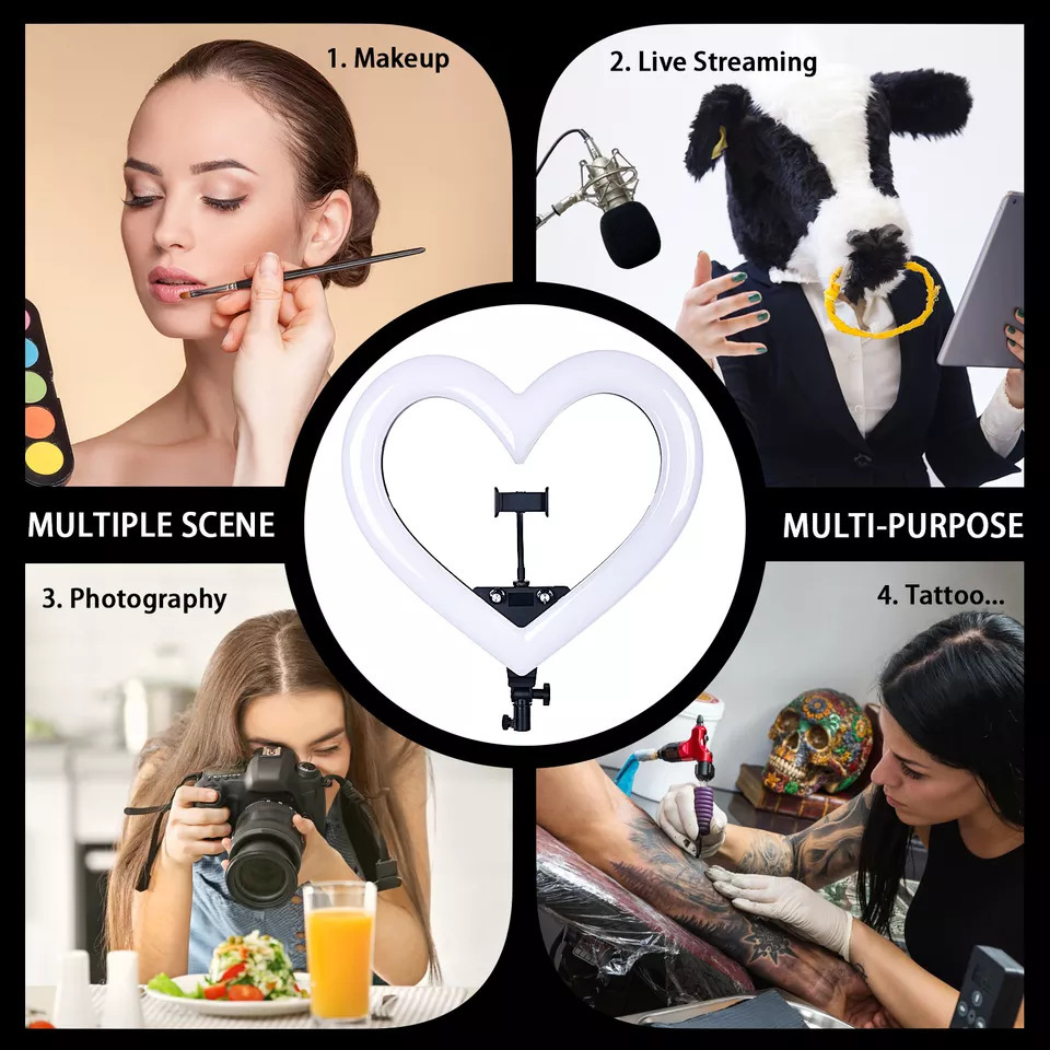 19 인치 RGB 7 색 하트 모양의 라이브 라이트 앵커 뷰티 부드러운 피부 그물 레드 플로어 램프 링 LED 사진 램프