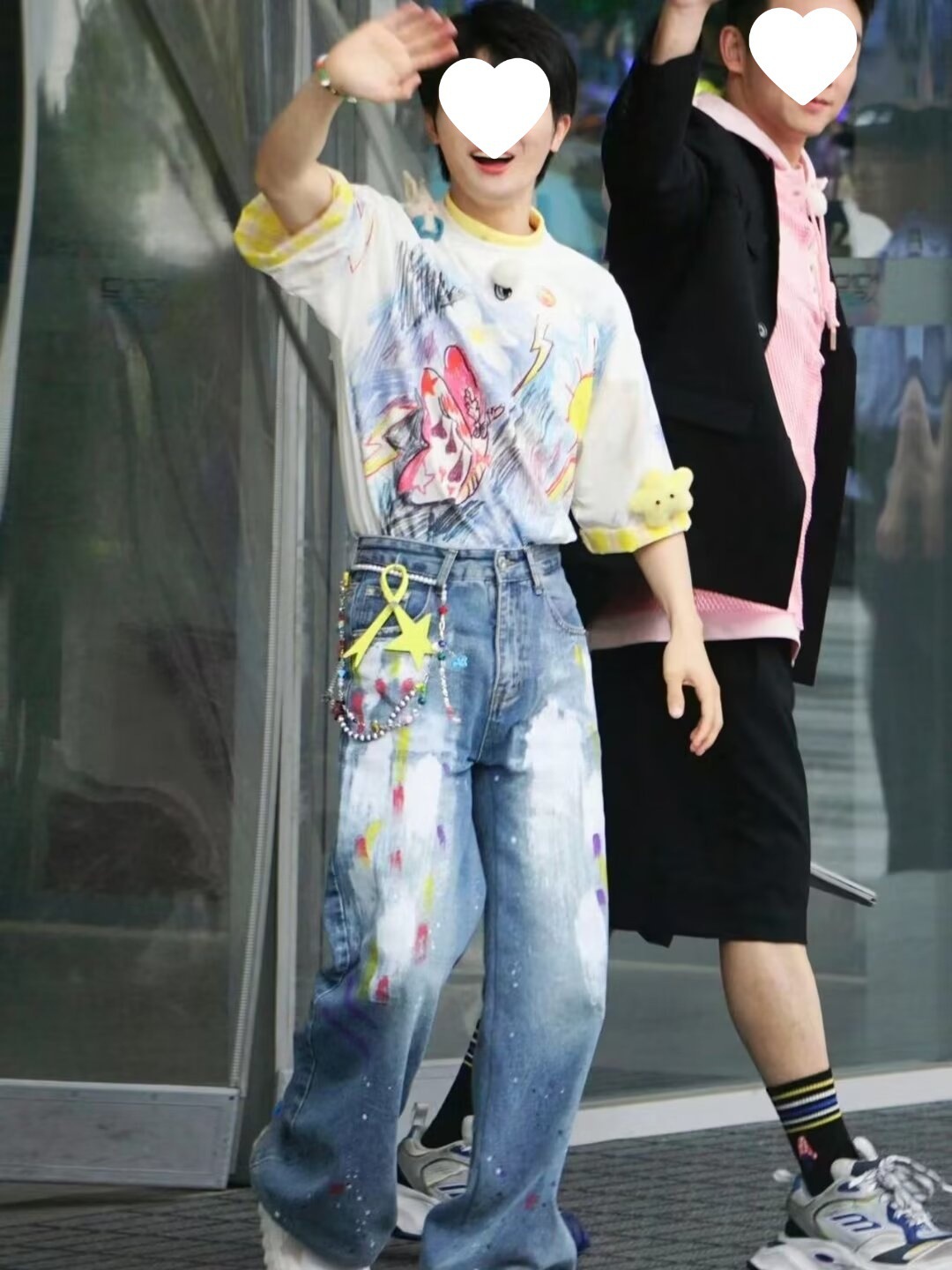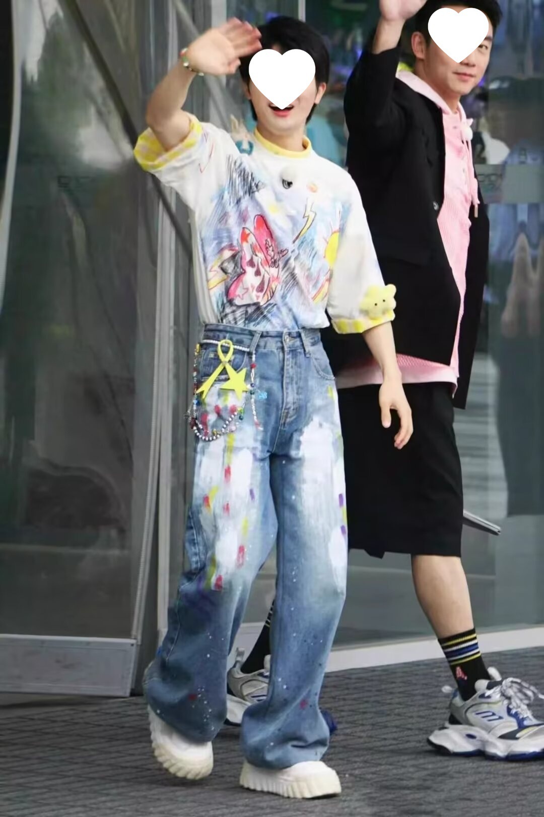 여름 새로운 낙서 페인트 점 디자인 센스 청바지 커플 같은 스타일 스트레이트 캐주얼 올 매치 와이드 다리 바지스토어 가기