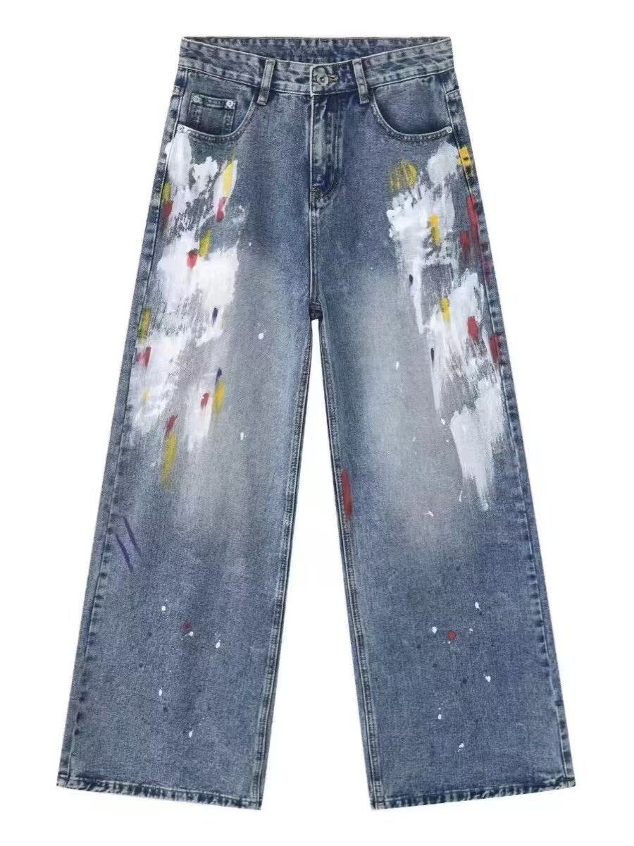 여름 새로운 낙서 페인트 점 디자인 센스 청바지 커플 같은 스타일 스트레이트 캐주얼 올 매치 와이드 다리 바지