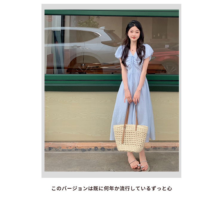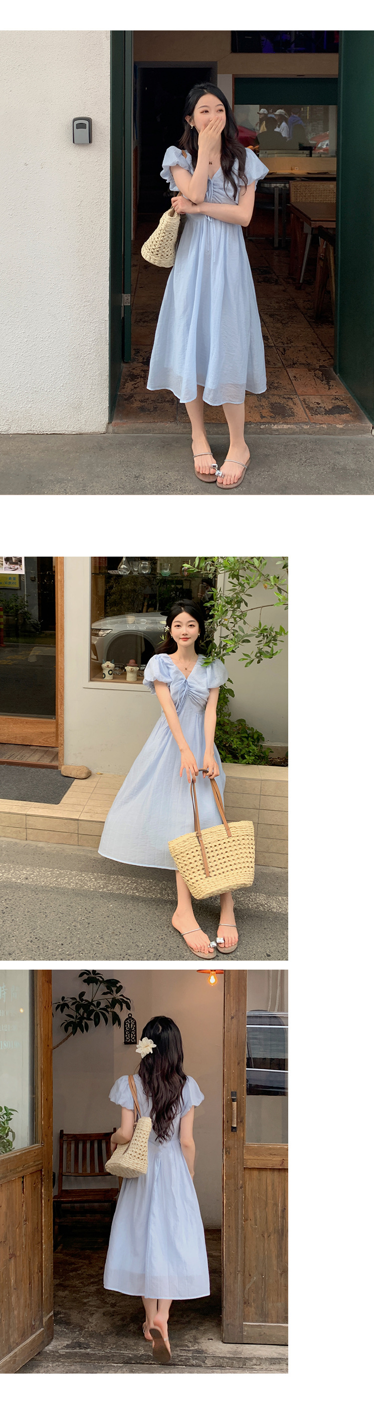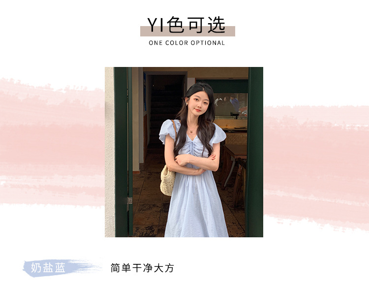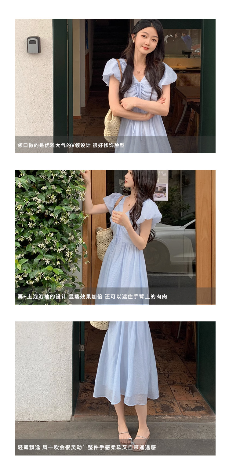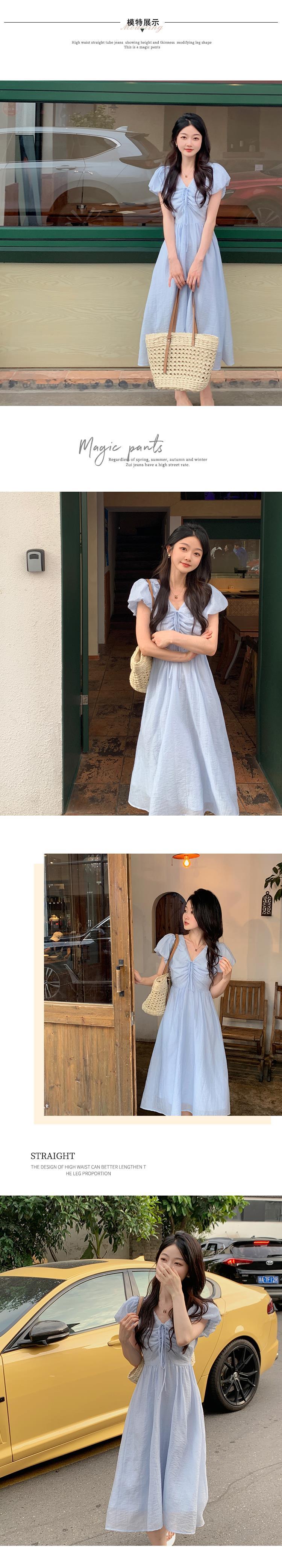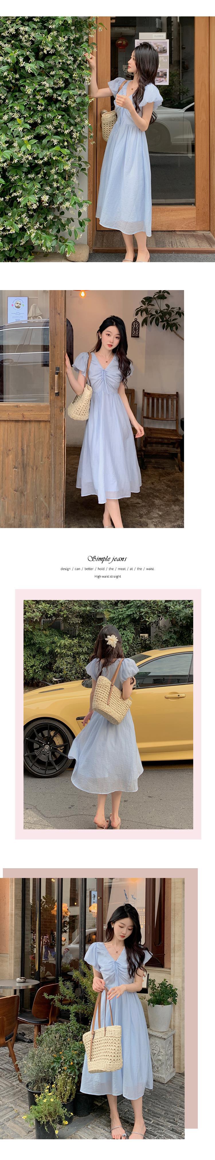 한국 세련된 여름 프랑스 스타일 부드러운 우아한 드로스트링 V 넥 버블 짧은 소매 높은 허리 큰 스윙 요정 원피스스토어 가기