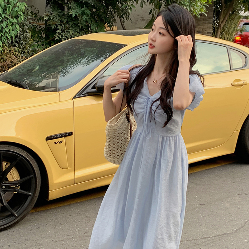 한국 세련된 여름 프랑스 스타일 부드러운 우아한 드로스트링 V 넥 버블 짧은 소매 높은 허리 큰 스윙 요정 원피스